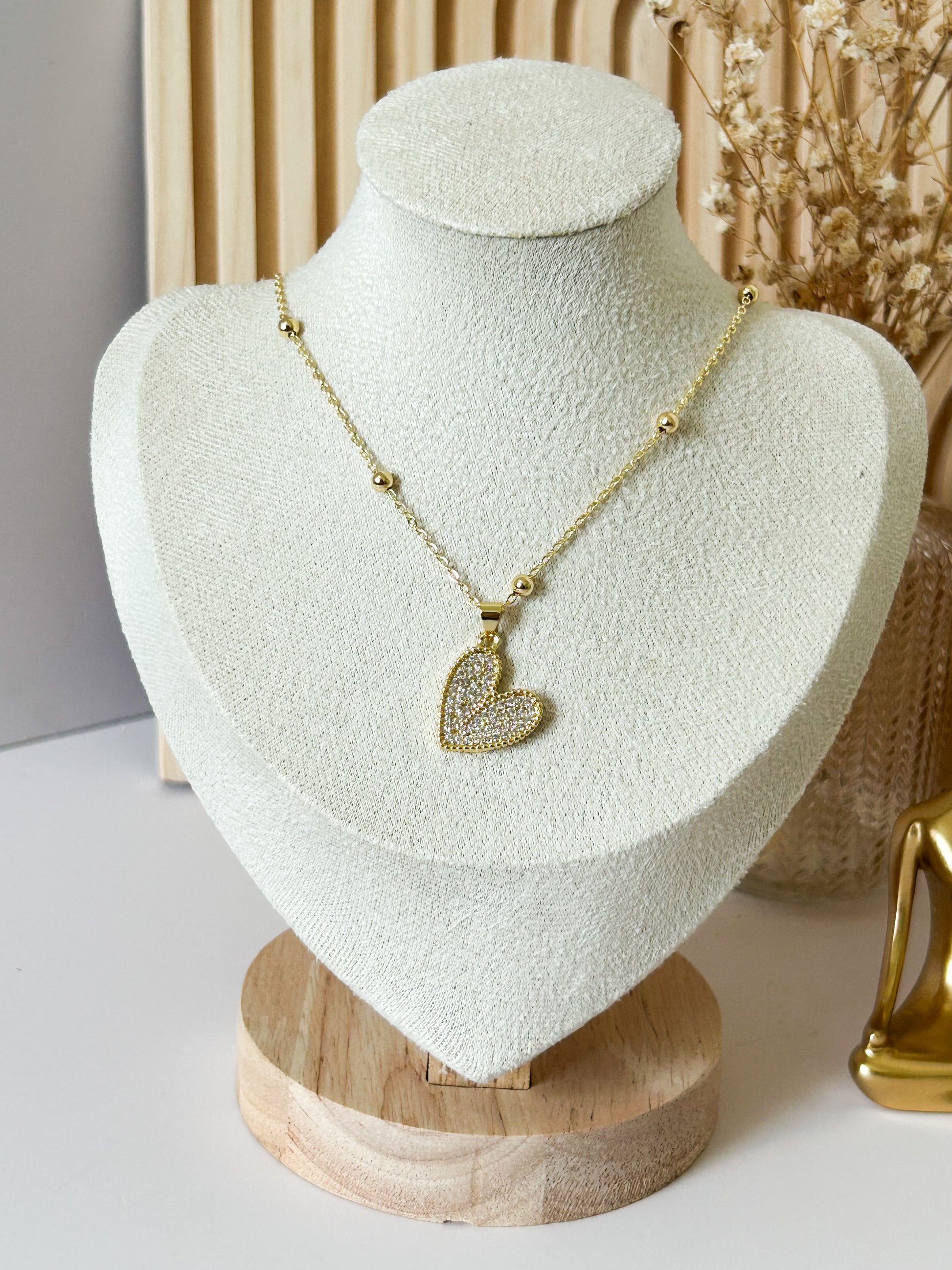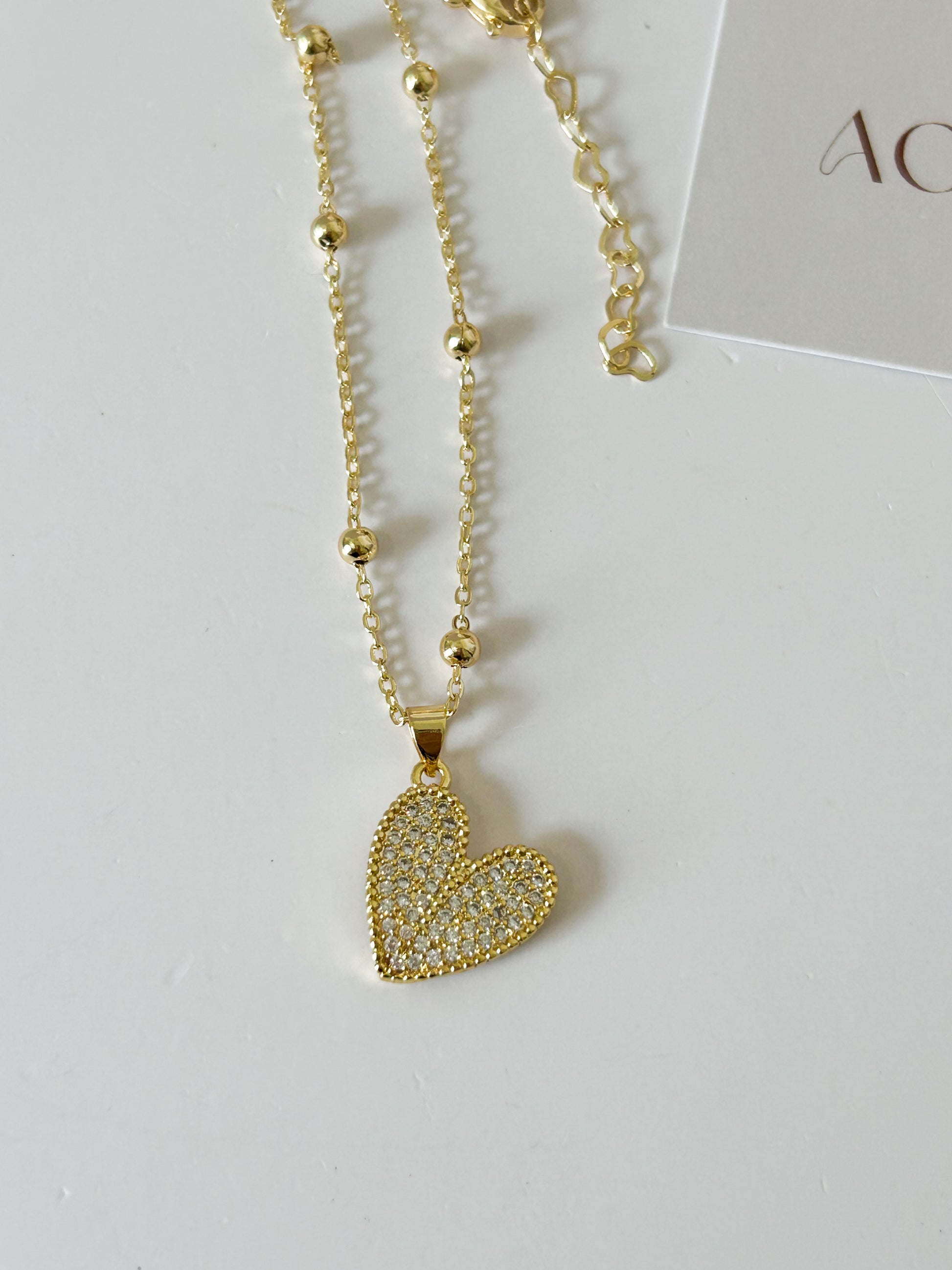 The Aurora Heart Necklace radiates pure elegance with its sparkling pavé heart pendant and delicate gold-plated beaded chain. Designed to symbolize love, light, and timeless beauty, this necklace is the perfect piece to elevate any look.