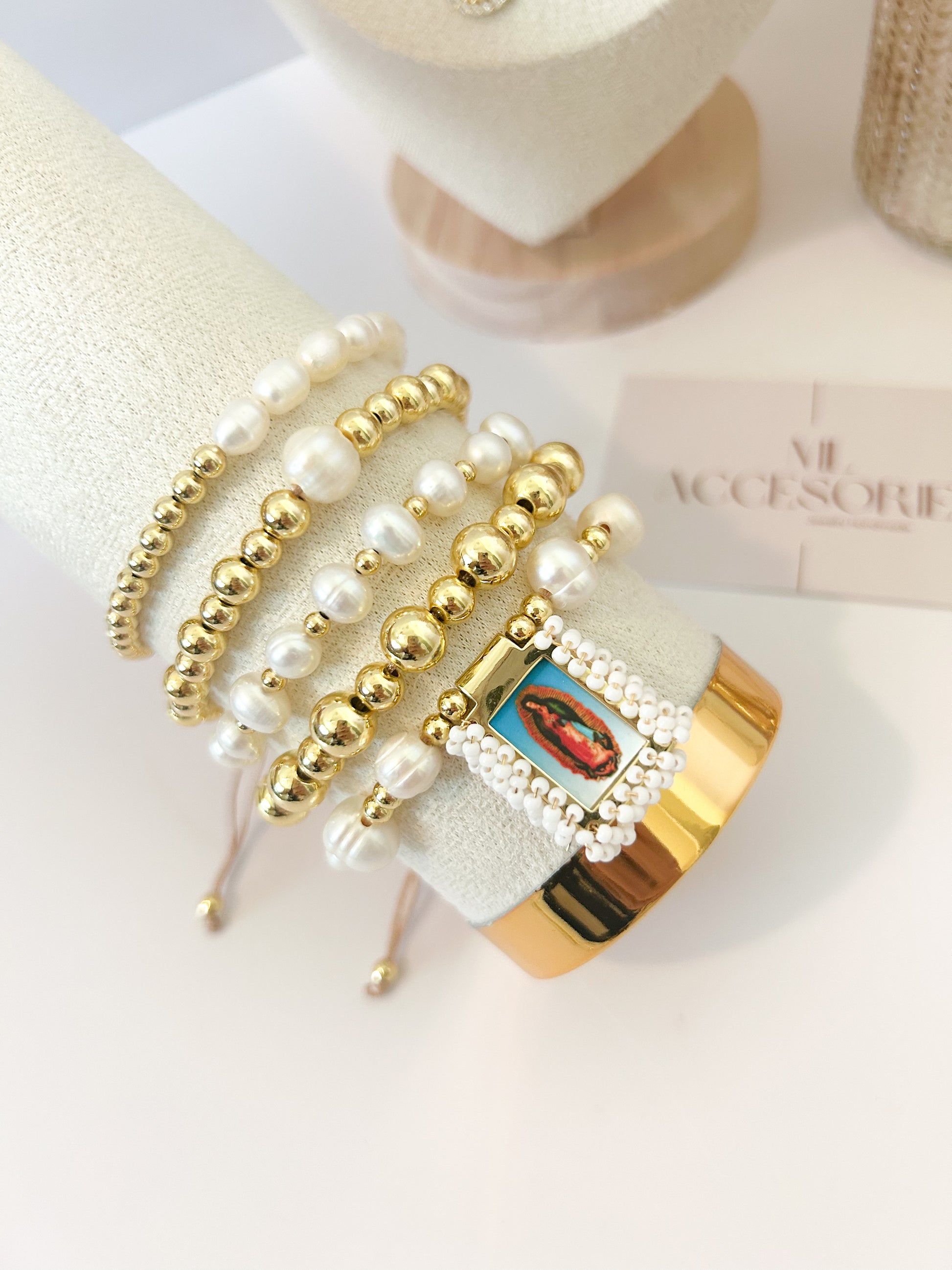 A Divinidad set inspired by faith, purity, and love. Featuring glossy pearls, gold hearts, and a central charm of Our Lady of Guadalupe surrounded by delicate seed beads, this set is a meaningful piece for those who carry faith close to their heart.