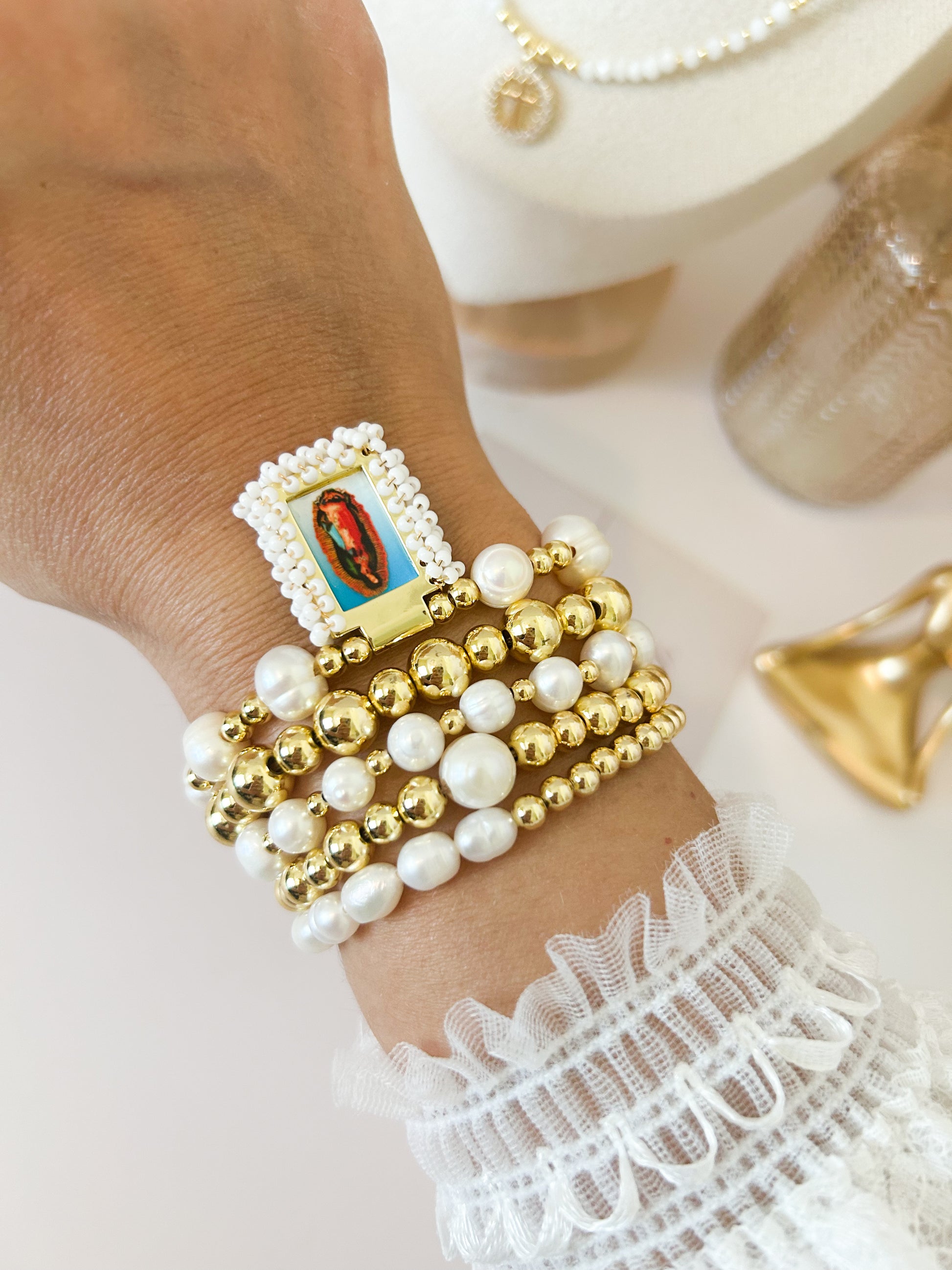 - Details: Freshwater pearls, white enamel heart beads, gold heart accents, and Our Lady of Guadalupe charm bordered with white seed beads