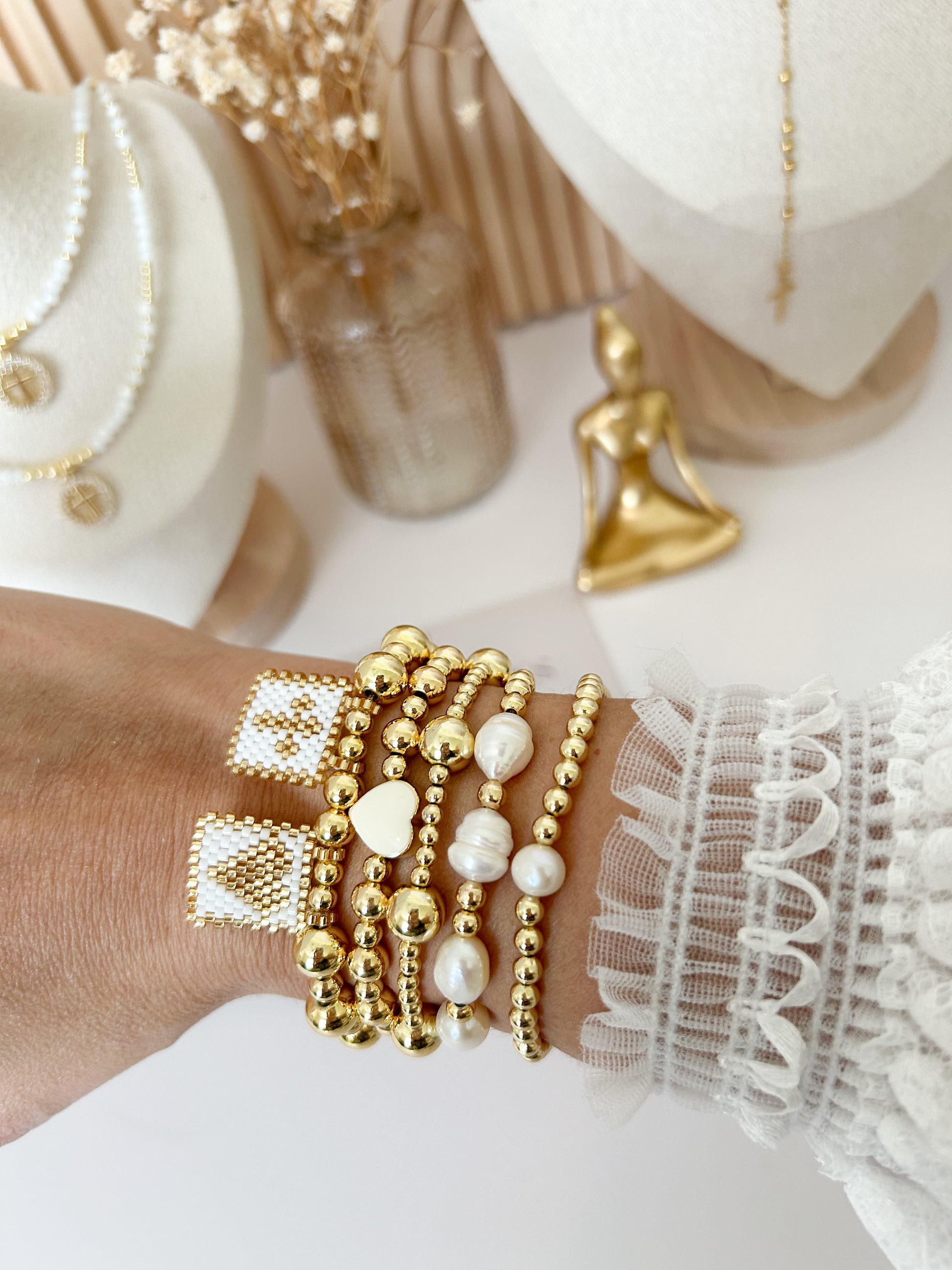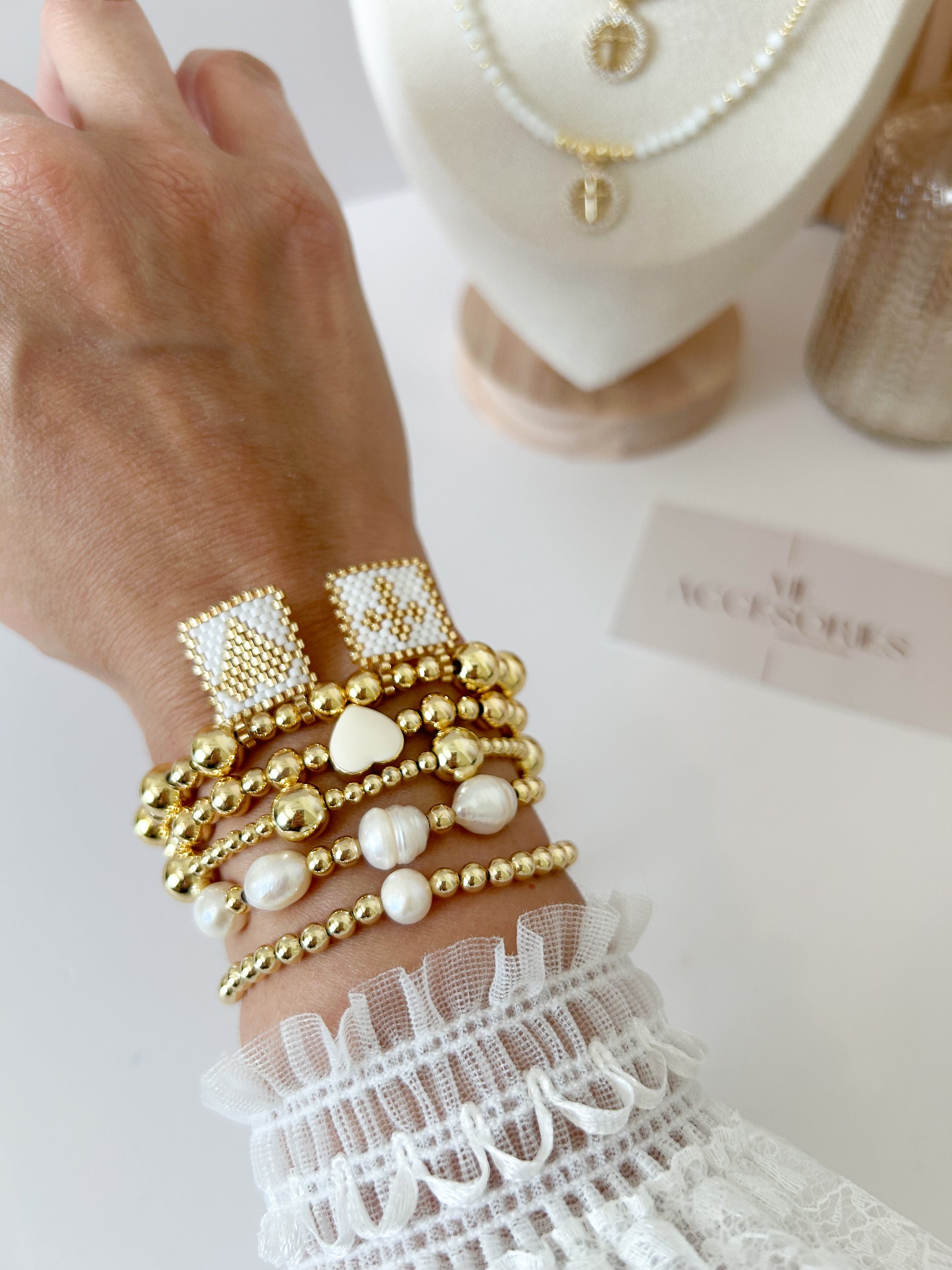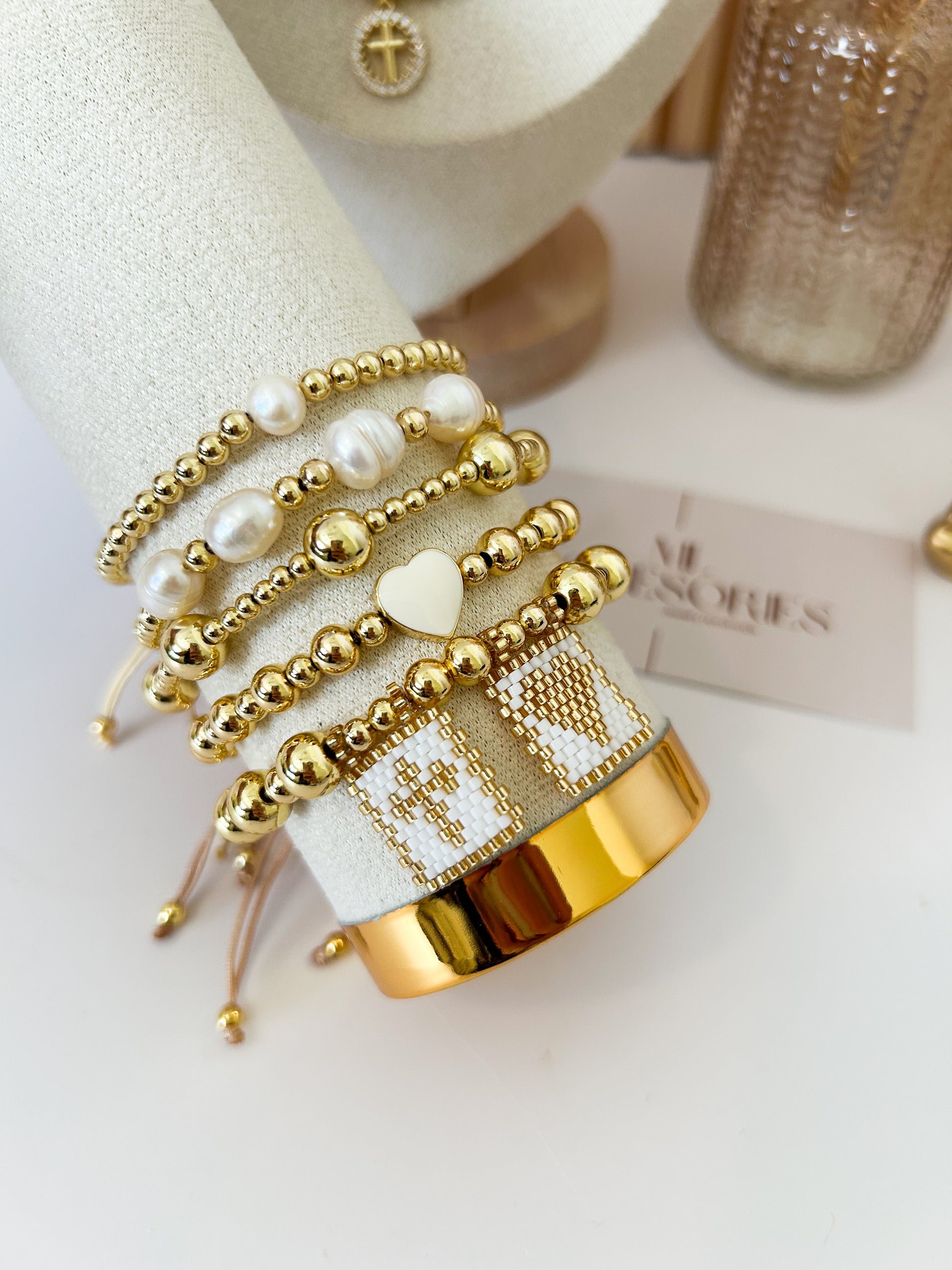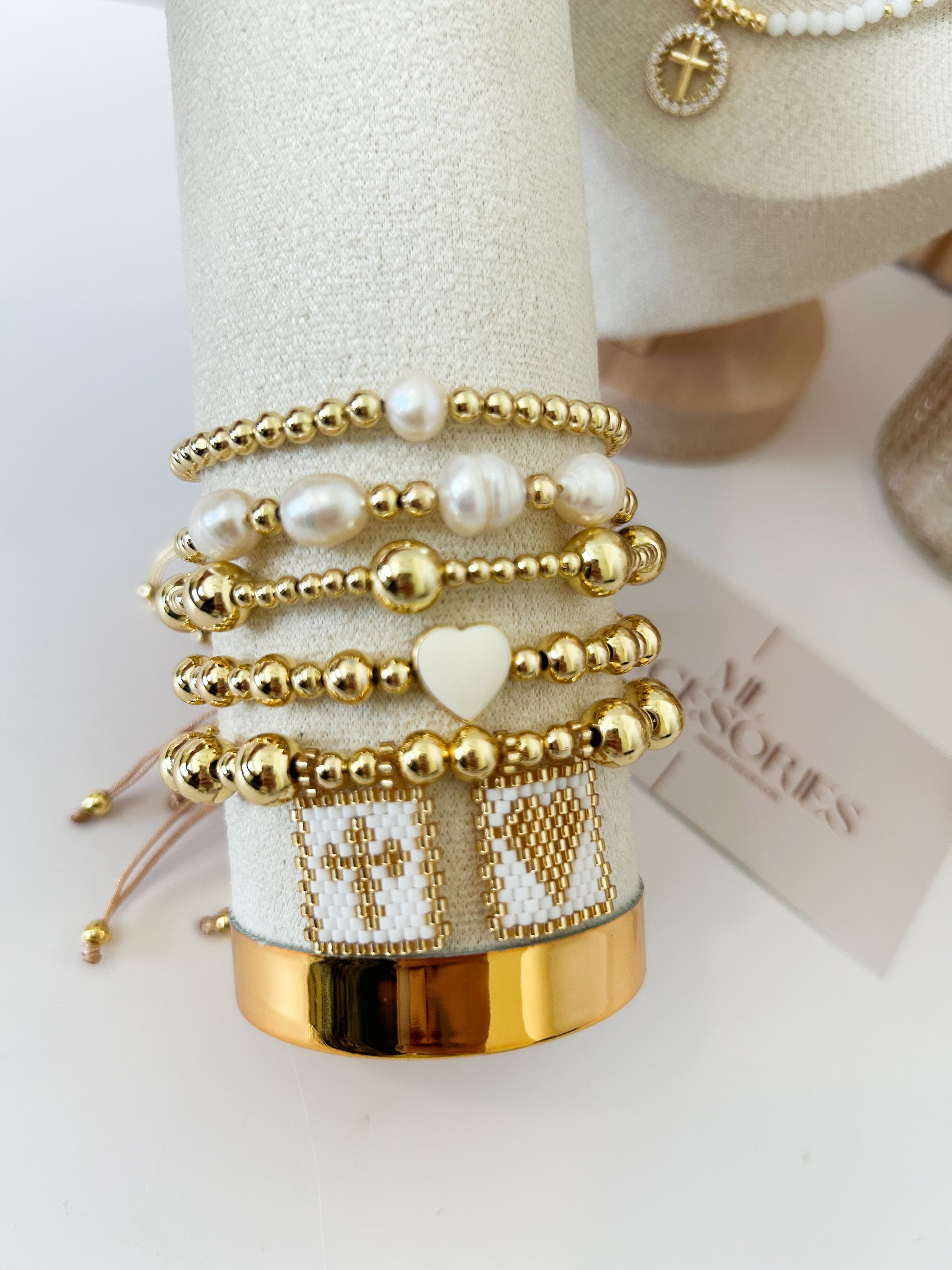 - Details: Freshwater pearls, white enamel heart bead, gold round beads, white and gold beaded charms with heart and cross designs