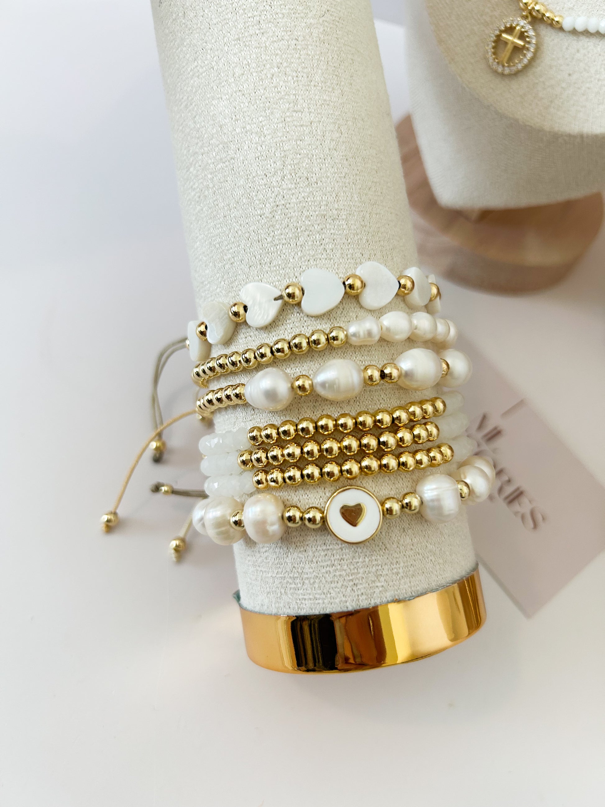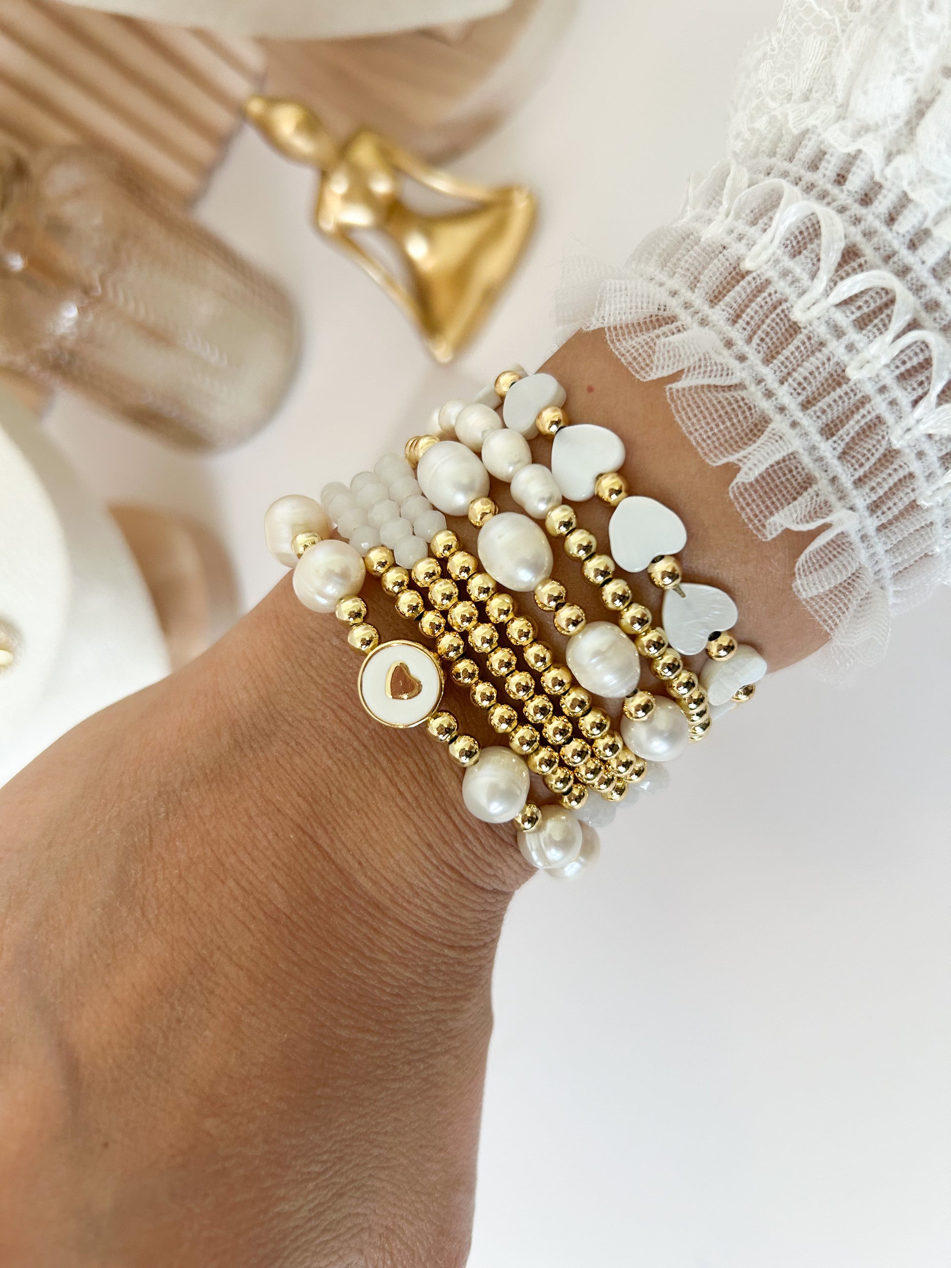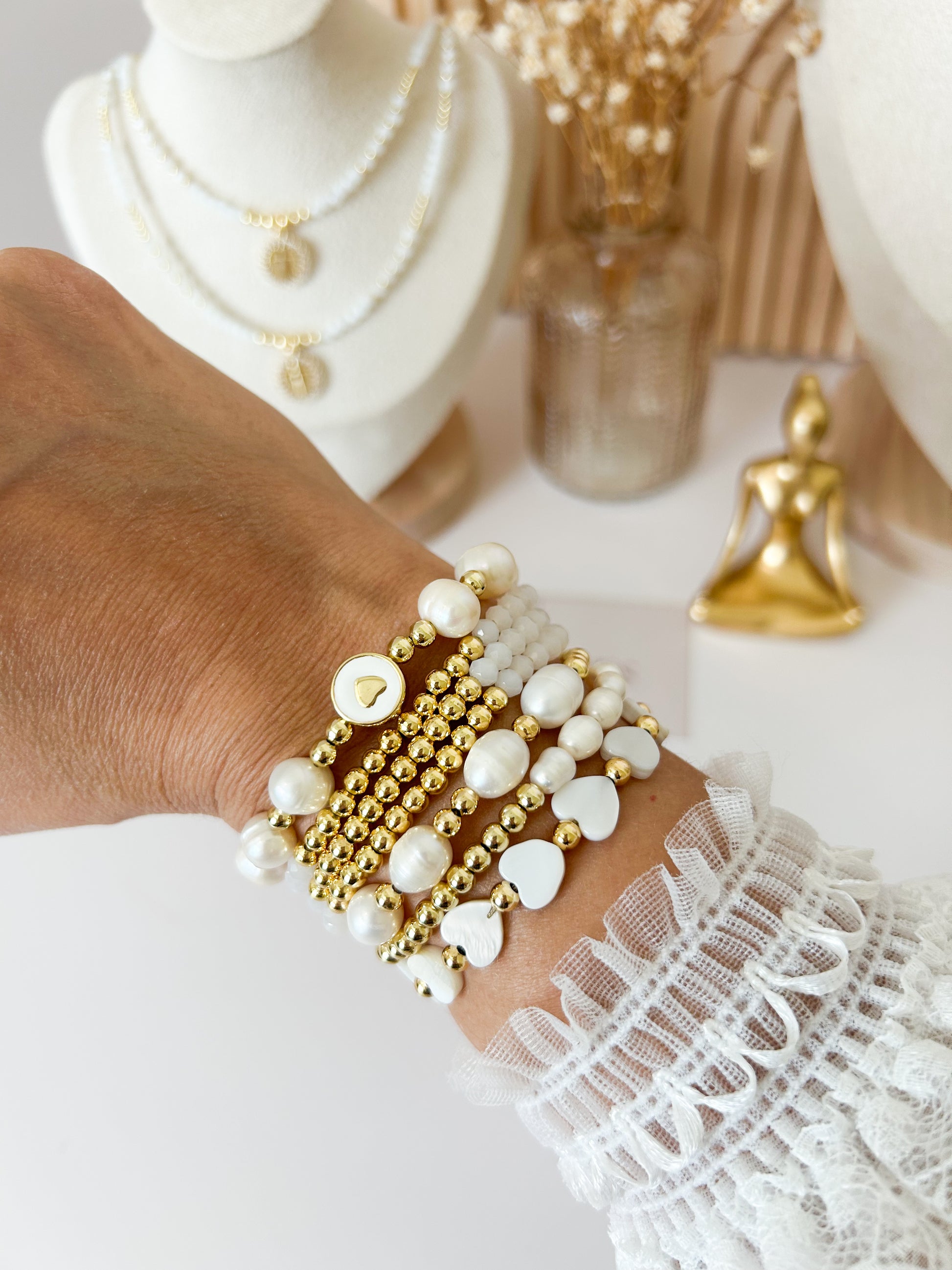 Love is a delicate and luminous bracelet stack that captures the essence of elegance and tenderness. With heart-shaped charms, glowing freshwater pearls, and golden accents, this 5-bracelet set is perfect for those who adore subtle beauty with a touch of romance. Whether worn for a special occasion or every day, it brings grace and warmth to any look.