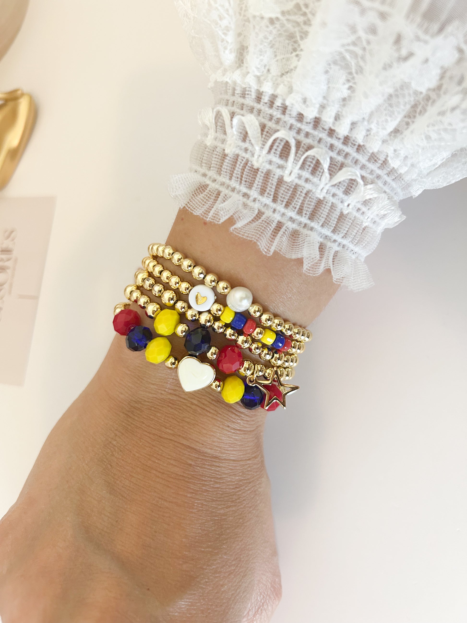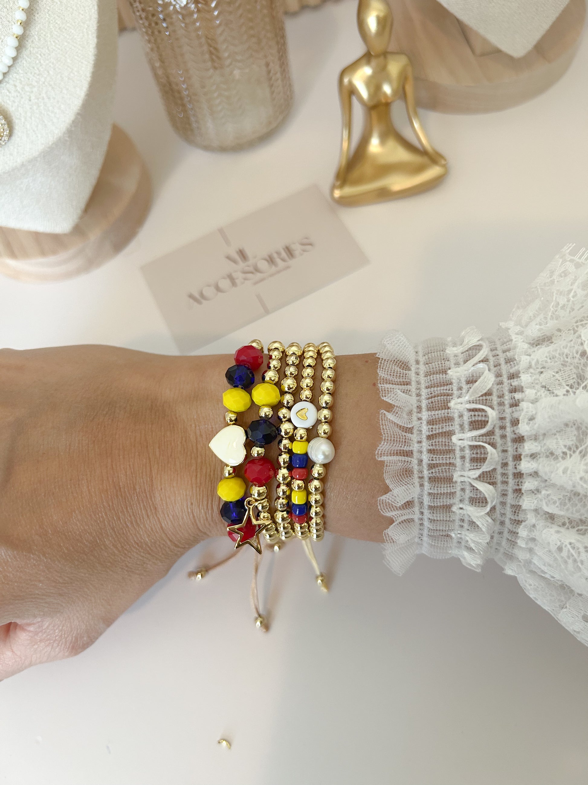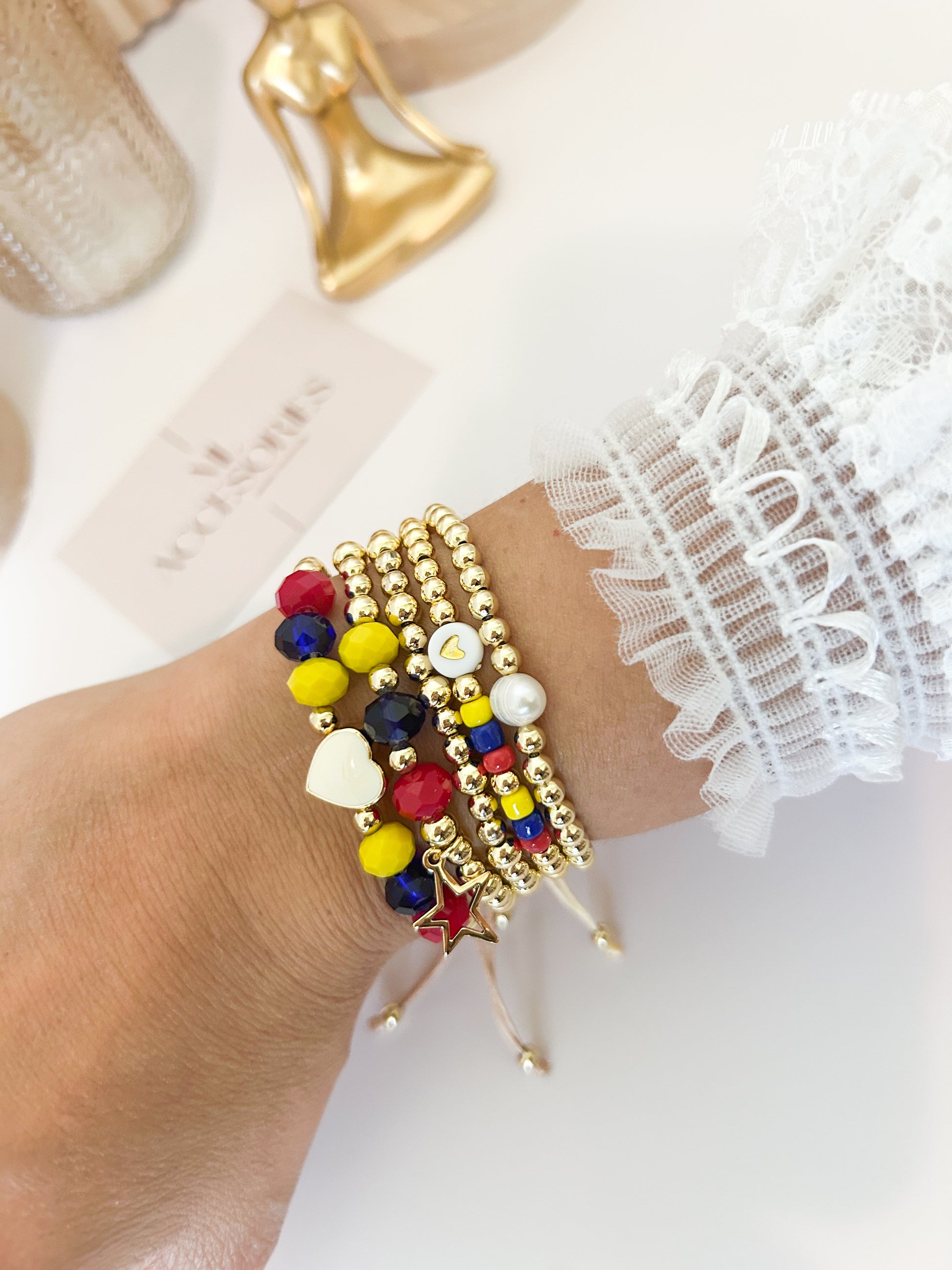 Celebrate your Venezuelan pride with Tricolor — a joyful set of 5 adjustable bracelets inspired by the vibrant colors of the national flag. Featuring red, yellow, and blue beads alongside golden hearts and stars, this set is a beautiful reminder of your roots, your love, and your light. Wear your country with pride and let every color tell your story.