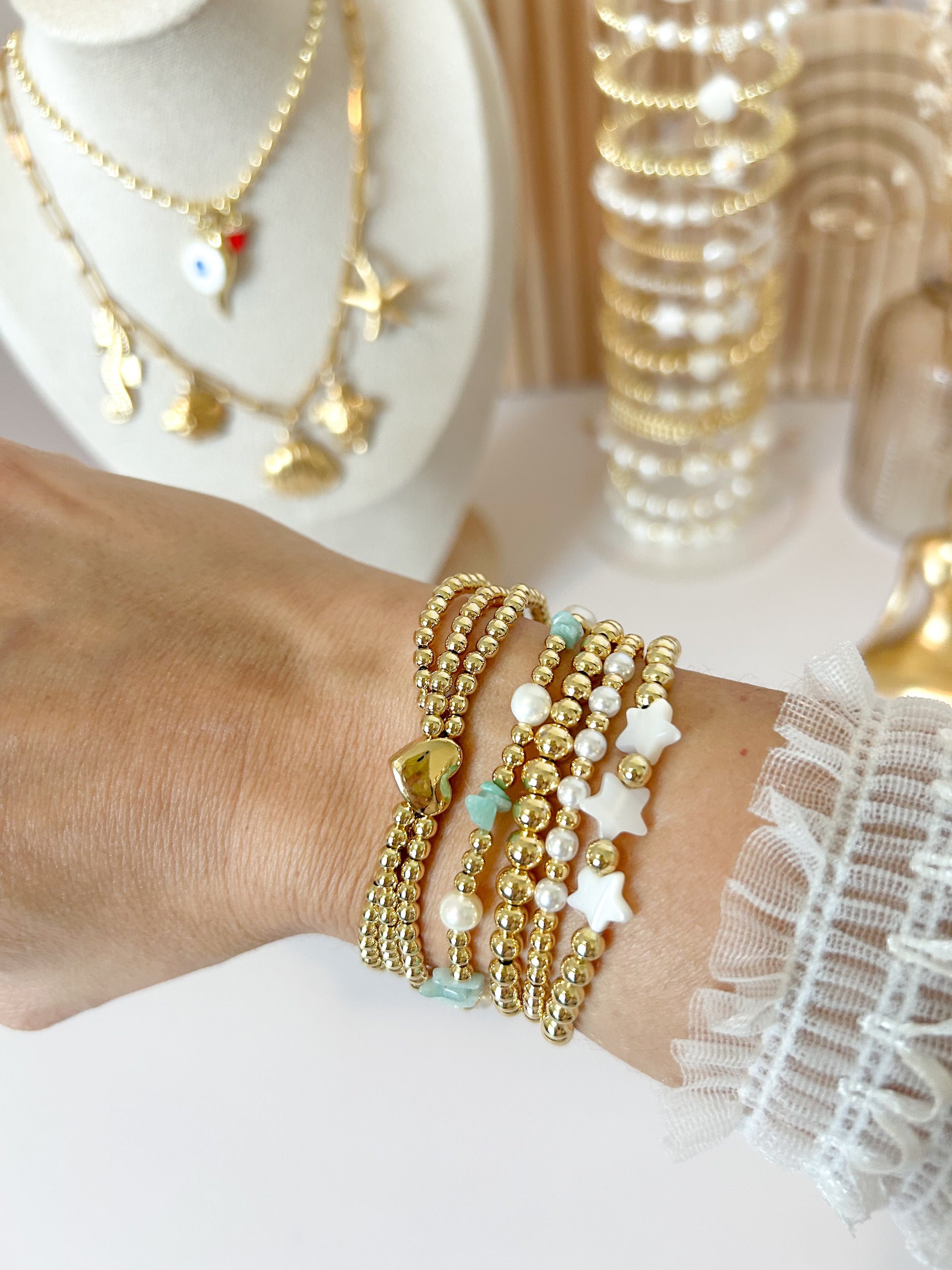 Let your wrist bloom with celestial elegance. The Celestial Garden Bracelet Set features a radiant mix of gold-toned beads, luminous pearls, dainty white stars, and delicate mint accents — designed to add a soft, dreamy glow to any outfit. Perfect for stacking or wearing solo, this set embodies charm, light, and effortless beauty.