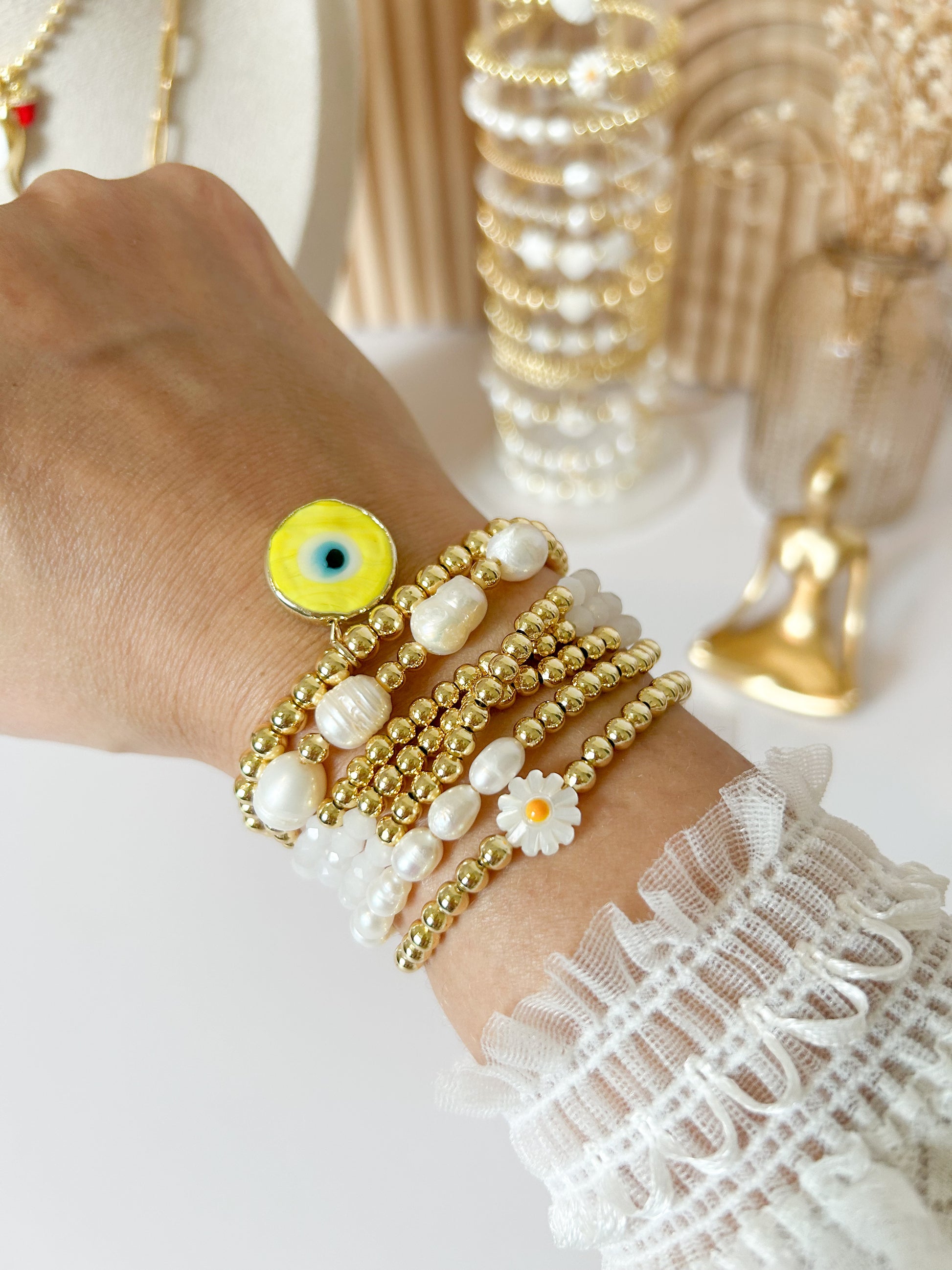 Bring a pop of sunshine and protection to your style with the Sunny Bloom. This dazzling set features a bold yellow evil eye charm, natural pearls, golden beads, and a delicate daisy that radiates charm and purity. It’s the perfect mix of elegance and energy—ideal for everyday magic.