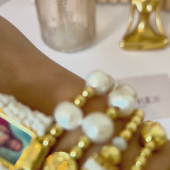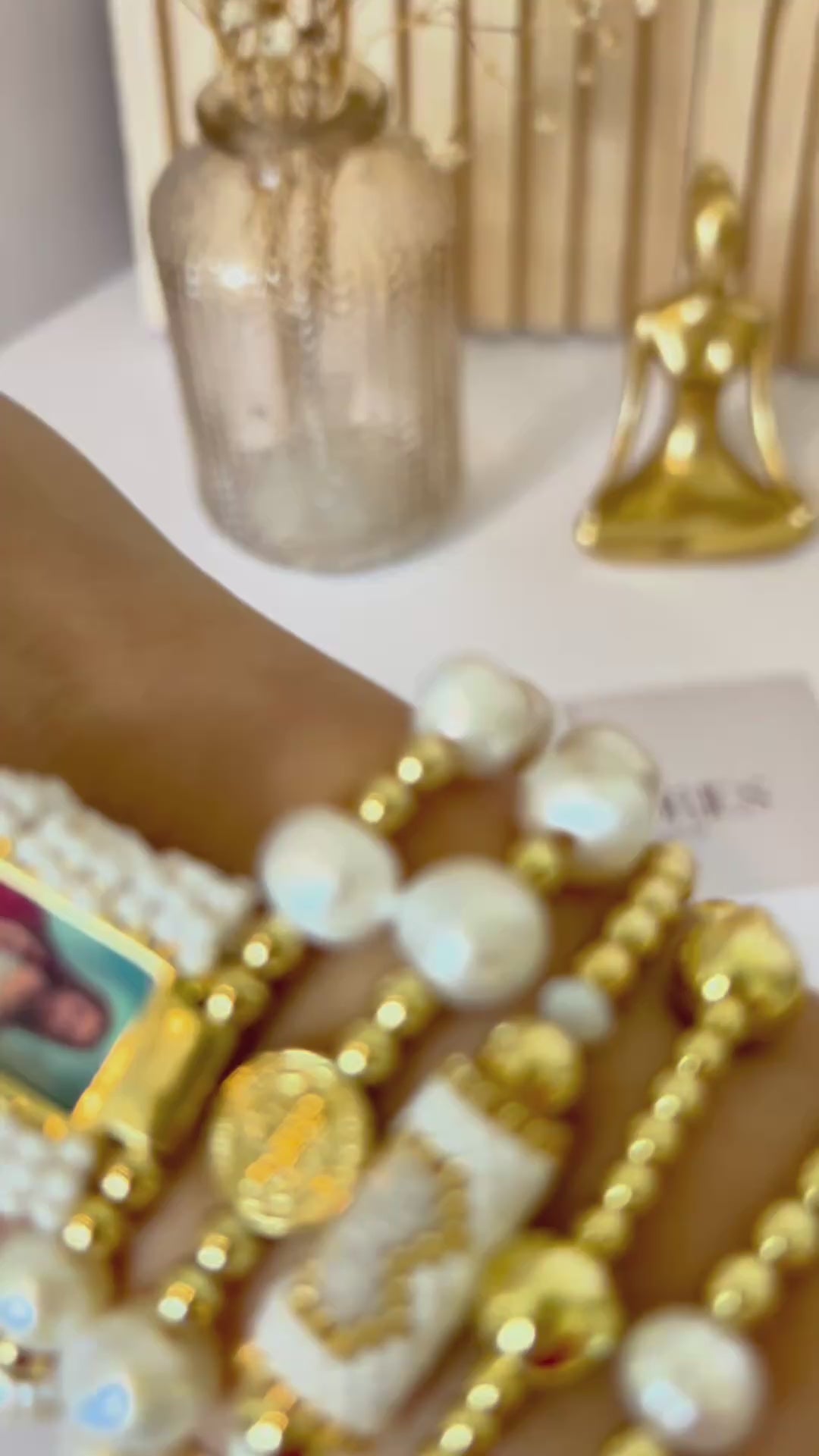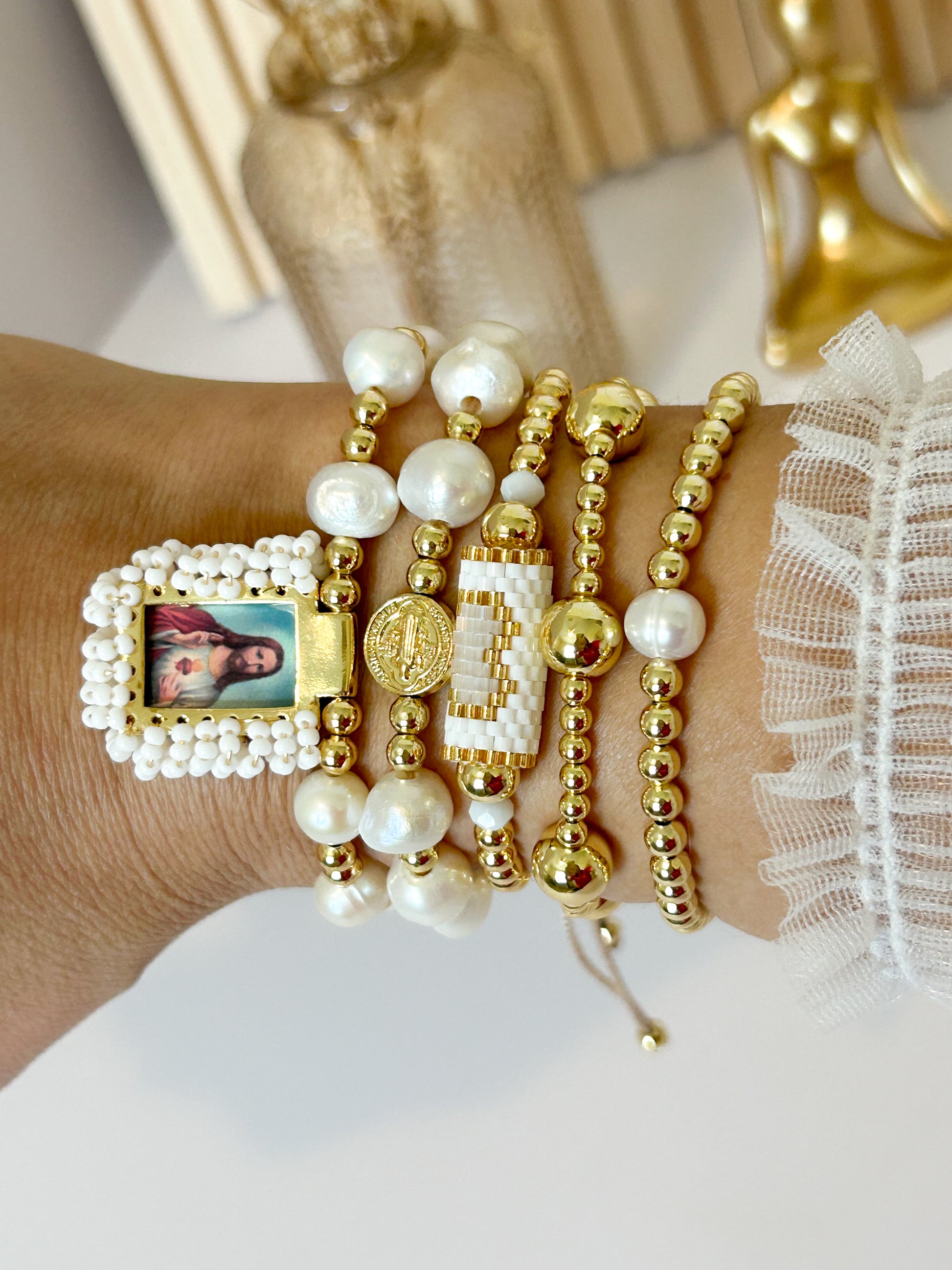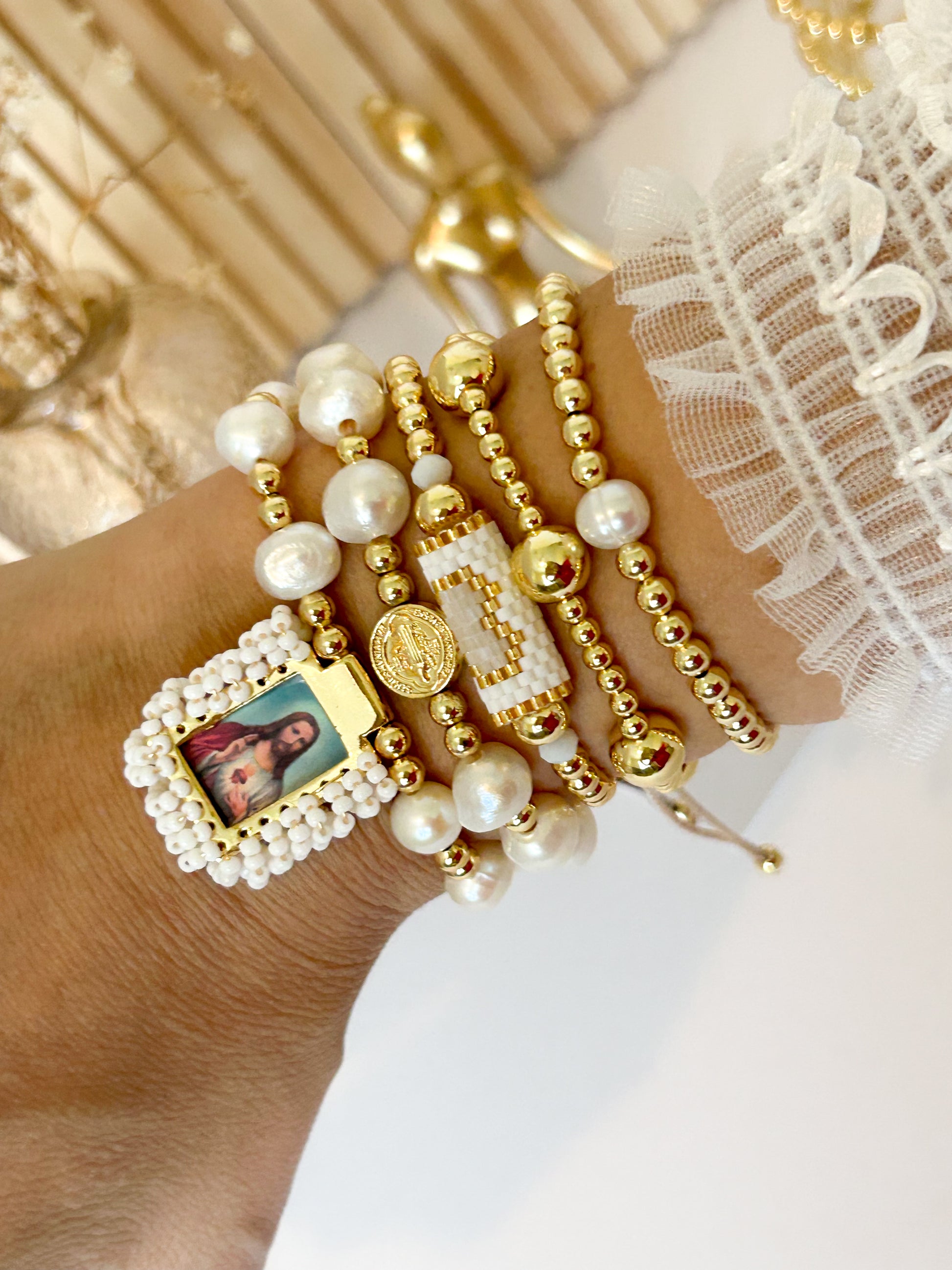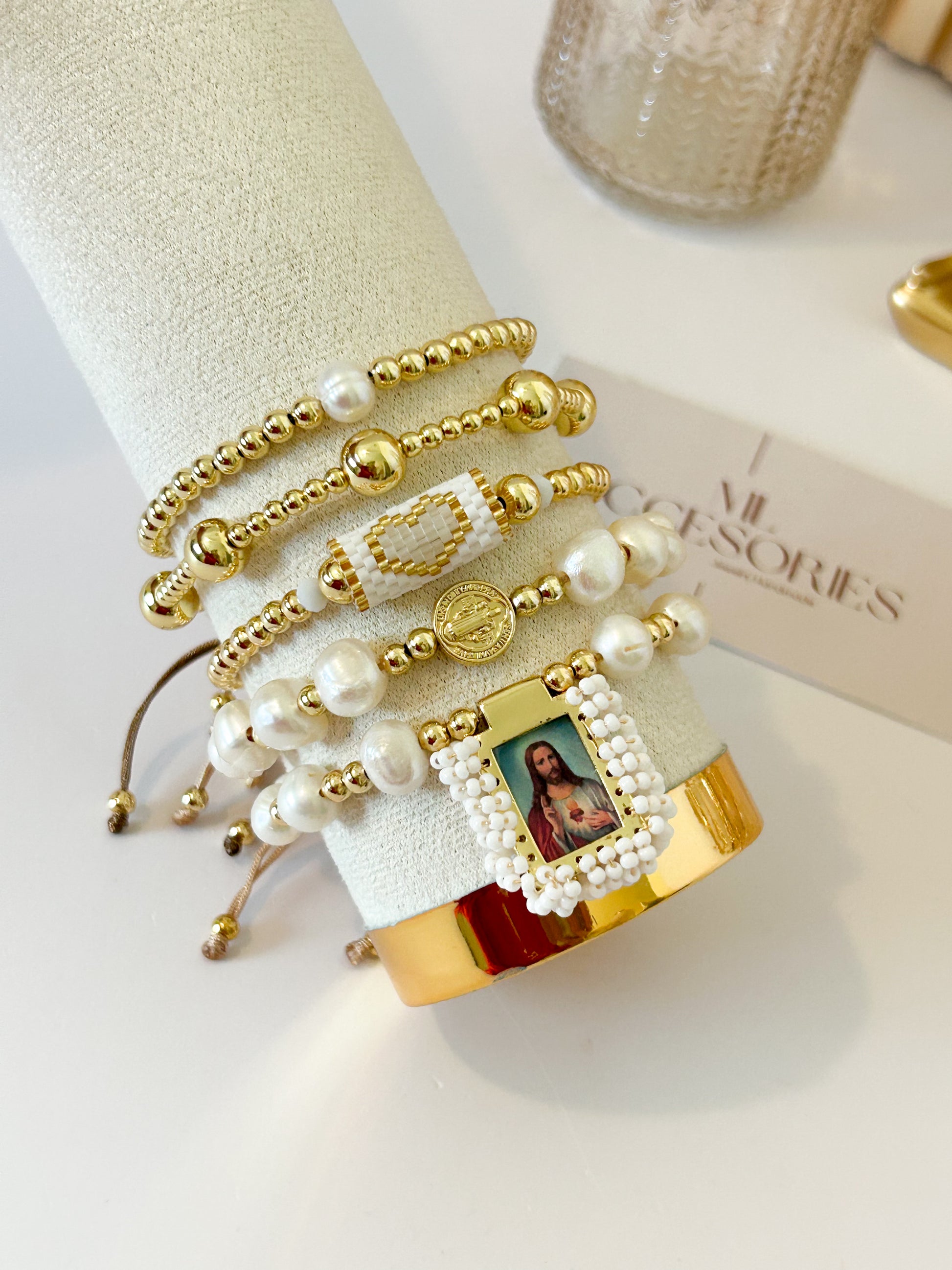 - Materials: 18k gold-plated copper beads, freshwater pearls, Miyuki glass beads, and Sacred Heart pendant