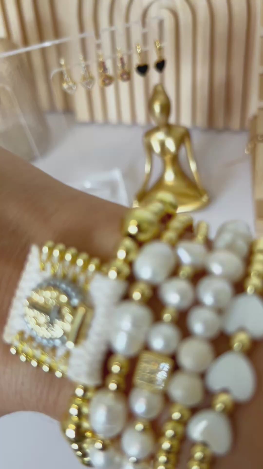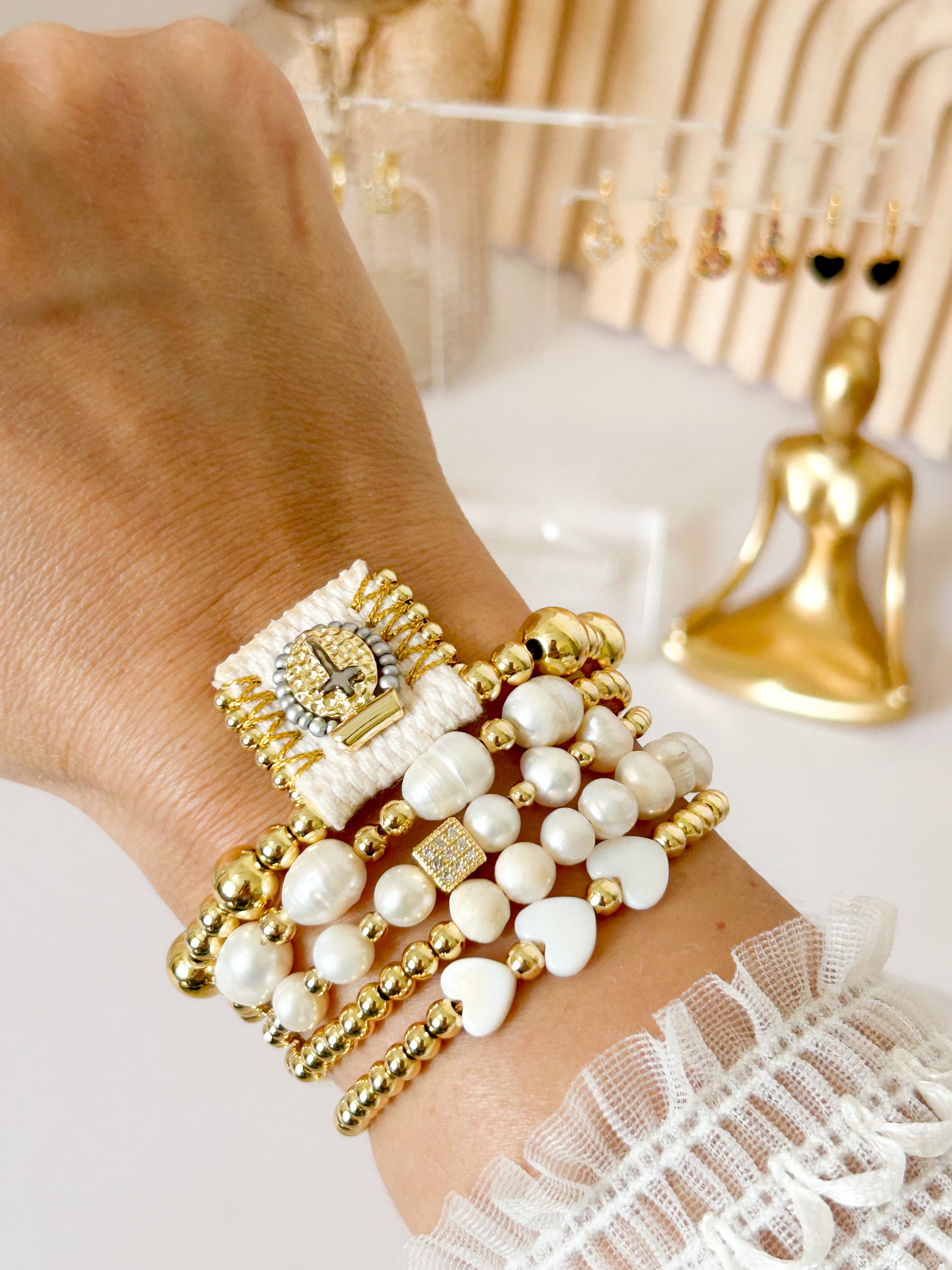 The Divine Glow Set features a luxurious mix of 18K gold-plated beads, luminous pearls, and mother-of-pearl hearts — crowned by a radiant gold charm that adds a touch of faith and sophistication.