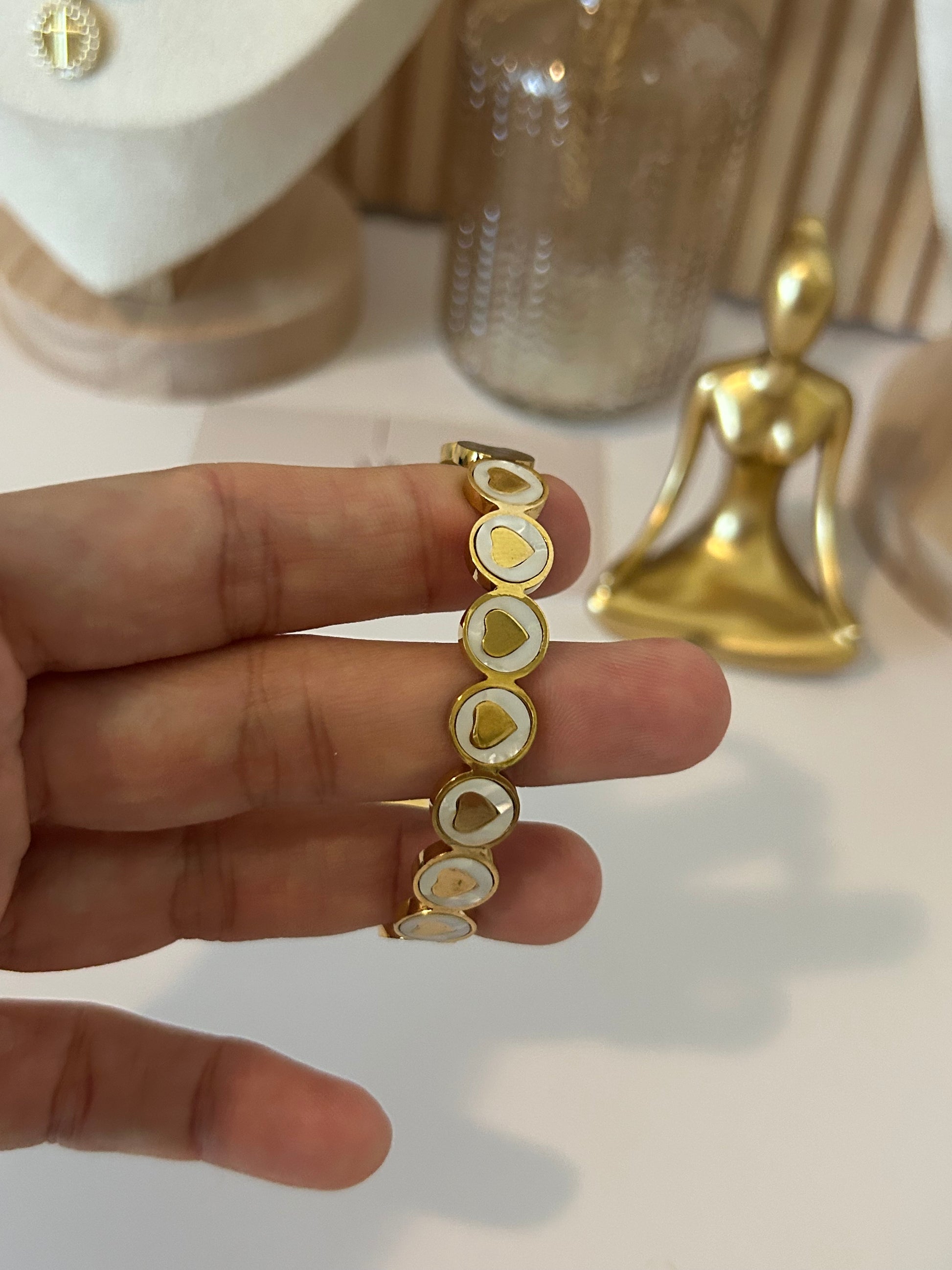 The Elena Bracelet is a sleek and modern cuff-style piece crafted in stainless steel with an 18K gold plating. Adorned with white enamel evil eye accents, it’s designed to bring elegance while symbolizing protection and positivity.