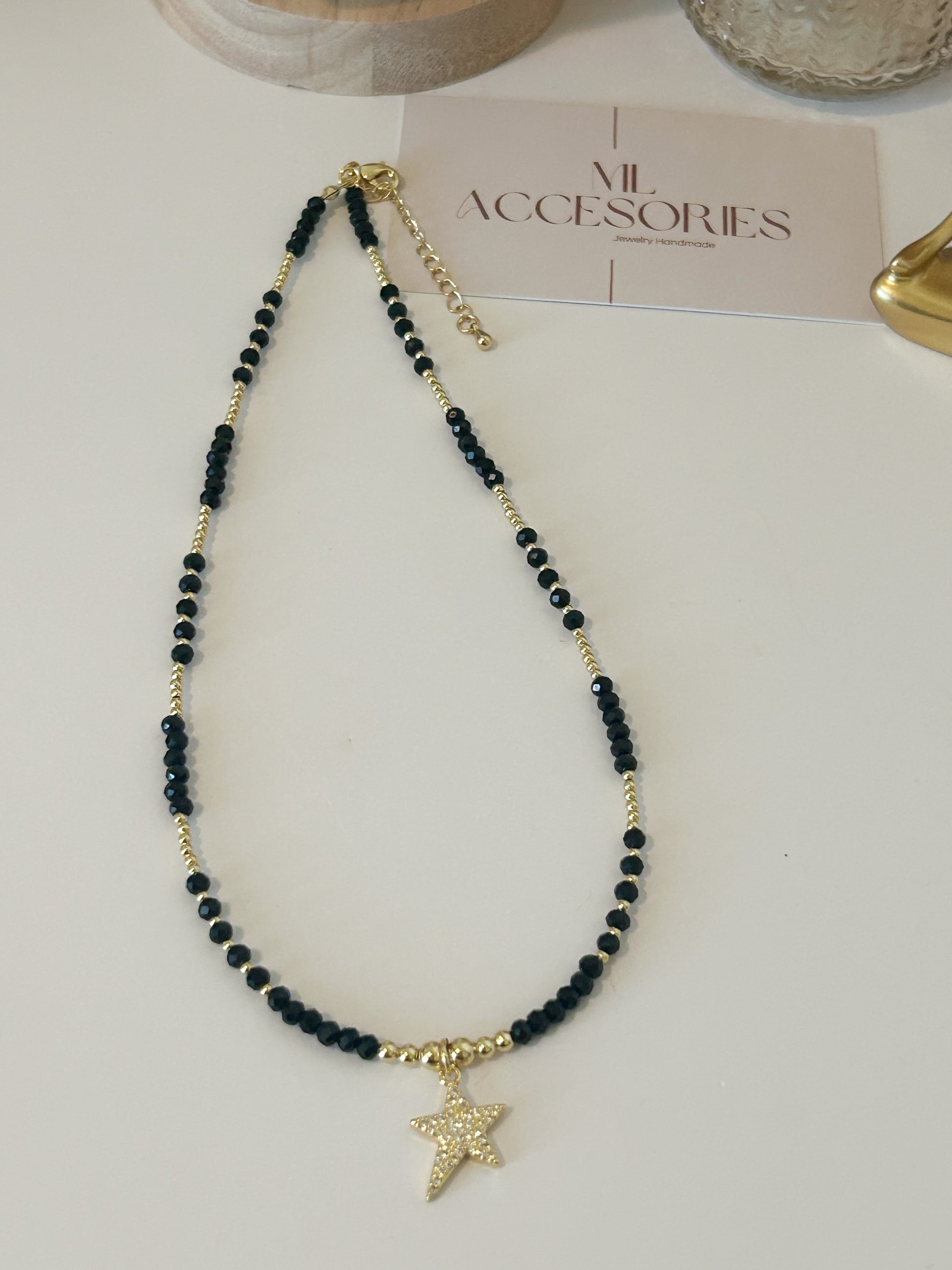 The Estrella Necklace is a chic and modern piece that combines elegance and symbolism. Featuring faceted black beads paired with golden accents, its centerpiece is a sparkling star charm that represents light, hope, and guidance. This versatile necklace is perfect to wear solo for a minimalistic look or layered with other chains for a trendy style.