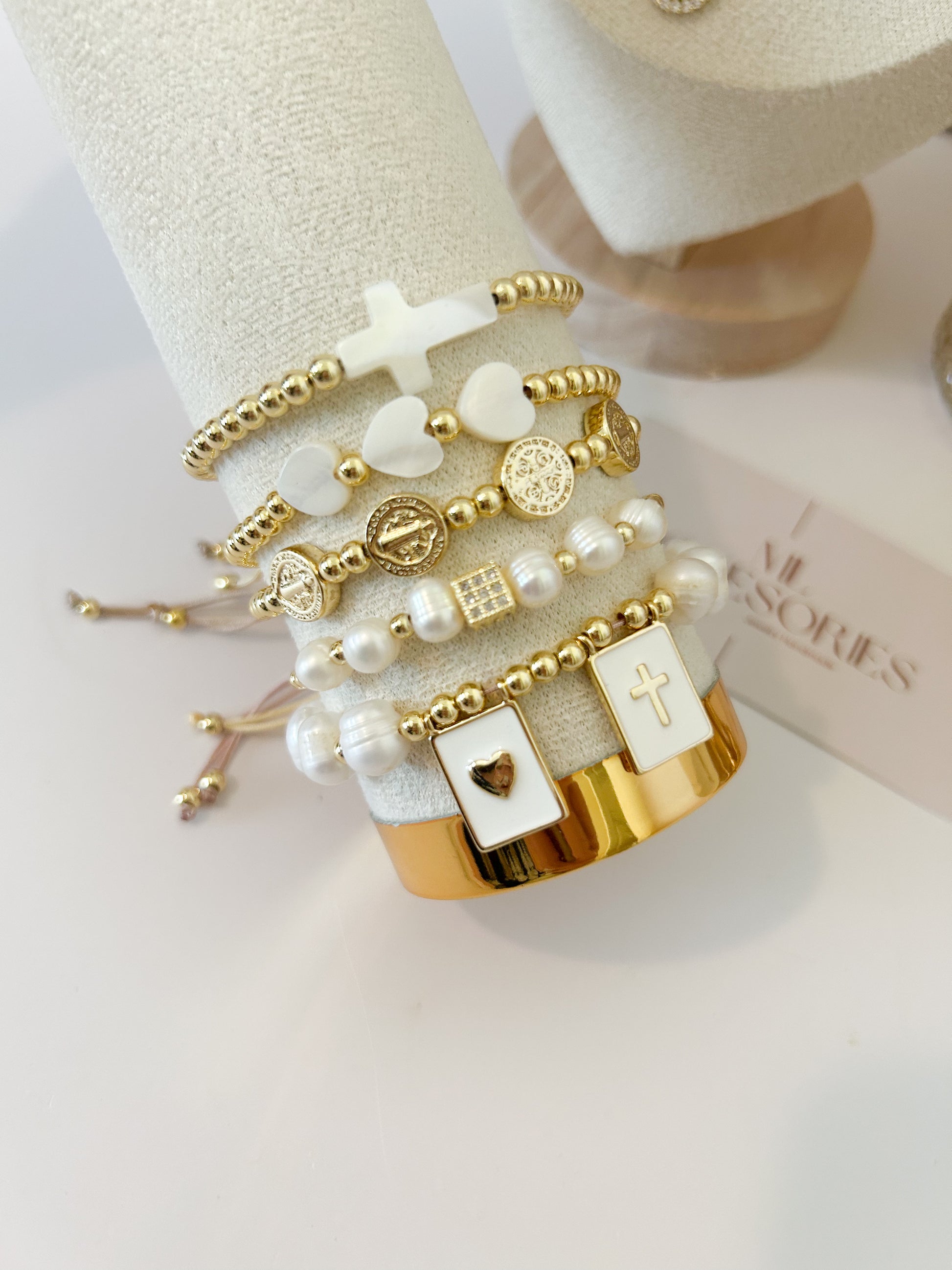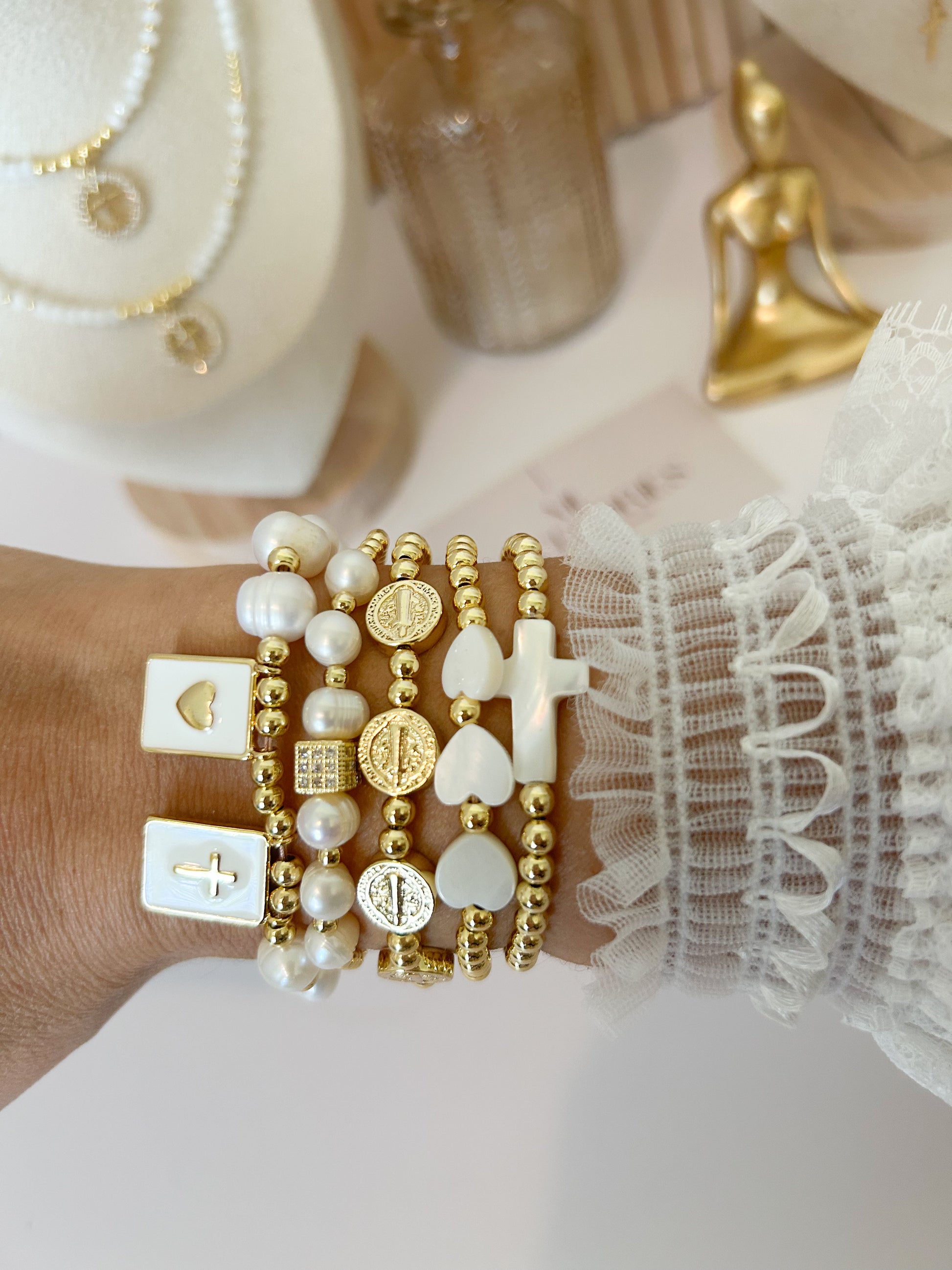 A sacred blend of faith and elegance. The Fara Set features a harmonious combination of white heart and cross details, Saint Benedict medals, and freshwater pearls — all paired with 18K gold-plated copper beads. A deeply meaningful stack made to inspire, protect, and shine.