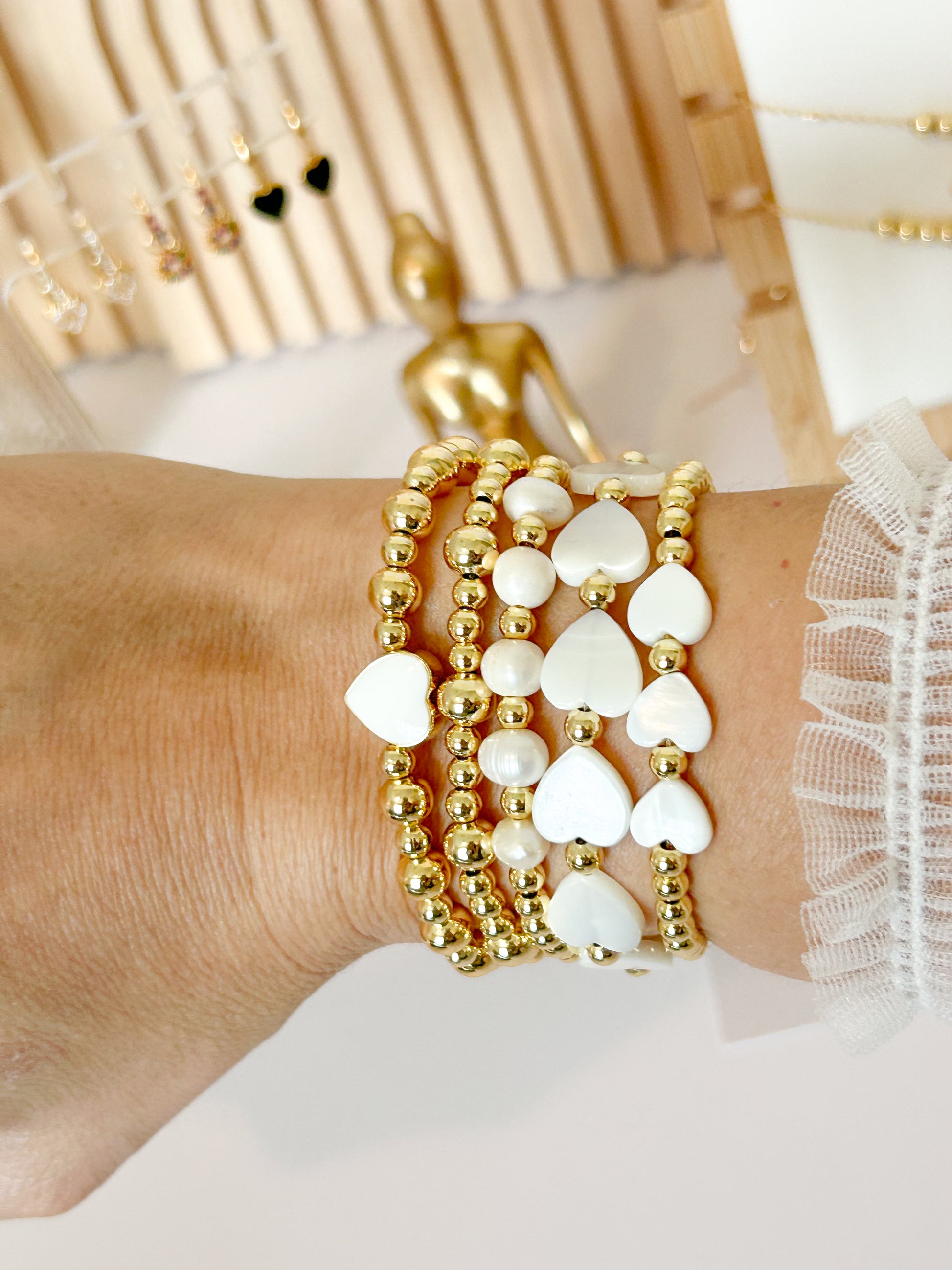 This 5-bracelet stack combines radiant 18K gold-plated beads with luminous mother-of-pearl hearts, creating a look that’s delicate, feminine, and timeless. Perfect to wear from day to night, it adds a golden glow to any outfit — whether you’re dressing up or keeping it simple.