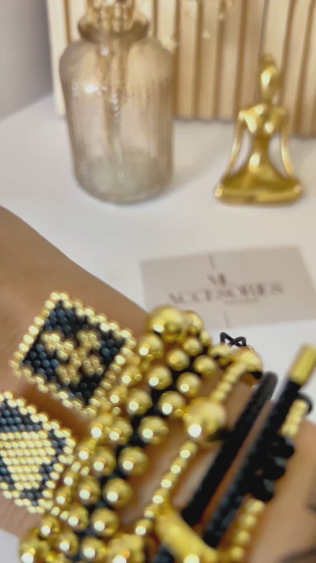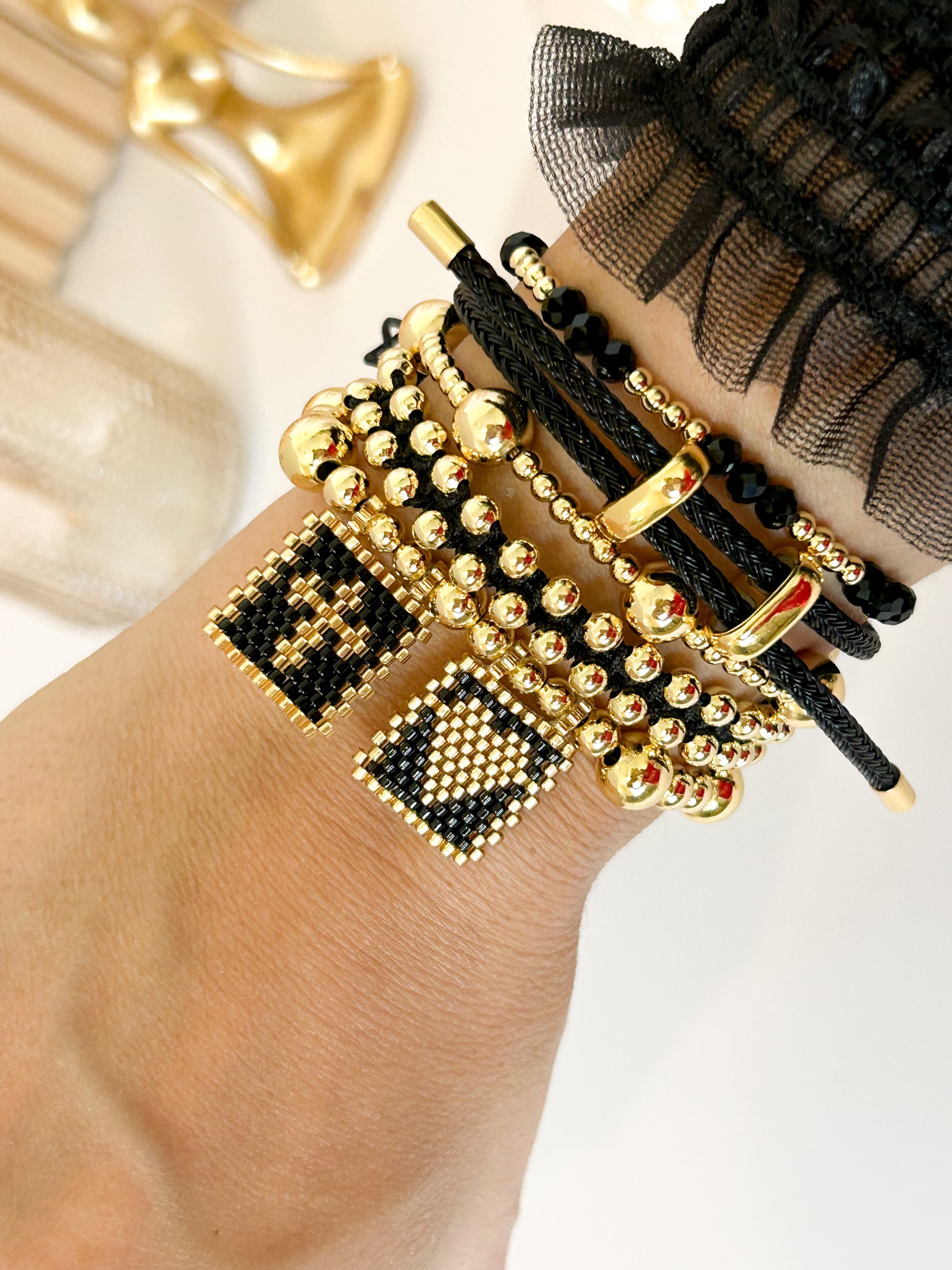 - Materials: 18k gold-plated copper beads, black cord, Miyuki glass beads