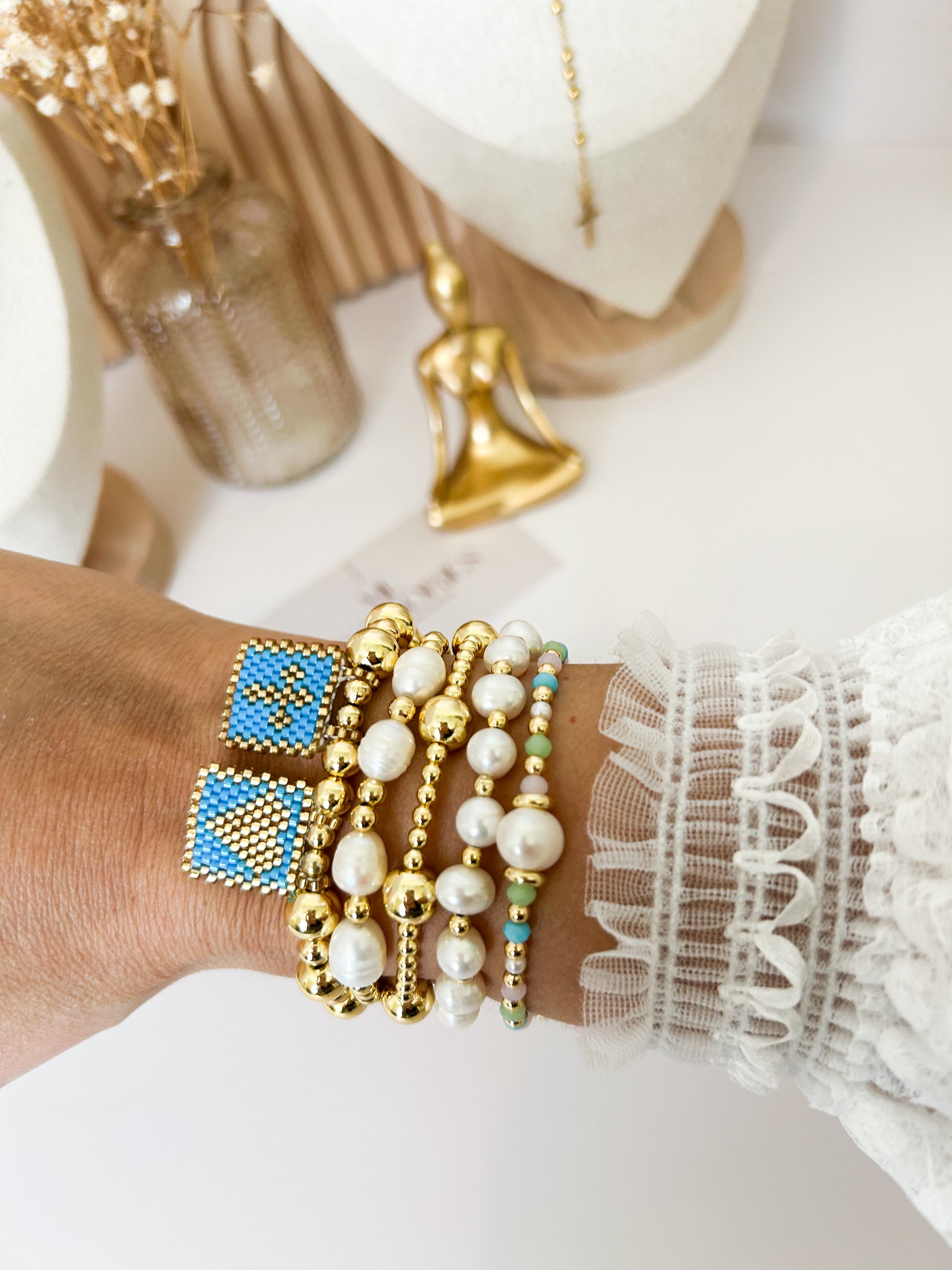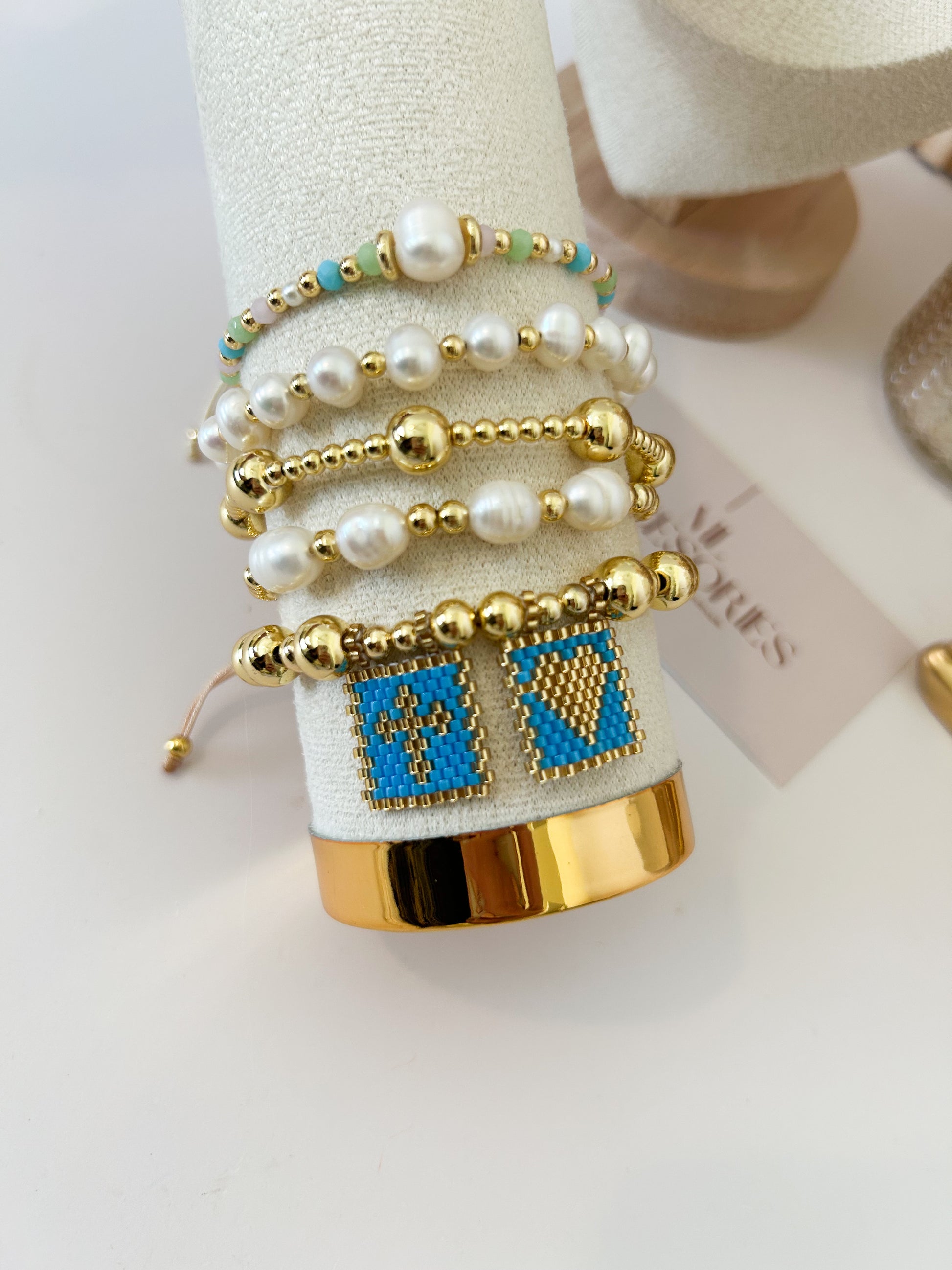 Your wrist, your story — told in five golden layers. The Glow up is a beautifully curated set of 5 adjustable bracelets designed to mix elegance, color, and charm. From lustrous pearls to gold heart details and handwoven beaded charms in vibrant turquoise and gold, each bracelet brings a unique energy. Wear them all together for a bold, stacked look or mix and match depending on your vibe. Effortless to wear, easy to love.