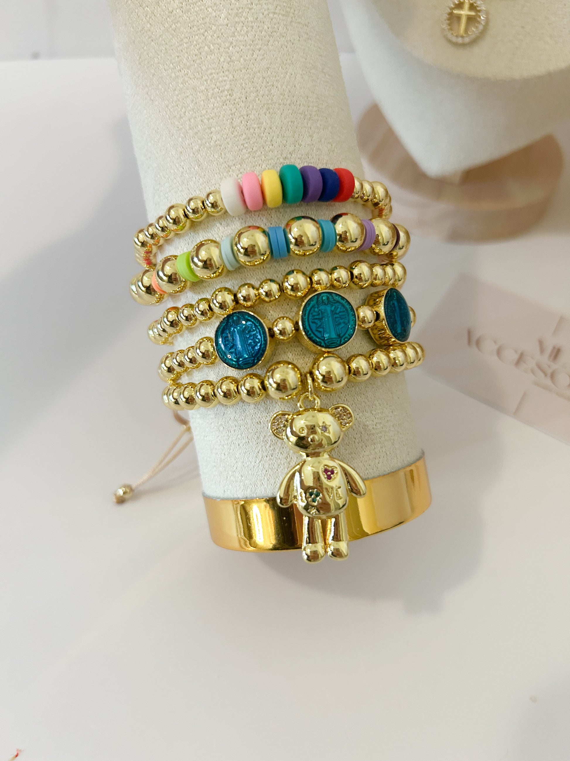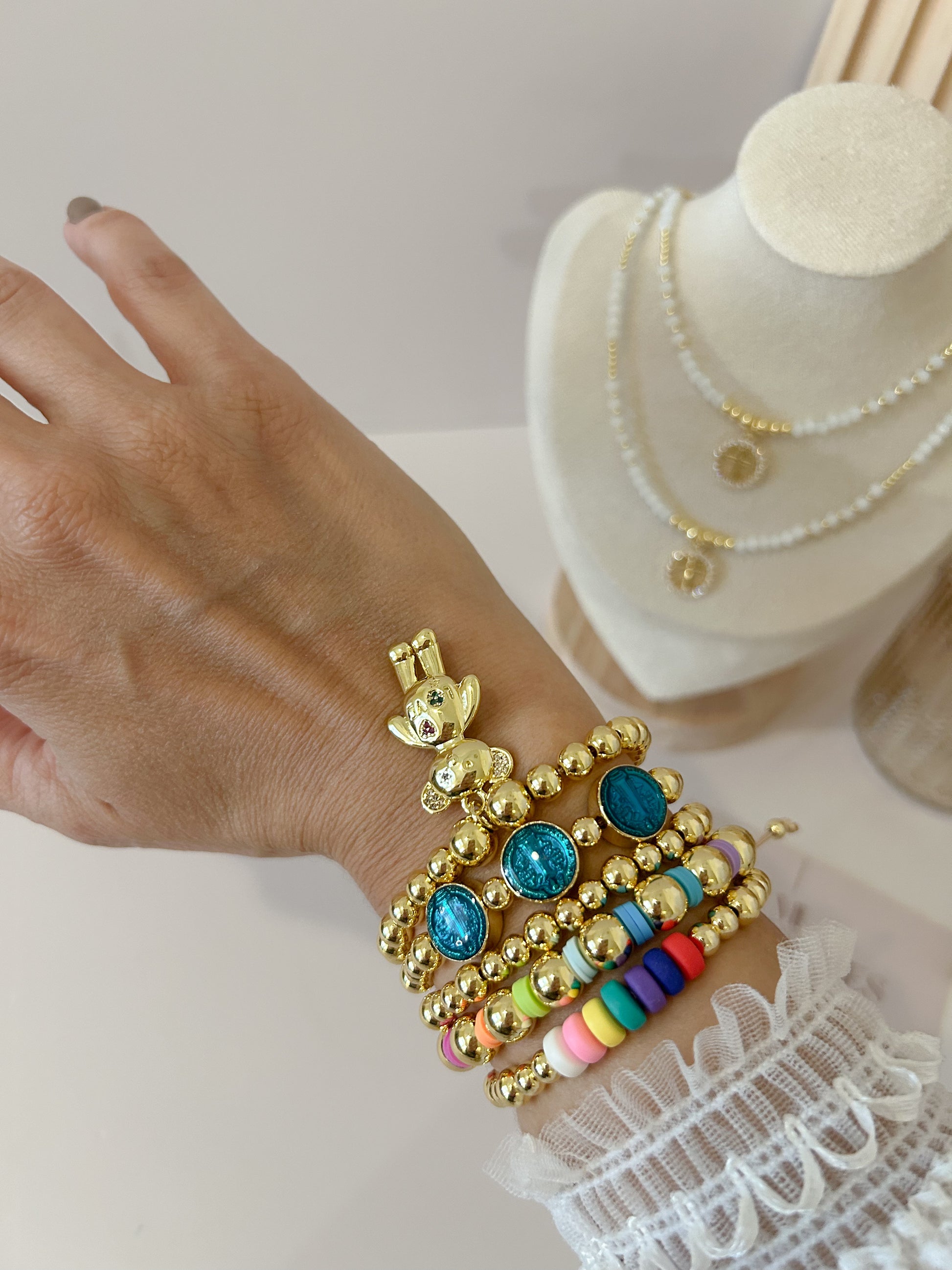The Good Vibes Set is a mix of shine, color, and meaning. Featuring gold-plated beads, vibrant enamel charms, and a playful mix of textures, this stack is designed to elevate your everyday style. Perfect to wear solo or layered for a bold statement.