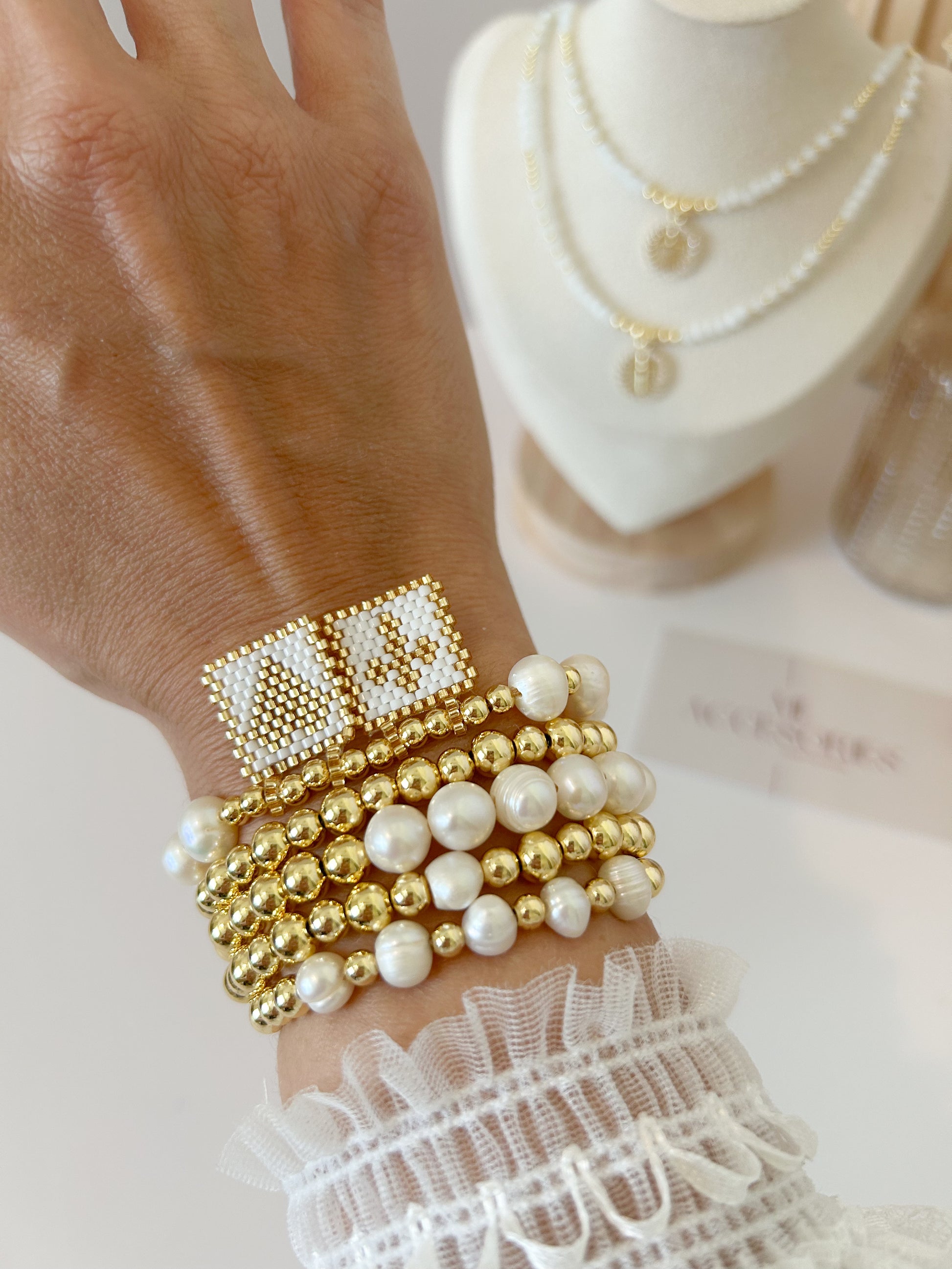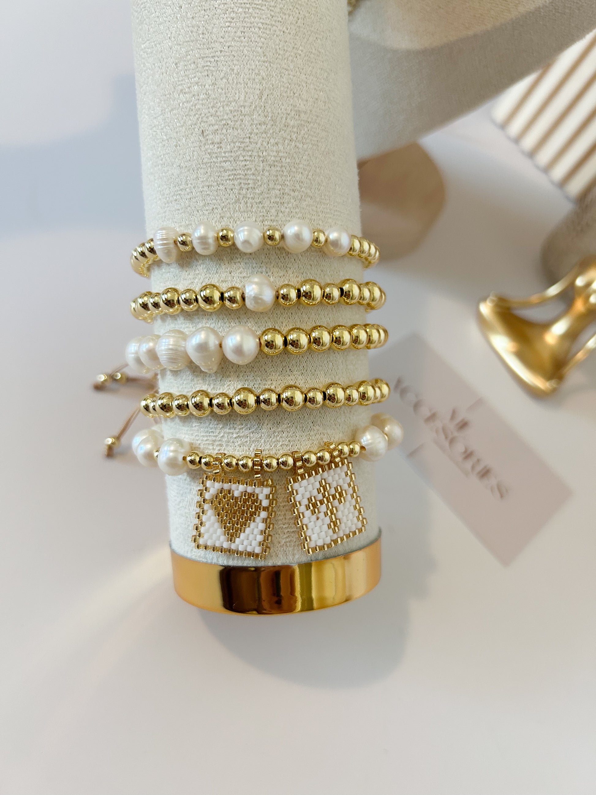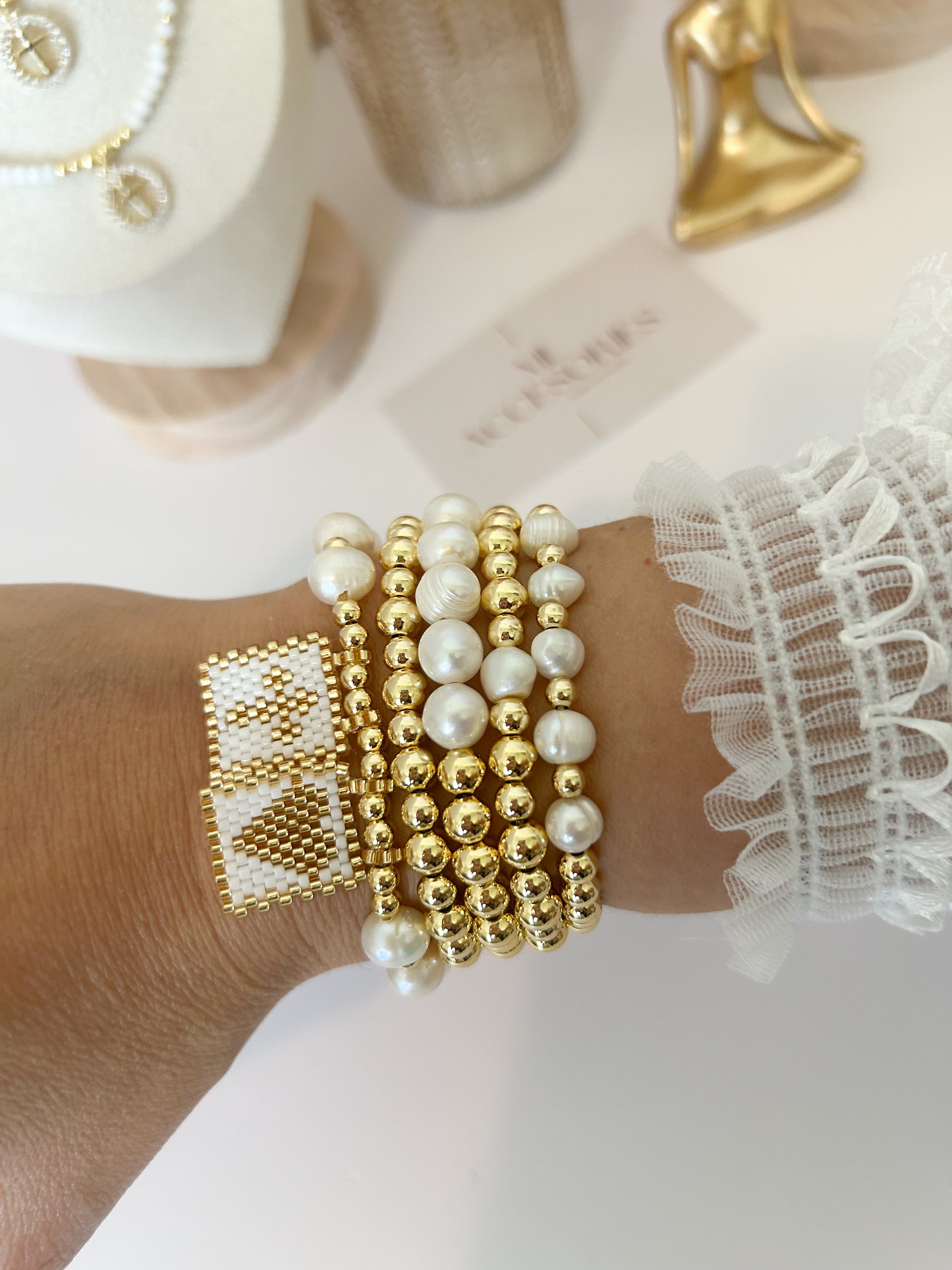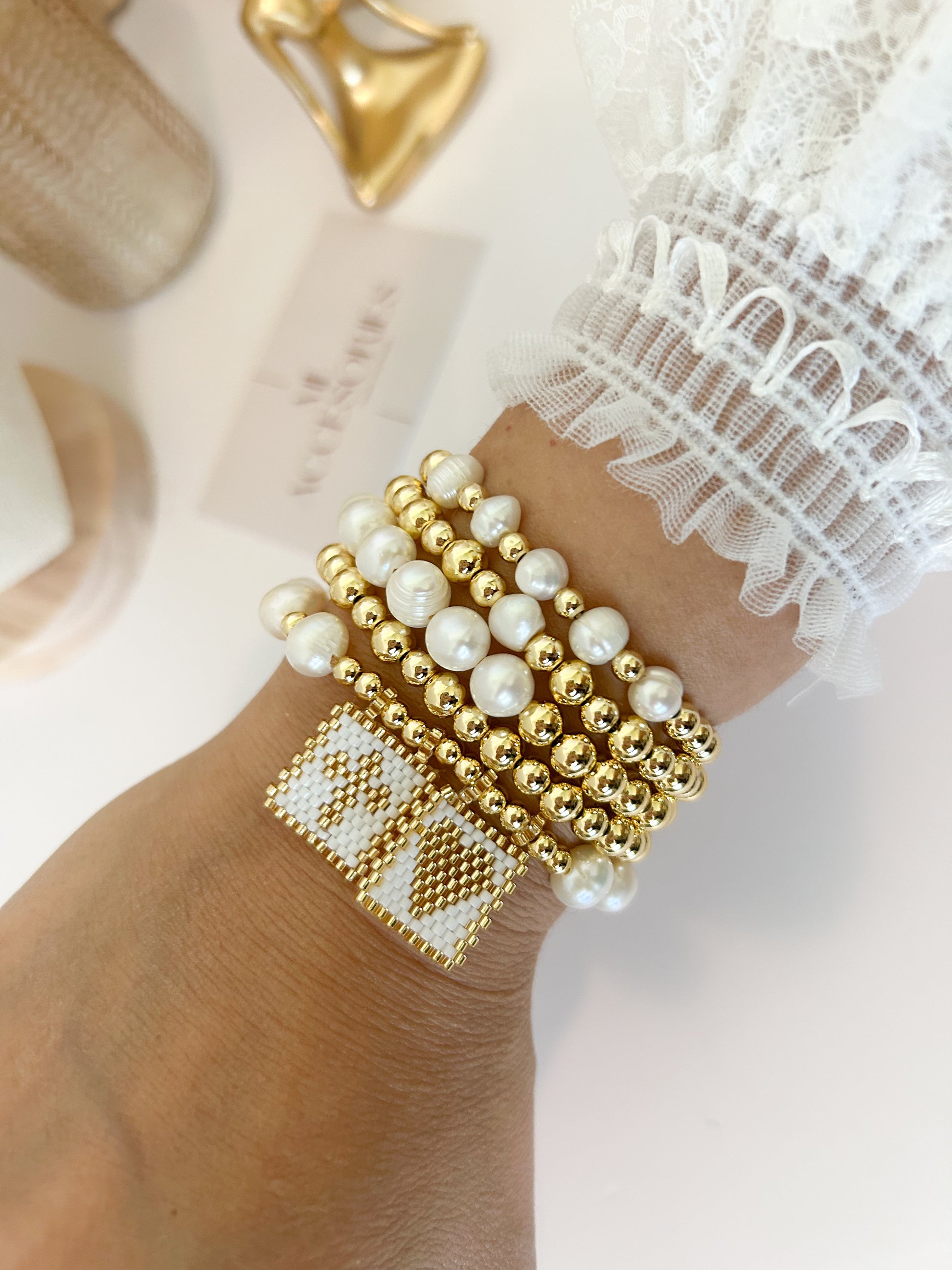 A bracelet stack that shines with meaning. The Hope Set blends the timeless beauty of freshwater pearls, the elegance of 18k gold plated beads, and the artisanal charm of handmade beaded squares in neutral tones.