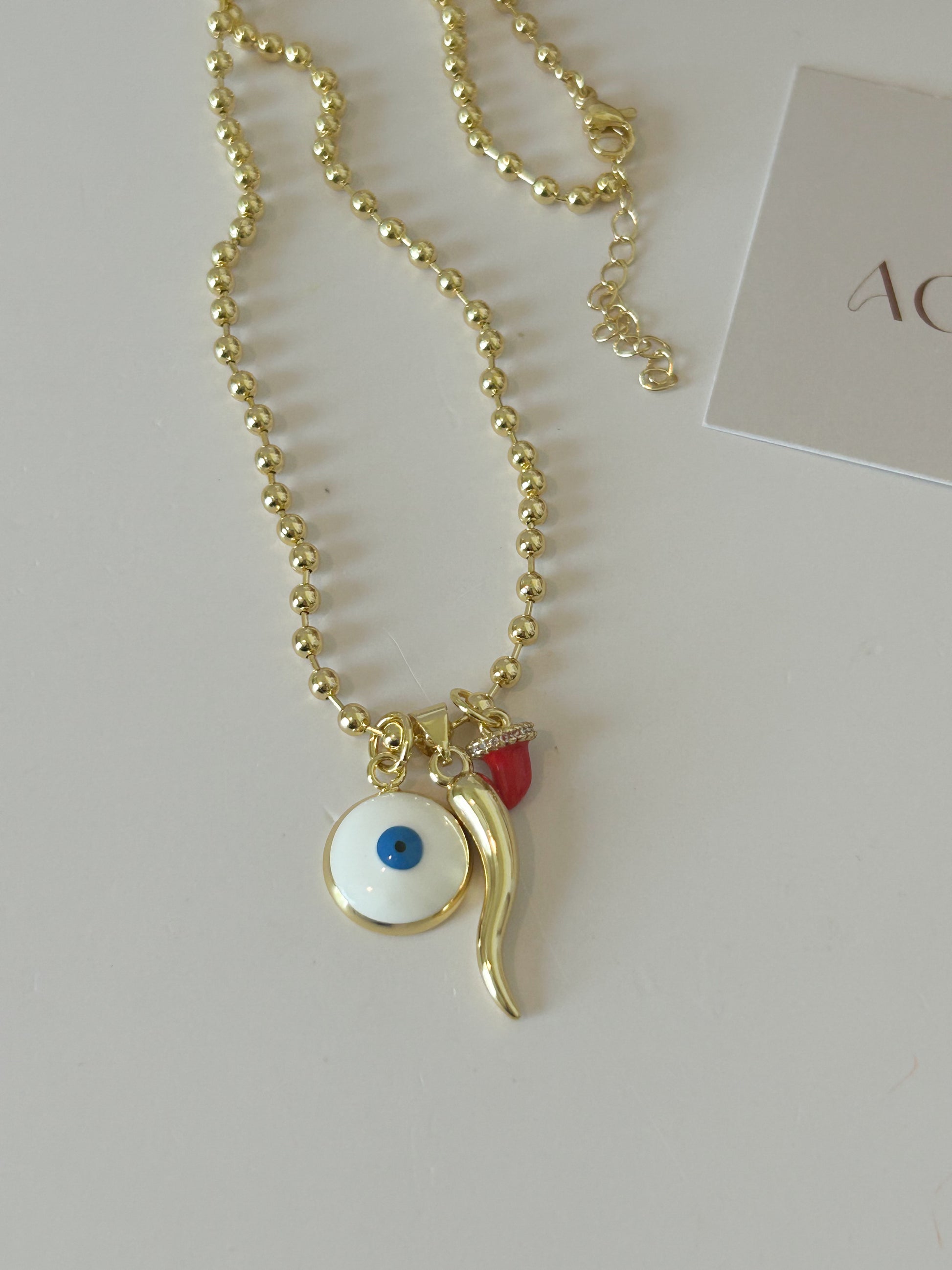 The Sofia Necklace is a bold yet spiritual piece designed to protect and empower. Featuring a polished gold bead chain with two symbolic charms — the blue evil eye for protection and the red cornicello horn for good fortune — this necklace merges elegance with ancient tradition. A modern amulet that carries both meaning and style.