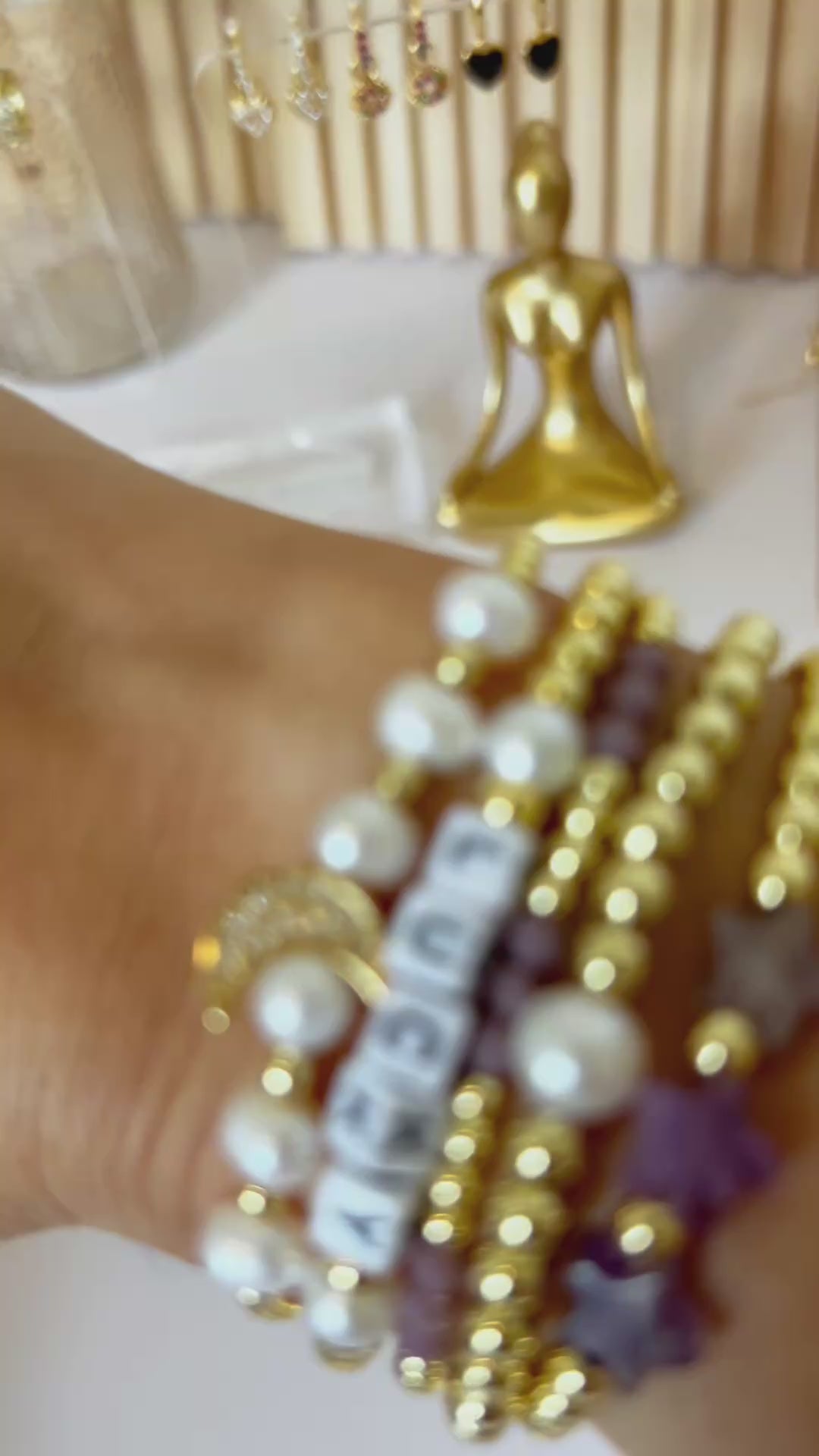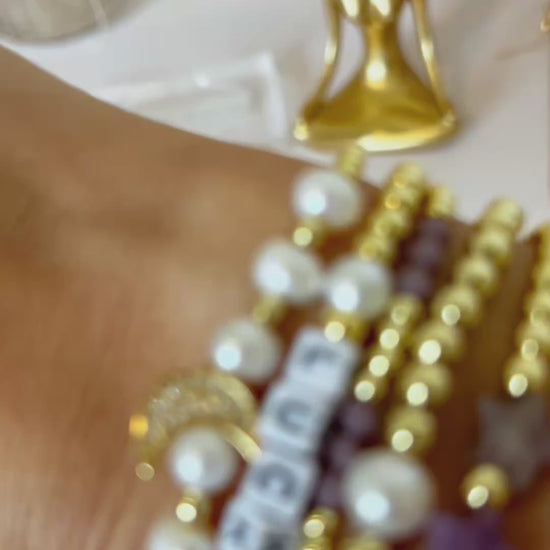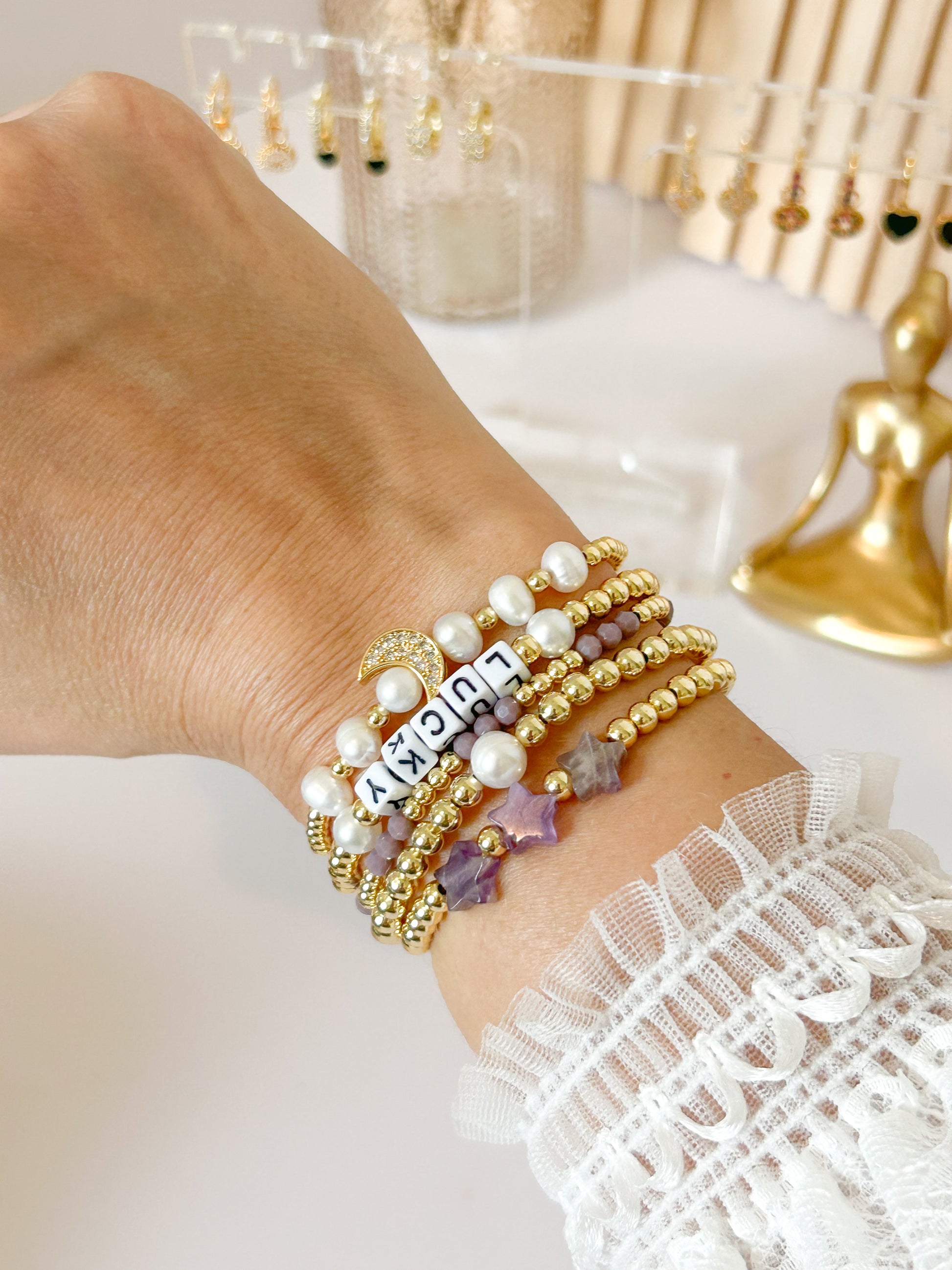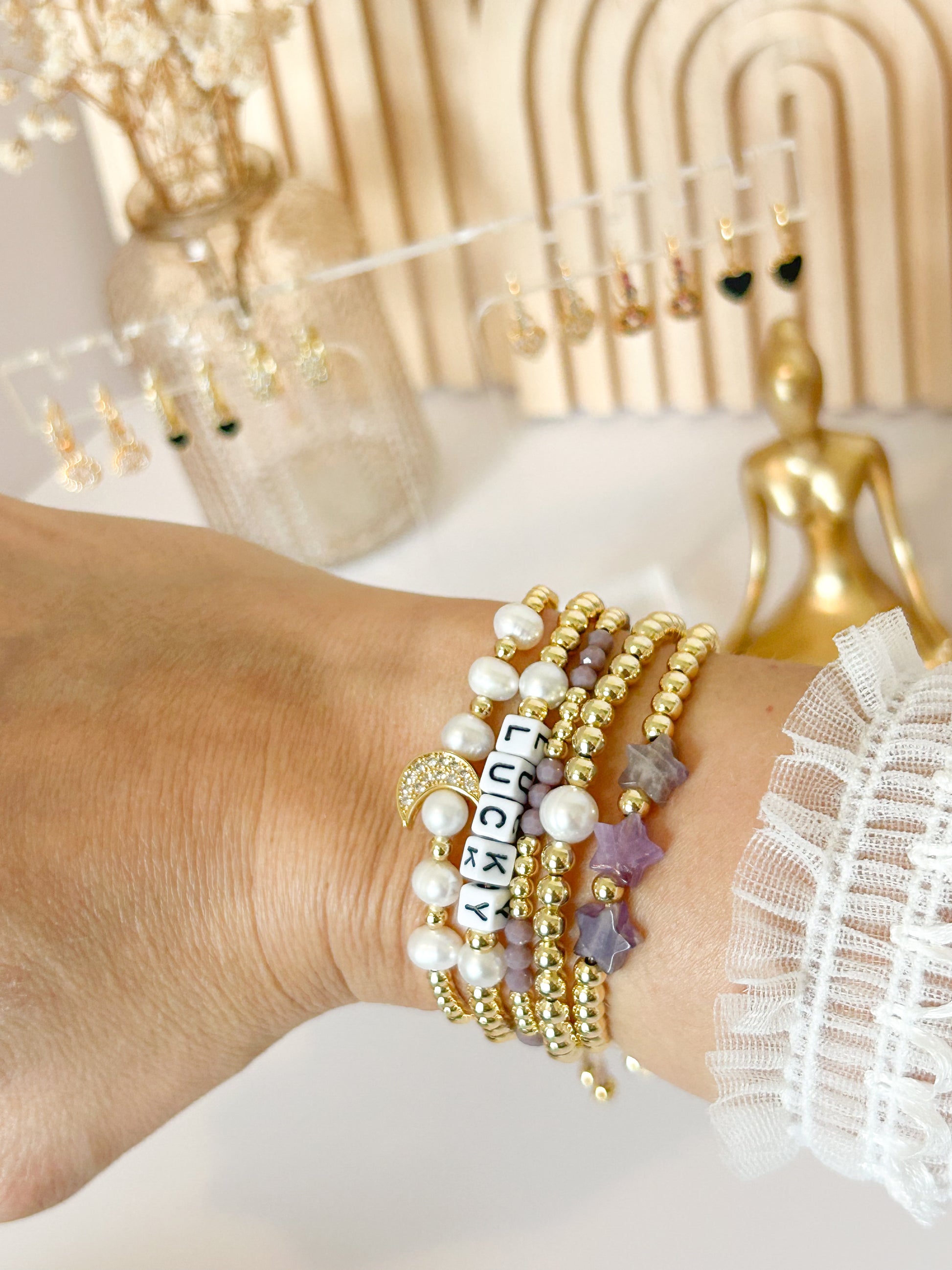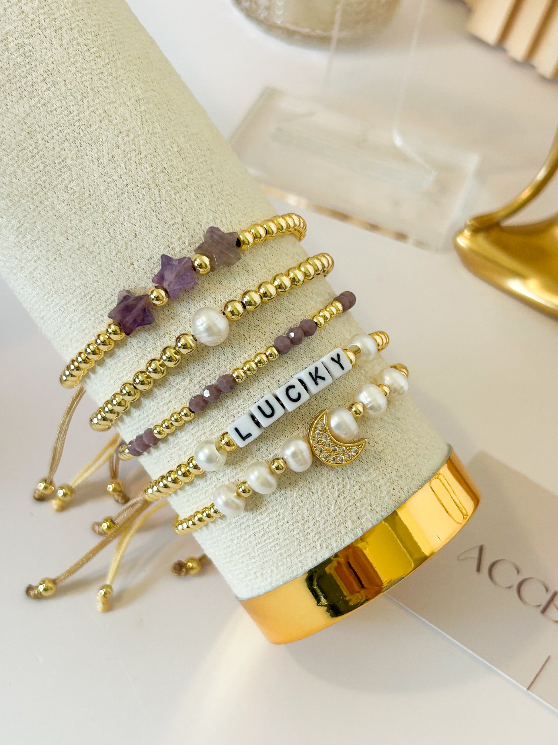 The Lucky Charm Set is all about energy, elegance, and meaning. Featuring a mix of gold accents, natural stones, pearls, a sparkling moon charm, and a fun “LUCKY” bead bracelet, this set is designed to inspire positivity and bring a stylish glow to your everyday look.
