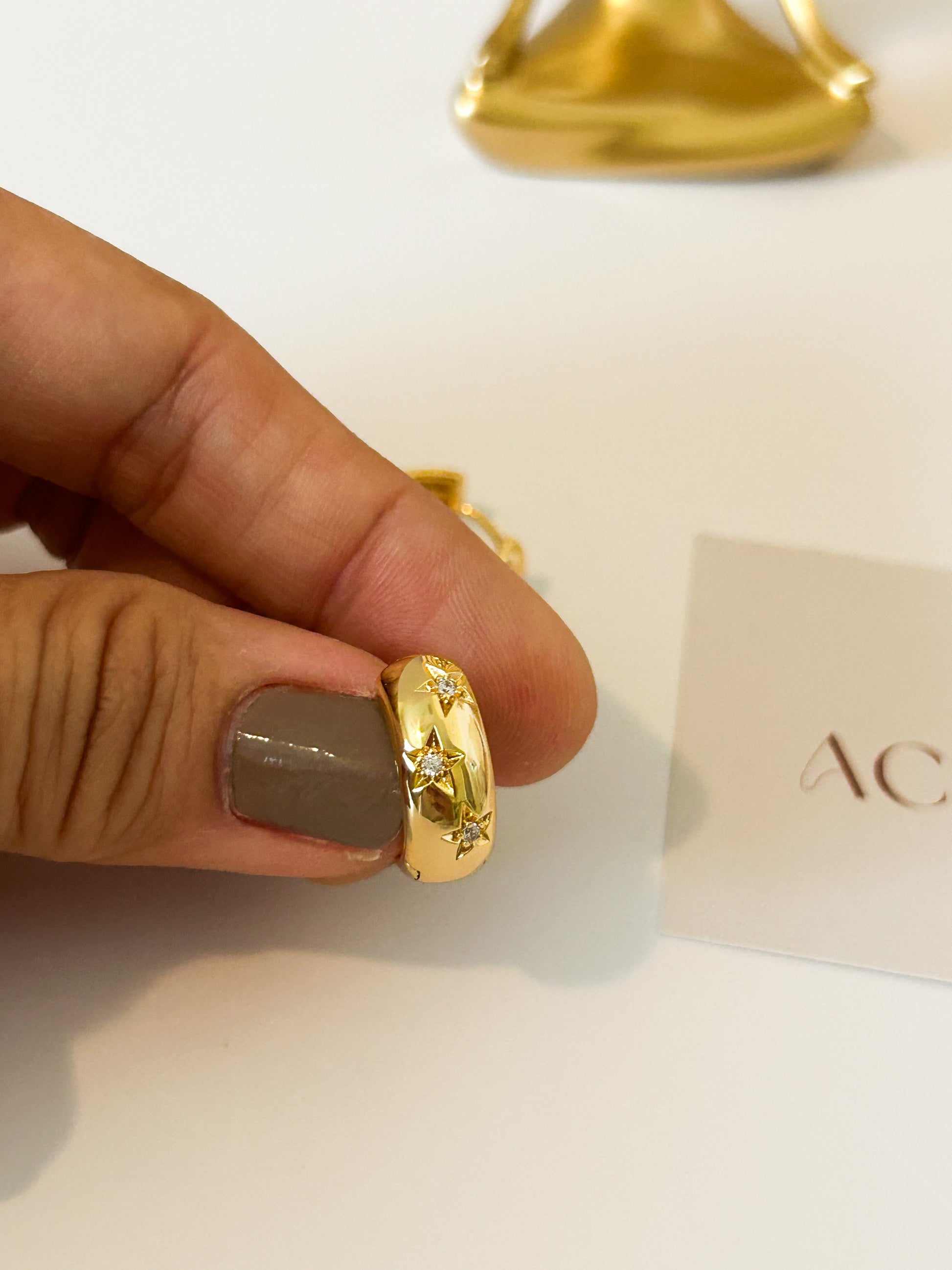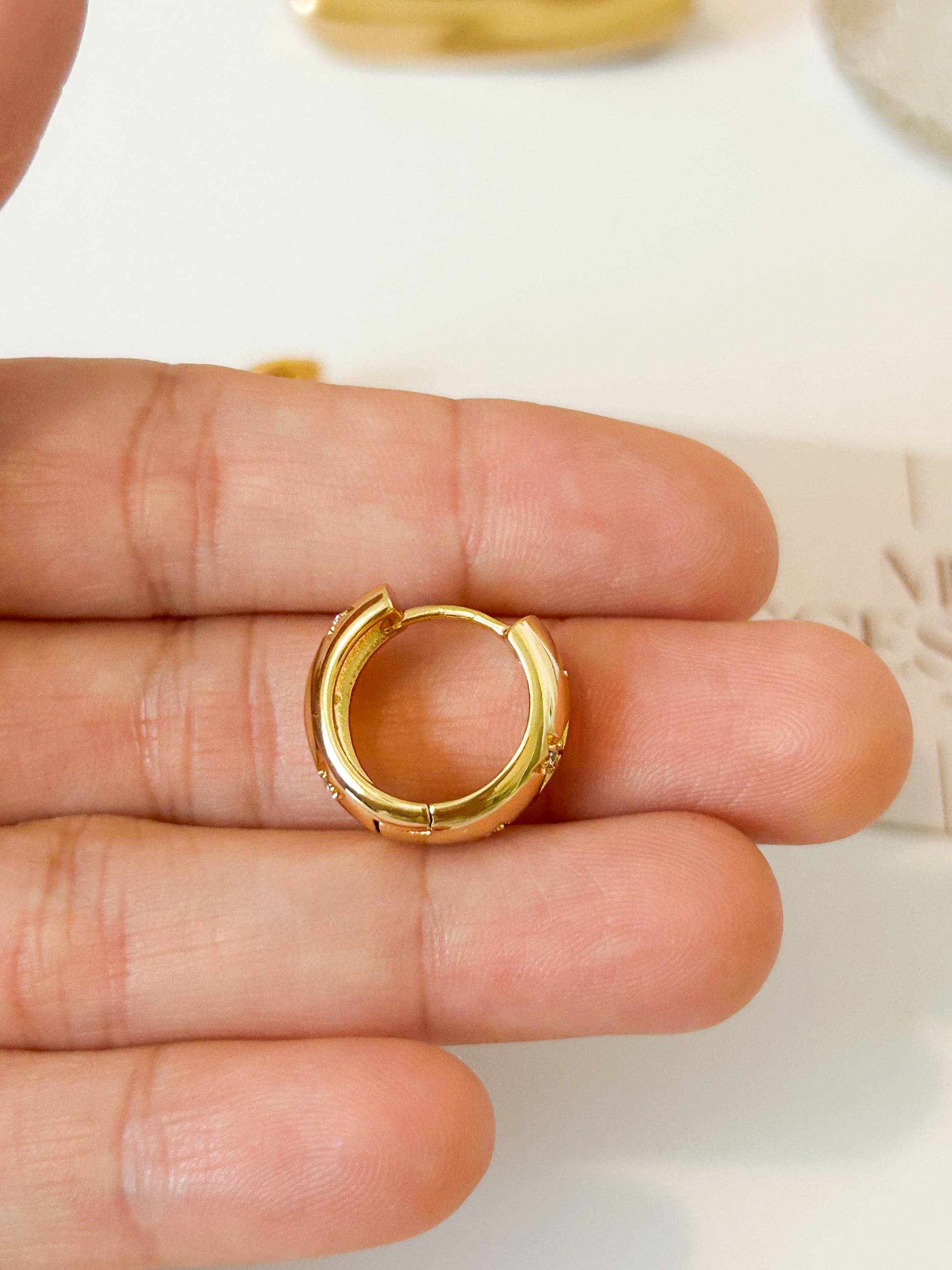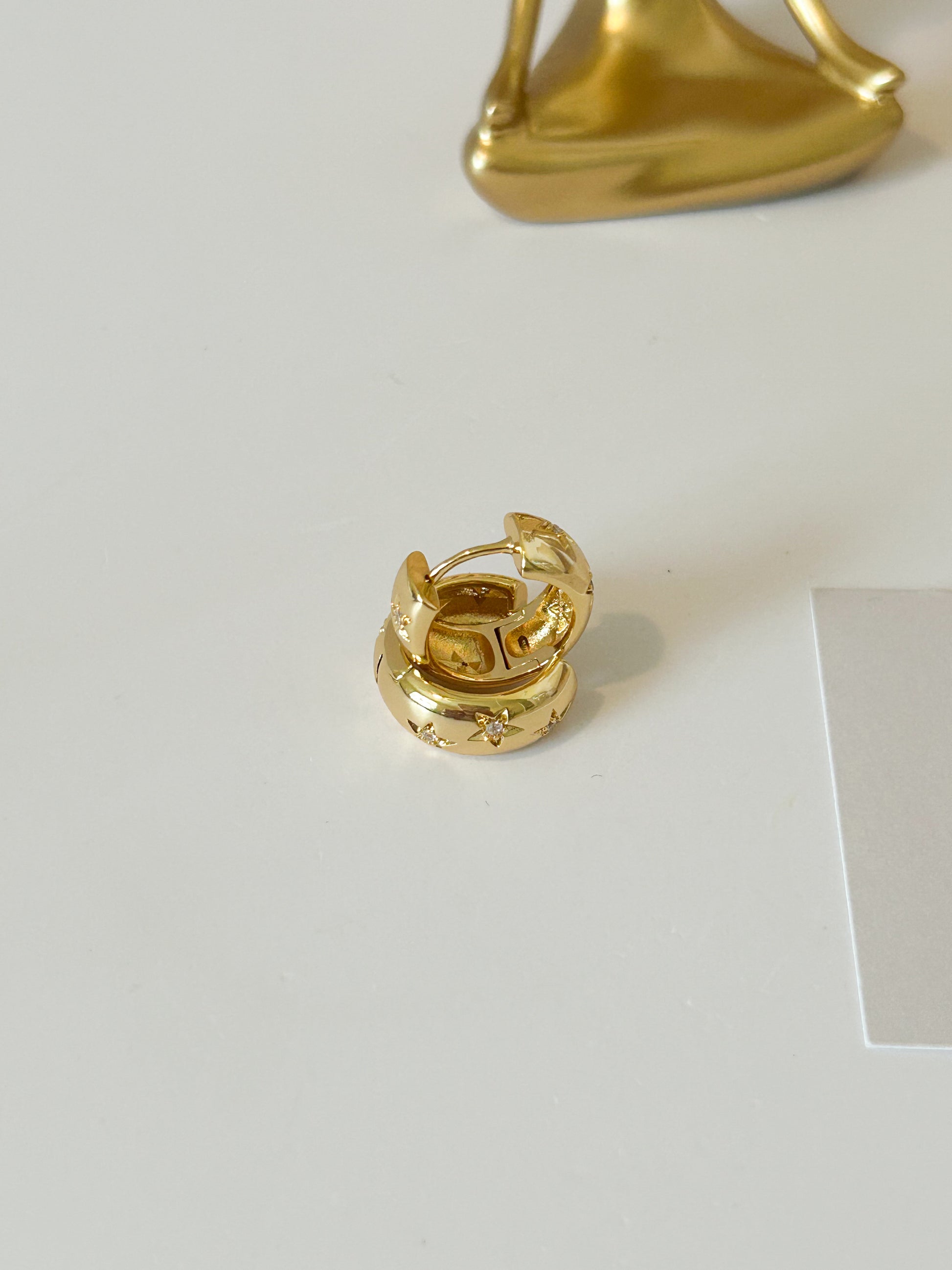 The Luna Hoops capture the mystery and brilliance of the night sky. With golden stars delicately engraved and accented with zircons, these chunky huggies are perfect to add celestial charm to any outfit. Timeless, bold, and luminous—just like the moon.