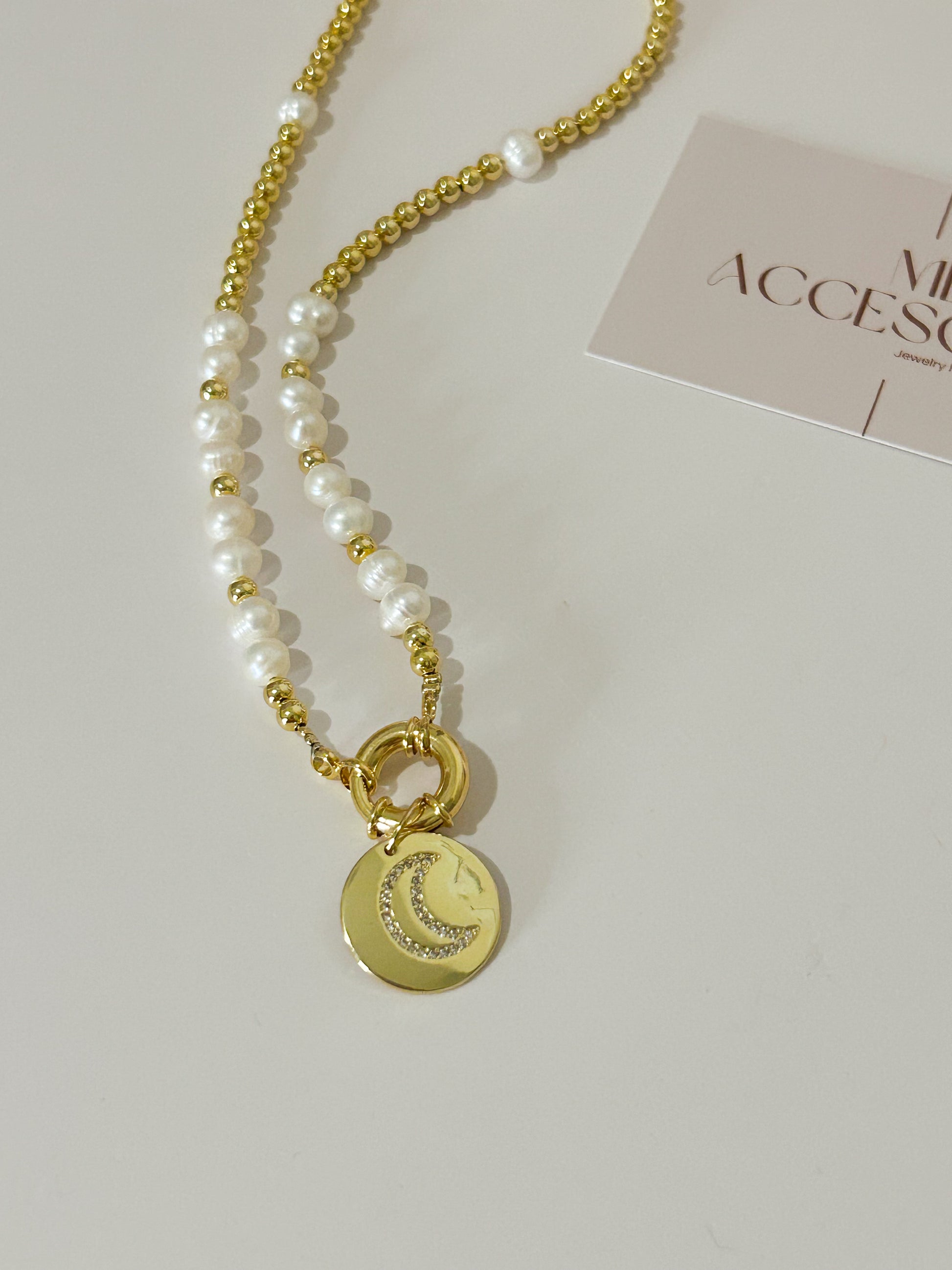 Elegant, meaningful, and timeless — the Moonlit Pearl Necklace combines freshwater pearls with 18K gold-plated beads, finished with a sparkling crescent moon medallion. Perfect for adding a touch of mystic charm to your everyday style or gifting to someone special.