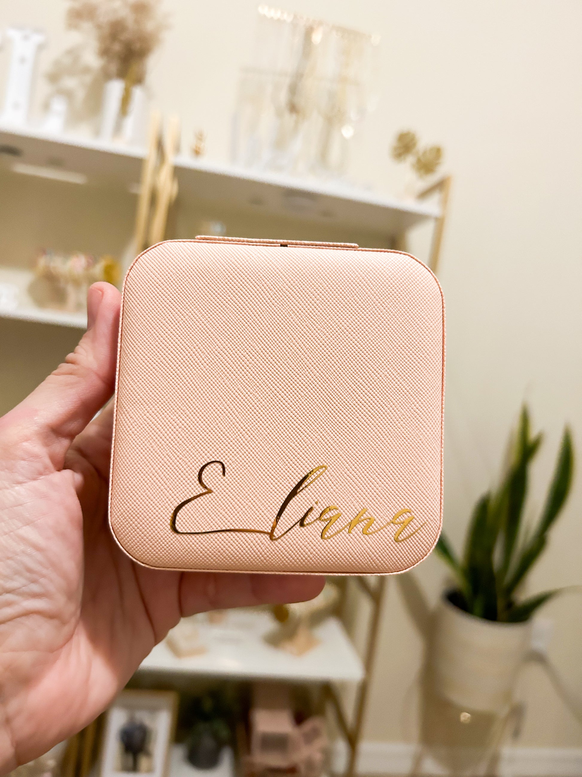 Keep your favorite accessories safe and organized with our Personalized Jewelry Box. A soft, elegant, and compact case in a delicate blush pink tone, perfect for everyday use or traveling. Personalize it with your name or a loved one’s name in golden lettering — making it the ideal gift.