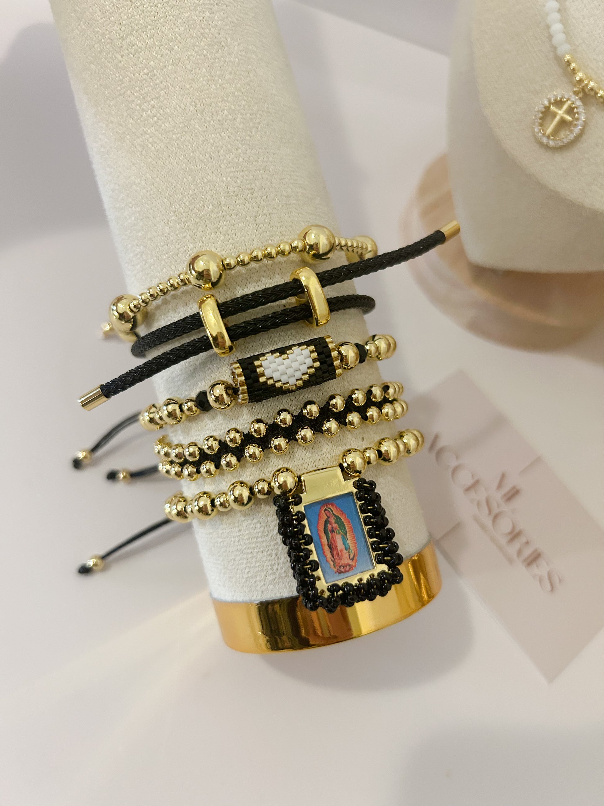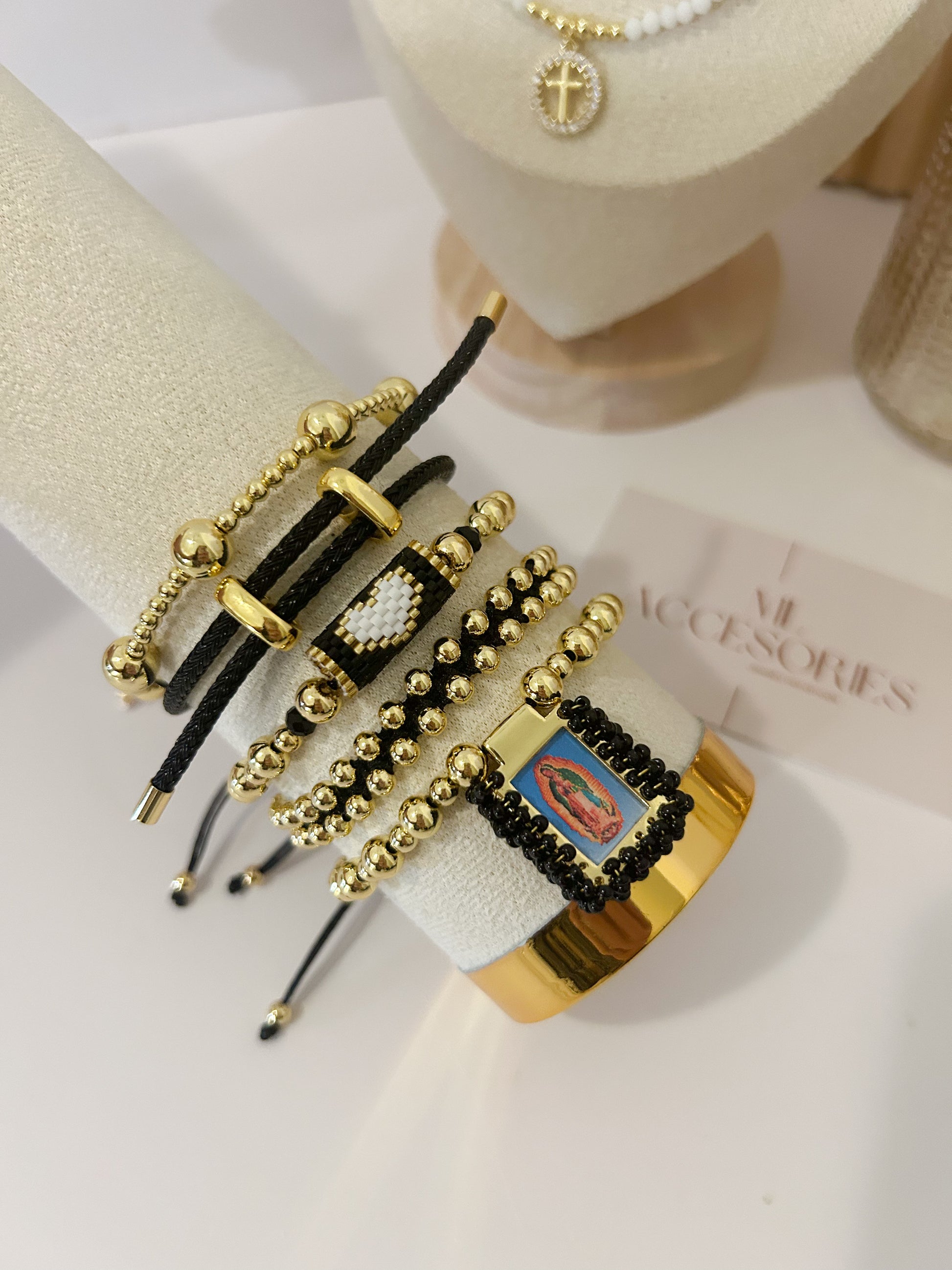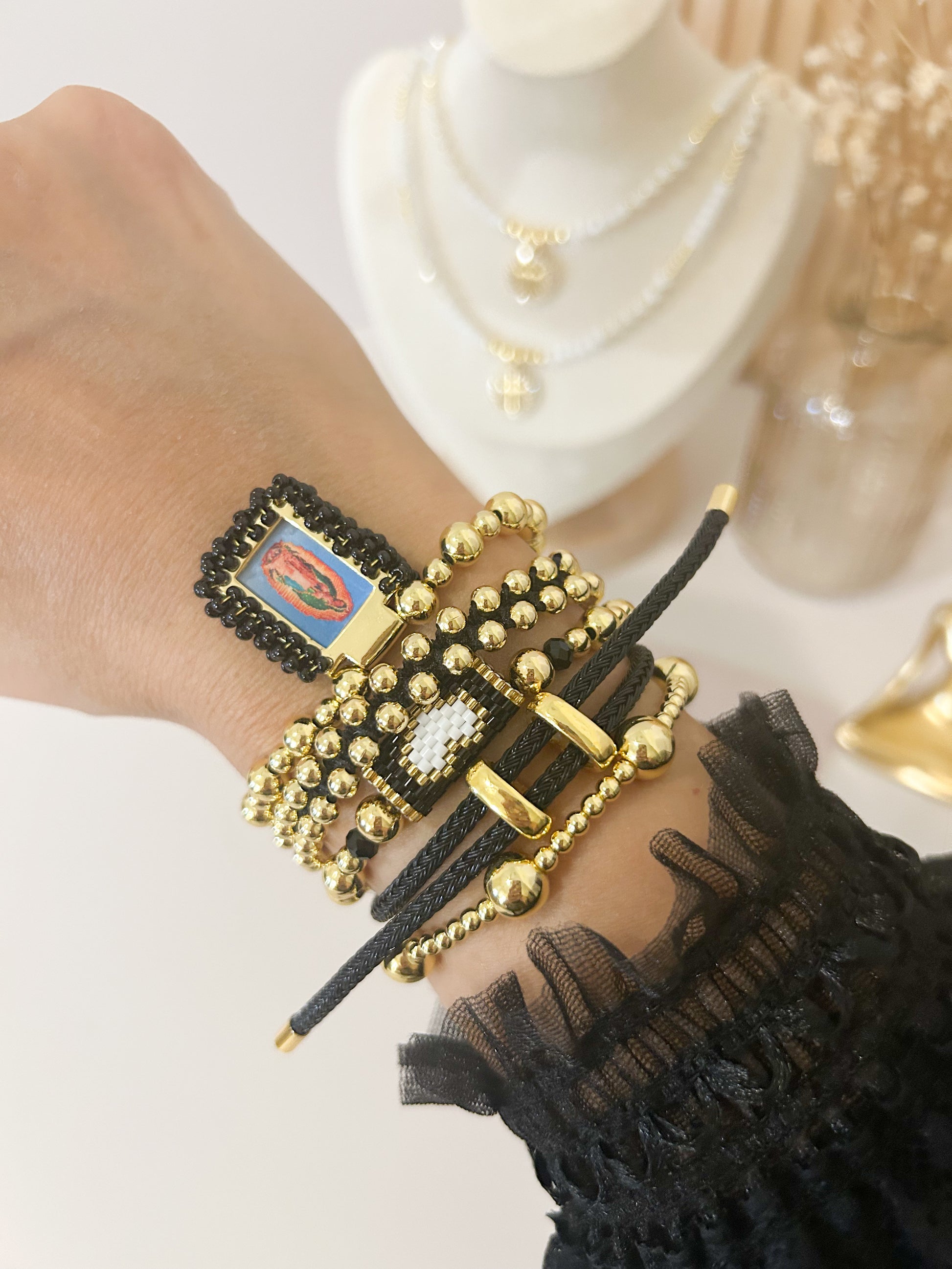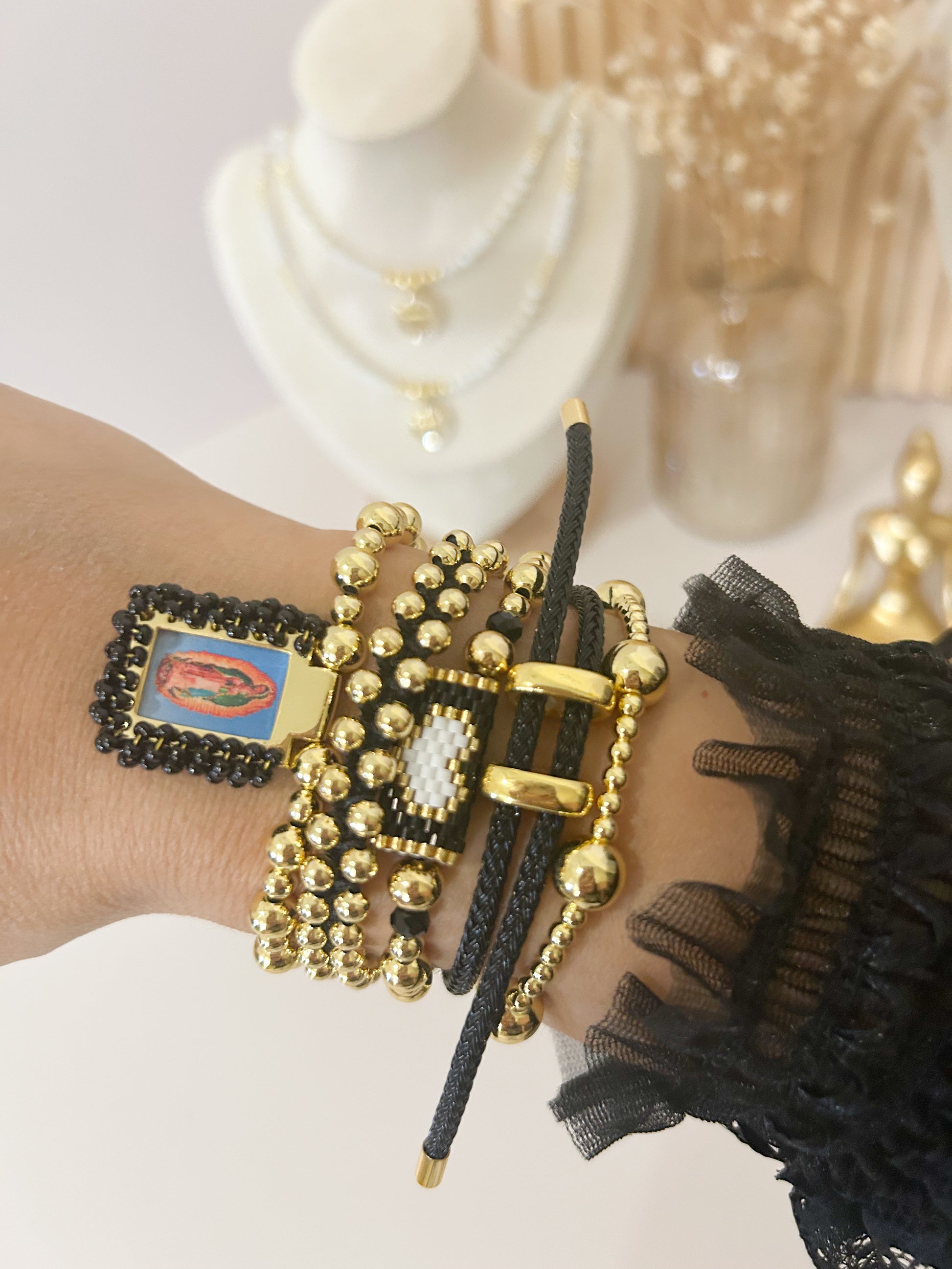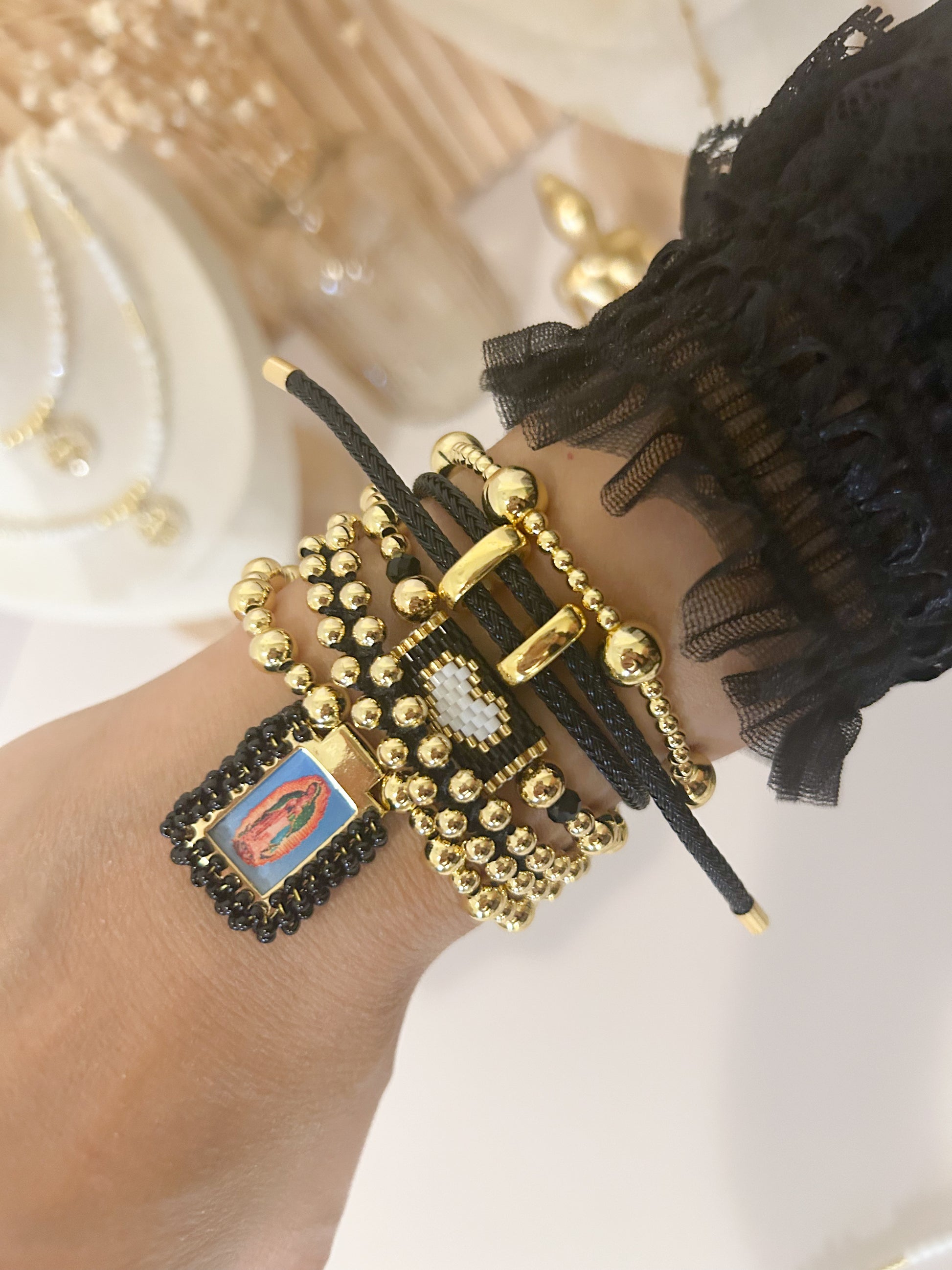 The Pure Set is a bold and meaningful bracelet stack that fuses golden shine, gold energy, and sacred symbolism. The highlight: a handwoven Sacred Heart beaded bracelet, representing love, strength, and divine protection.
