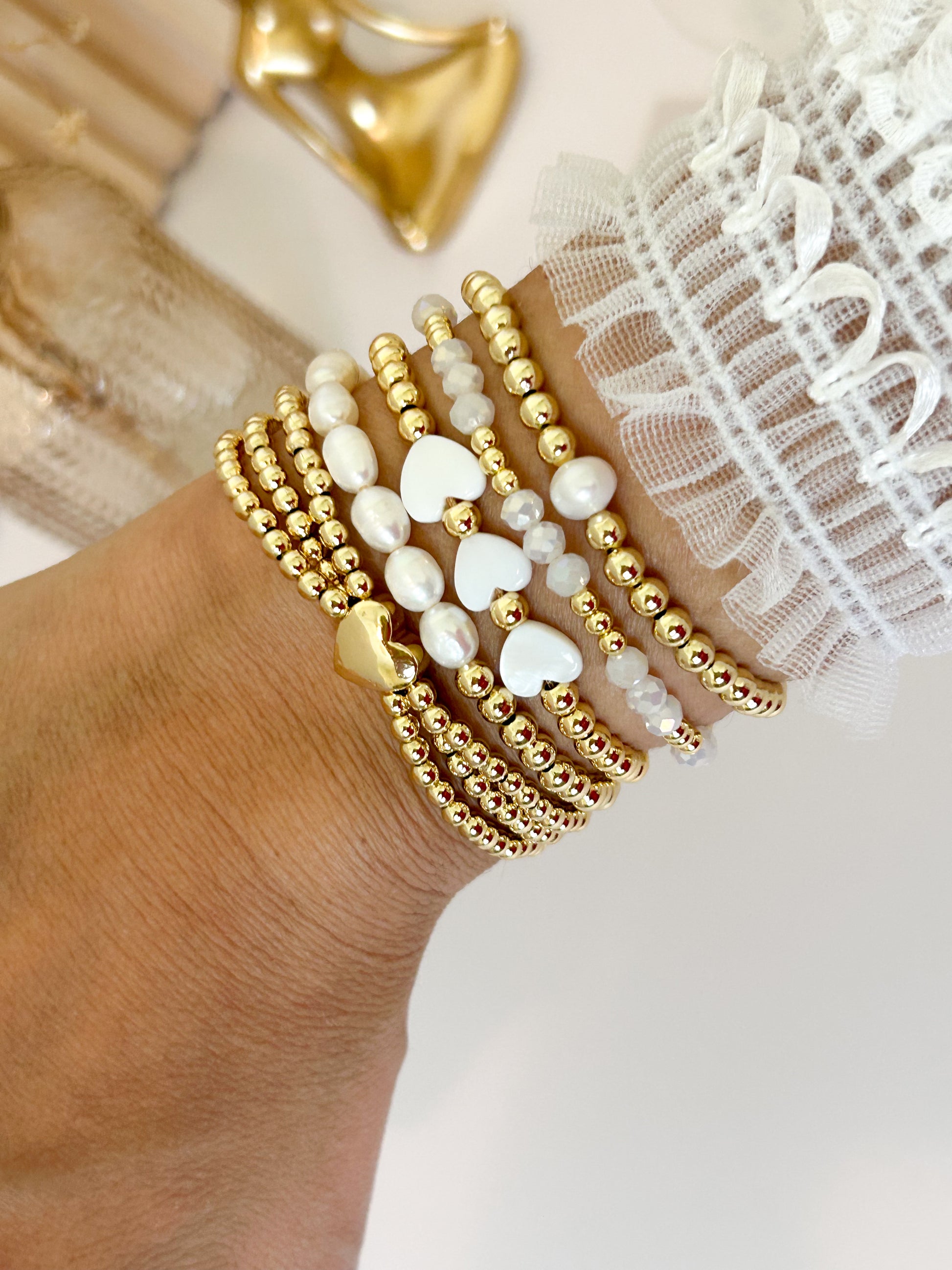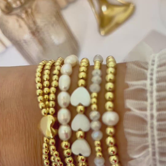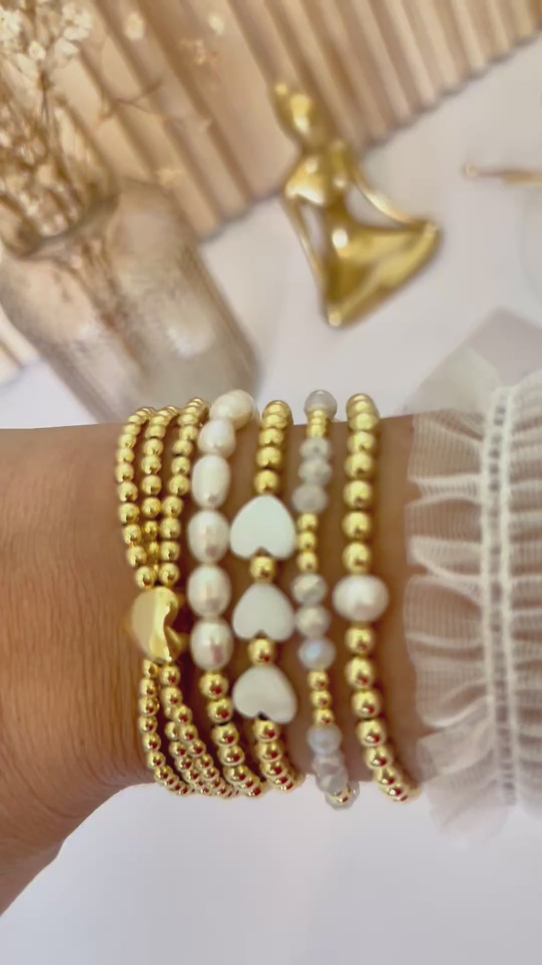 - Materials: 18k gold-plated copper beads, freshwater pearls, white acrylic hearts, and elastic cord