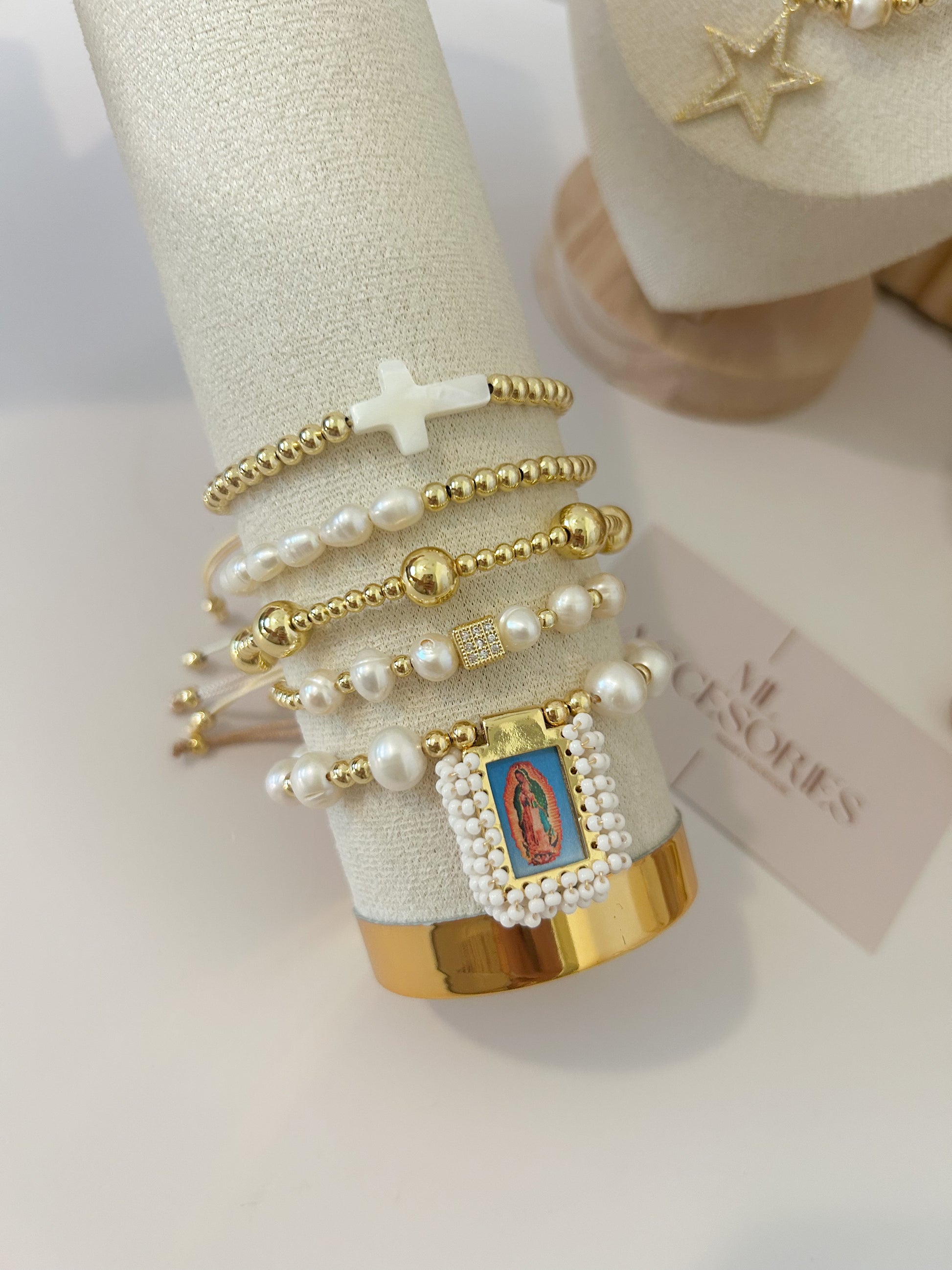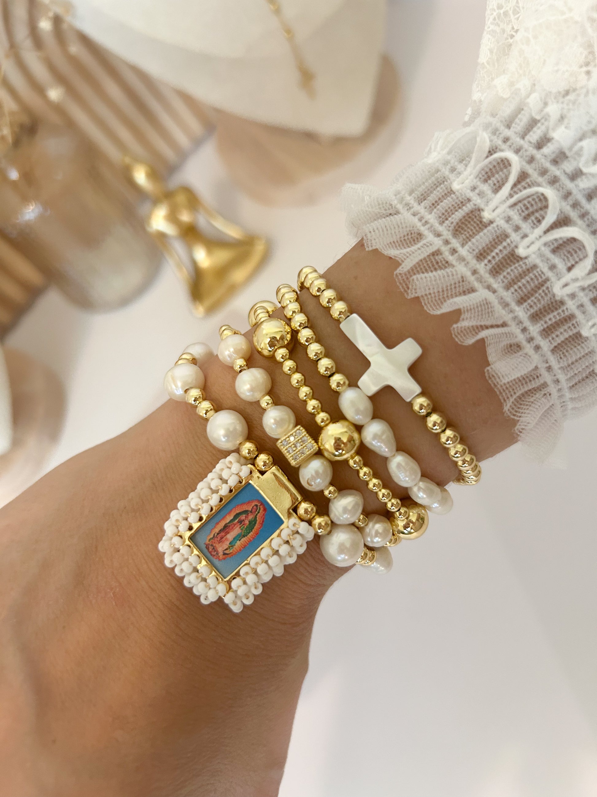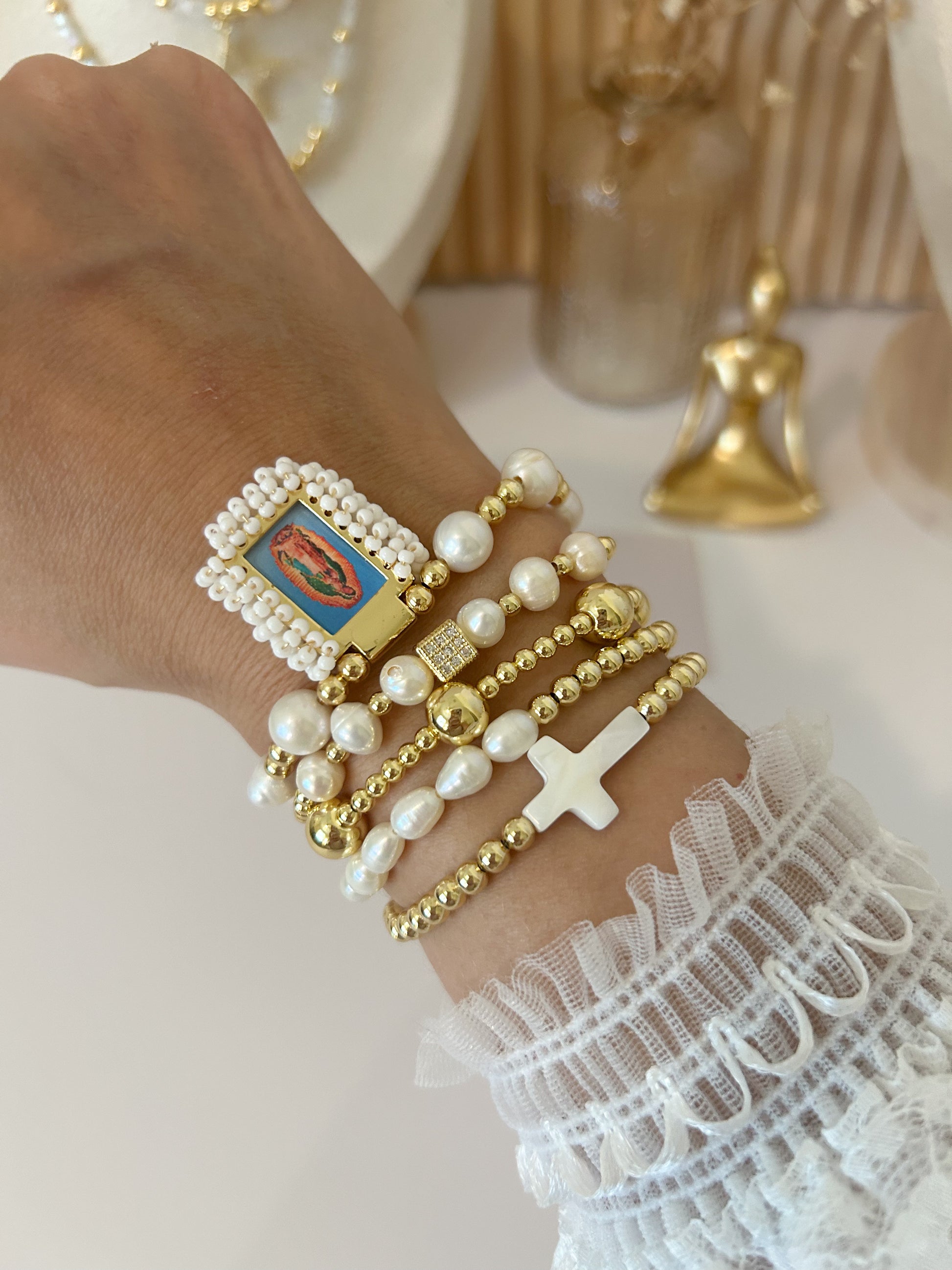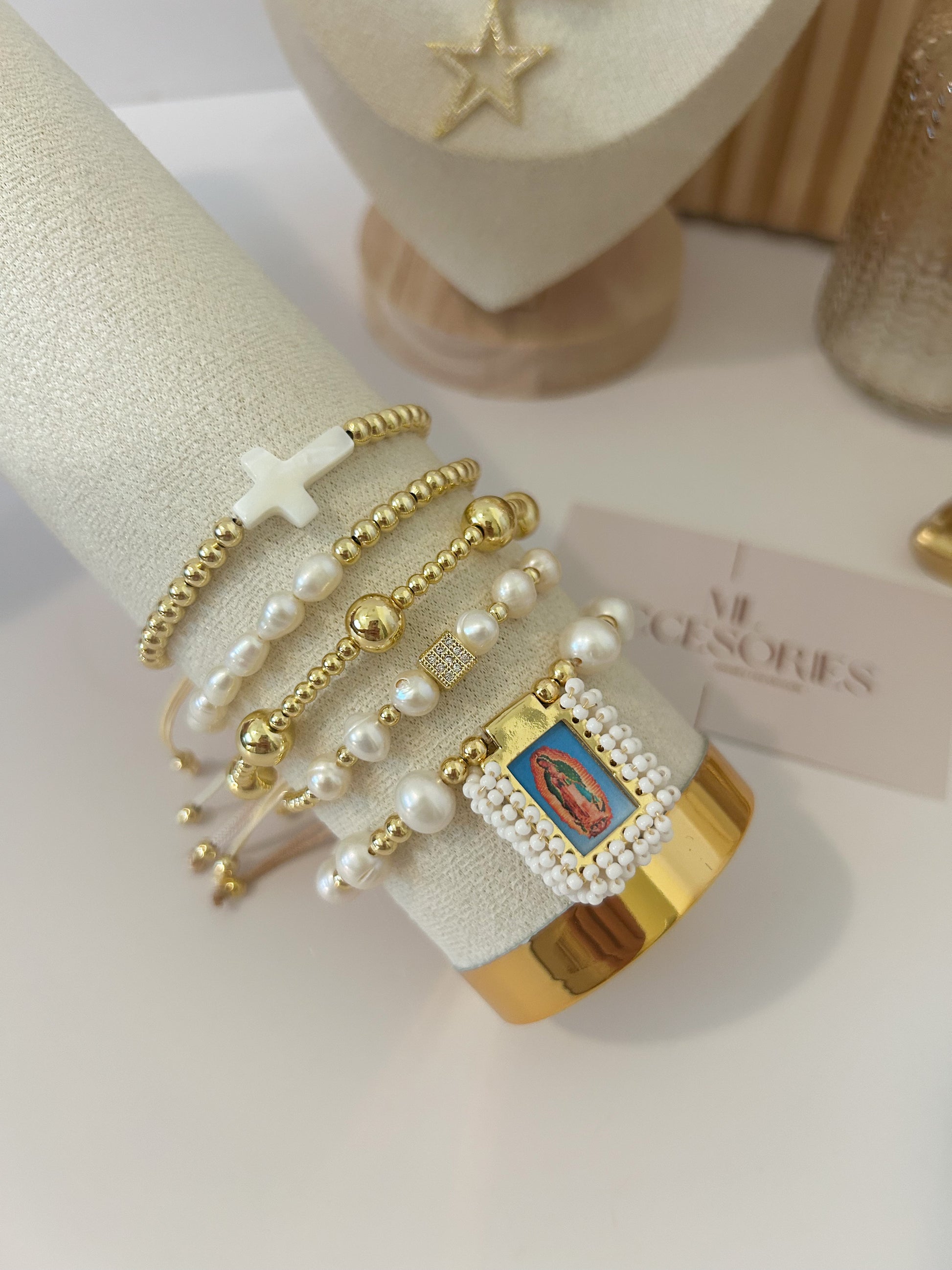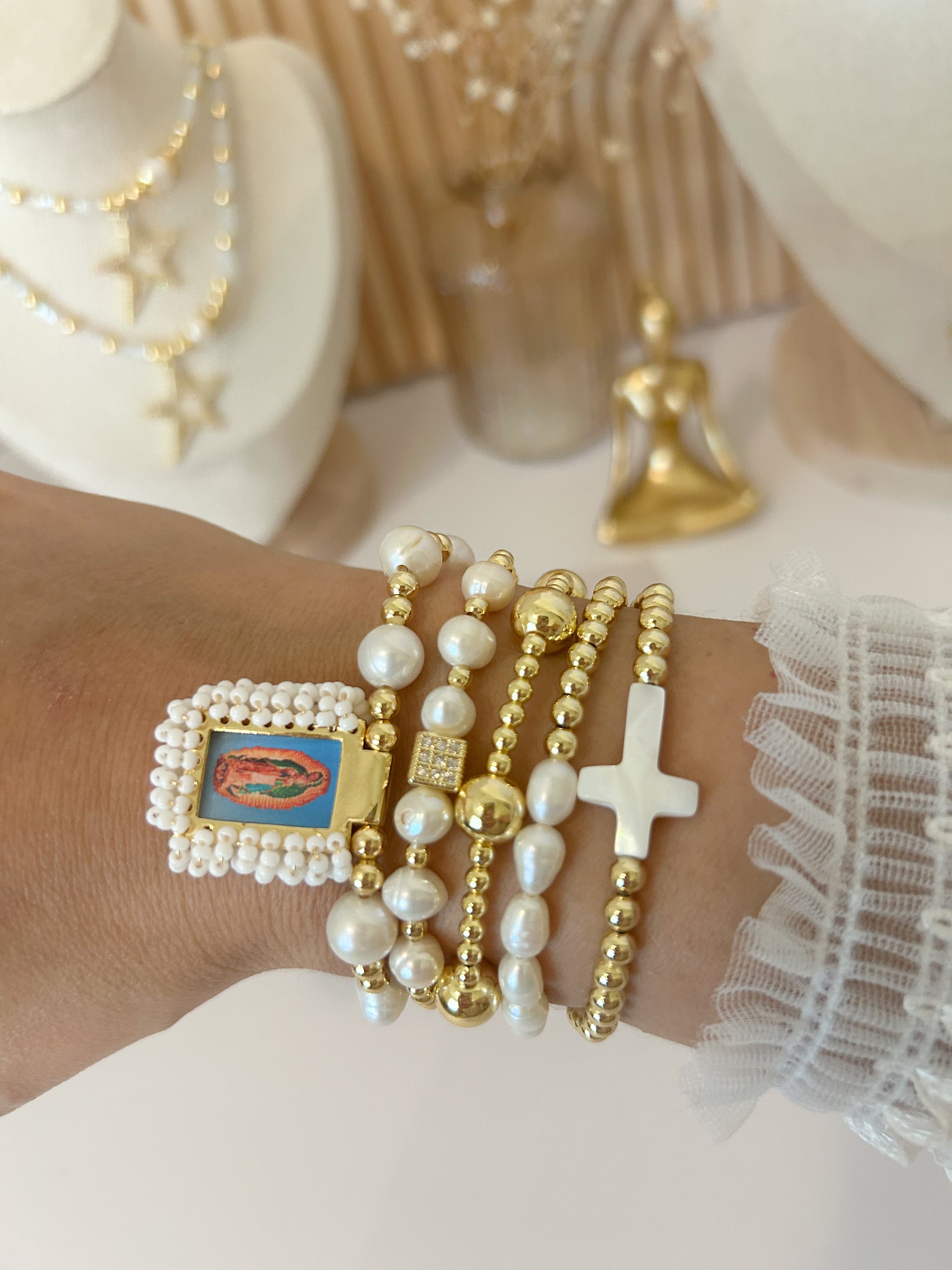 A radiant mix of elegance and faith. Pureza Set combines the protective energy of pearls with golden accents and iconic charms, including a delicate cross and a stunning image of Our Lady of Guadalupe. This stack is a reminder of grace, beauty, and divine protection, designed to be worn with confidence and purpose.