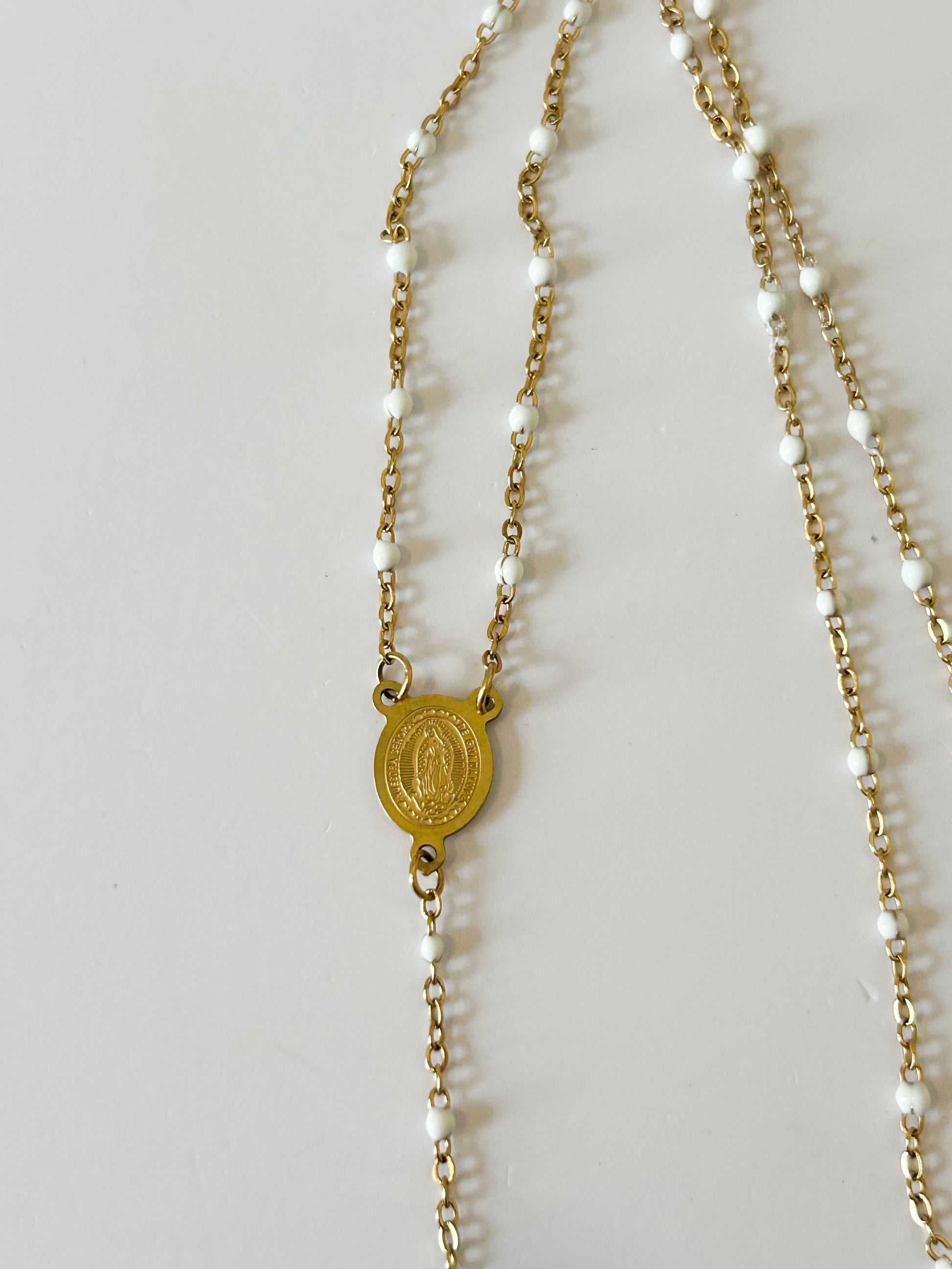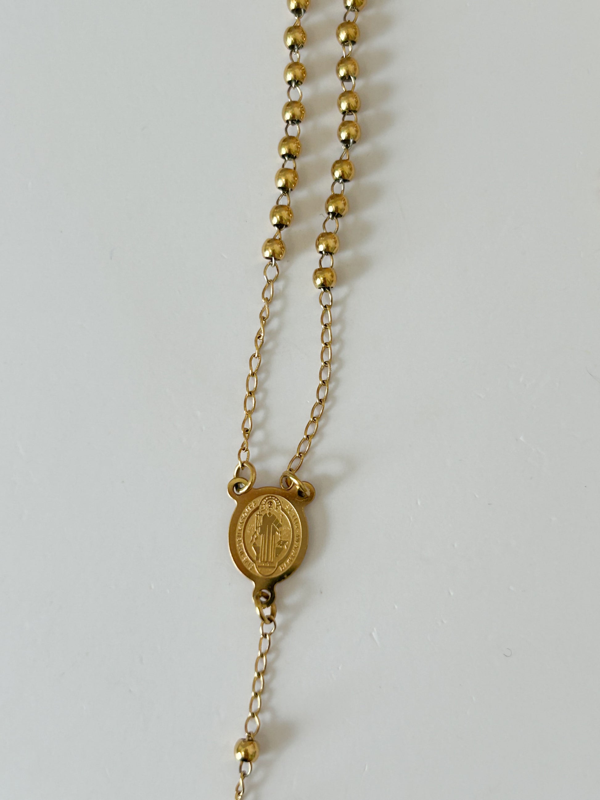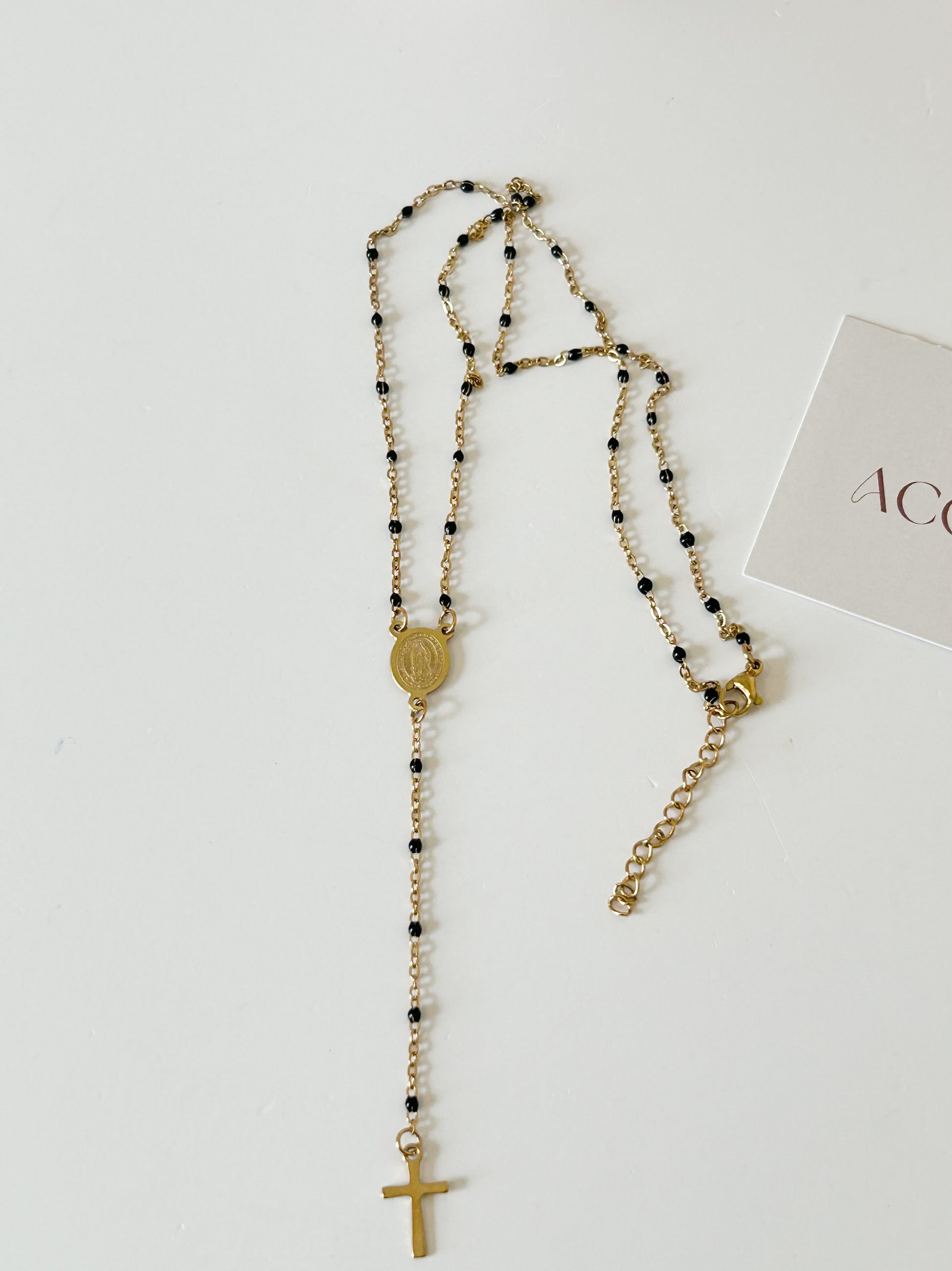 The Rosario Necklace is a timeless piece of faith and elegance. Handmade with a delicate chain and adorned with a central medallion and cross, it symbolizes protection, devotion, and style. Available in three variations, each design carries a unique charm while maintaining its classic rosary essence.