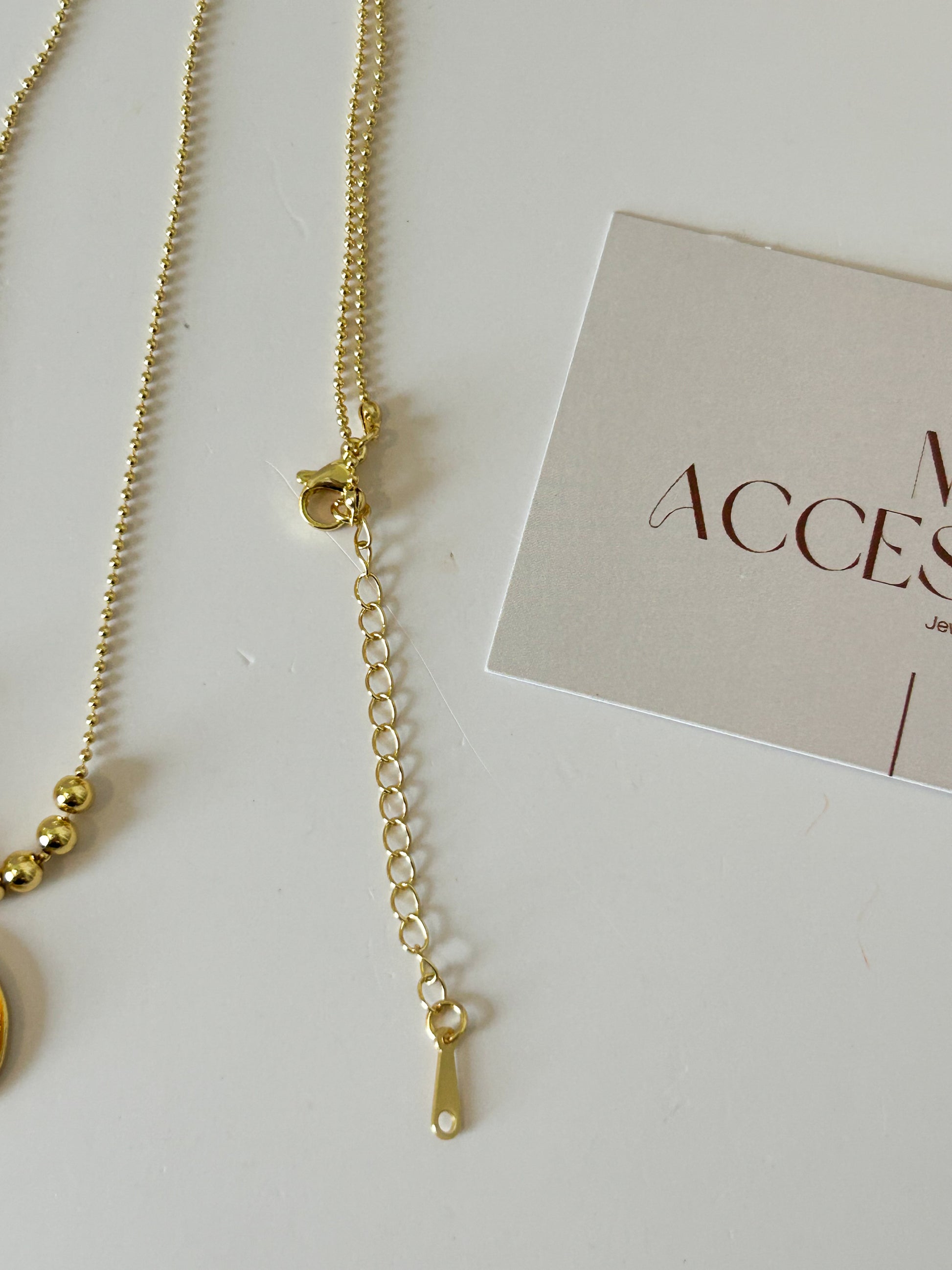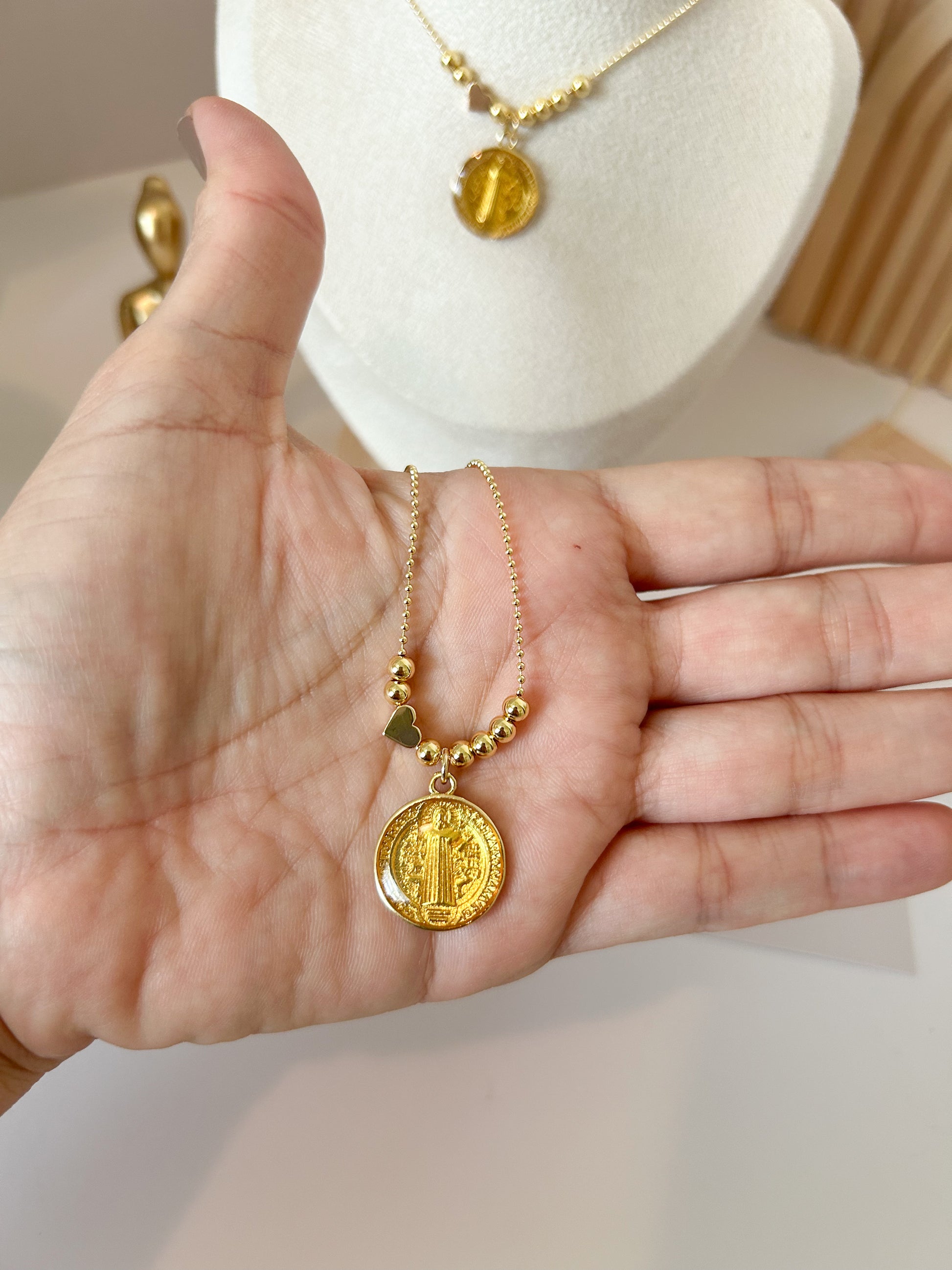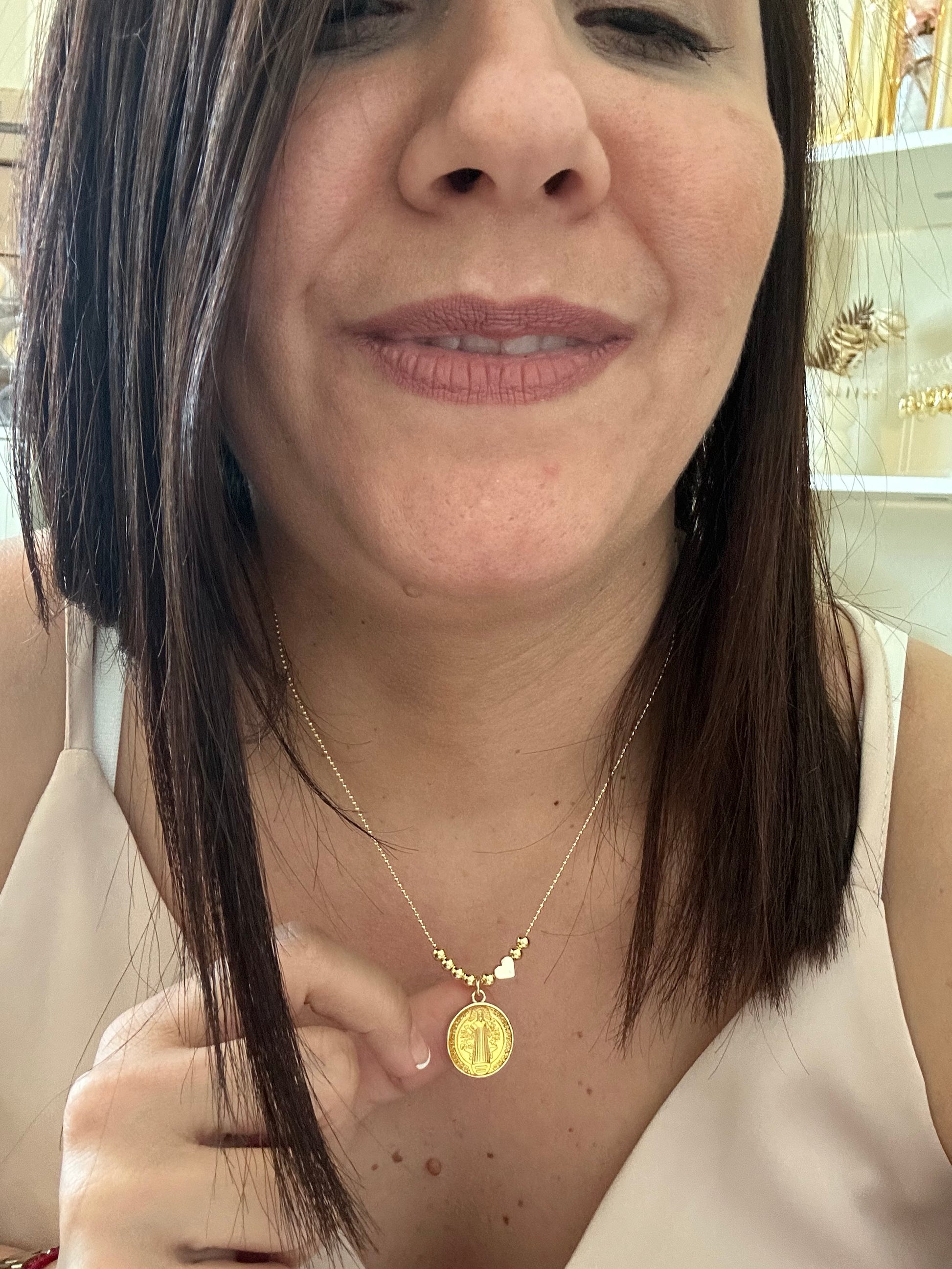 A meaningful necklace featuring a gold-plated Saint Benedict, symbolizing faith, love, and protection. Designed with small beads and a heart charm for a delicate yet powerful touch.