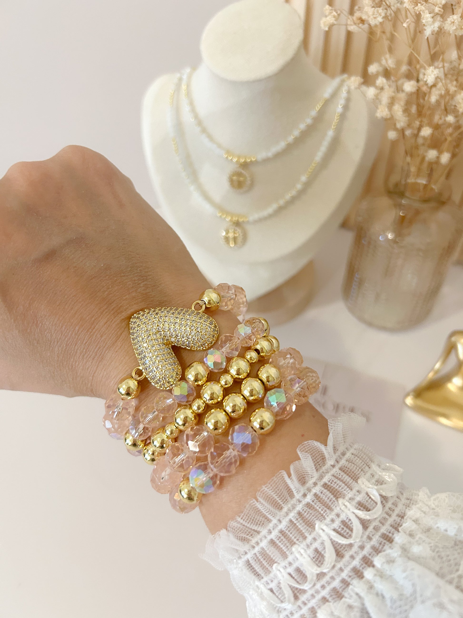 Timeless, bold, and irresistibly chic. Crystal Heart Clear, Brown and Pink bracelet set combines deep black faceted crystals with luxurious 18K gold-plated copper beads, finished with a sparkling crystal heart charm that steals the spotlight. A must-have for your most powerful looks.