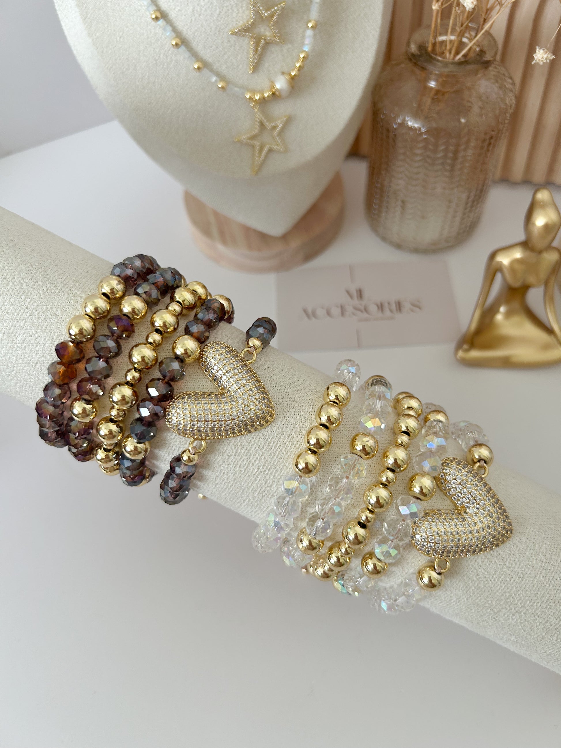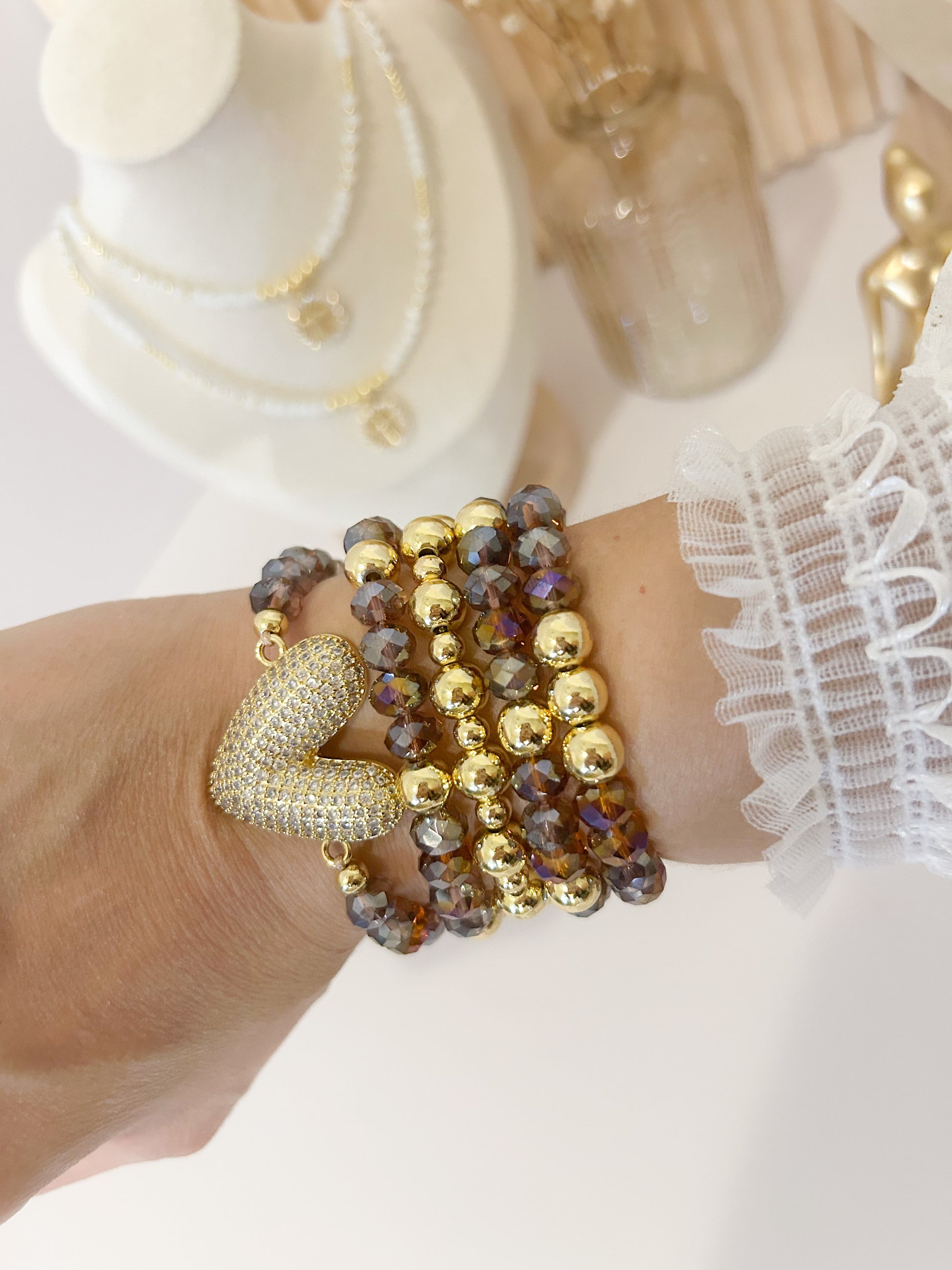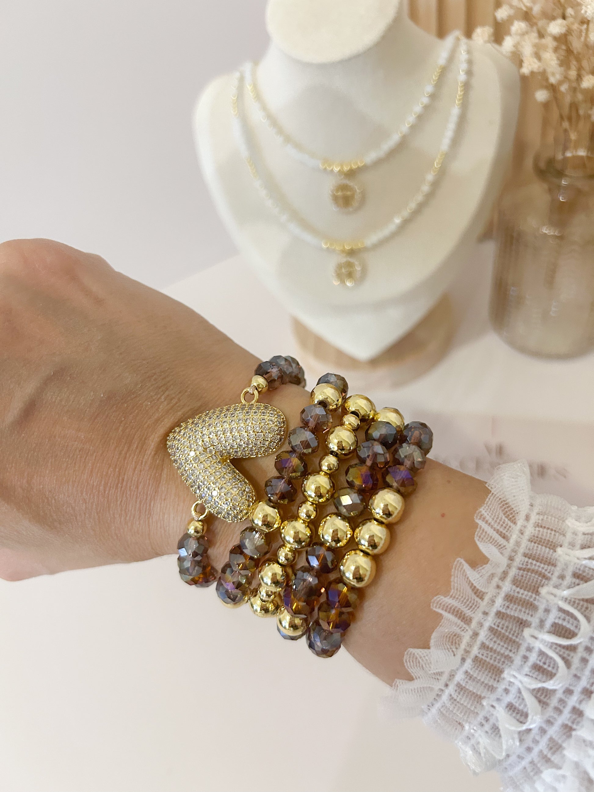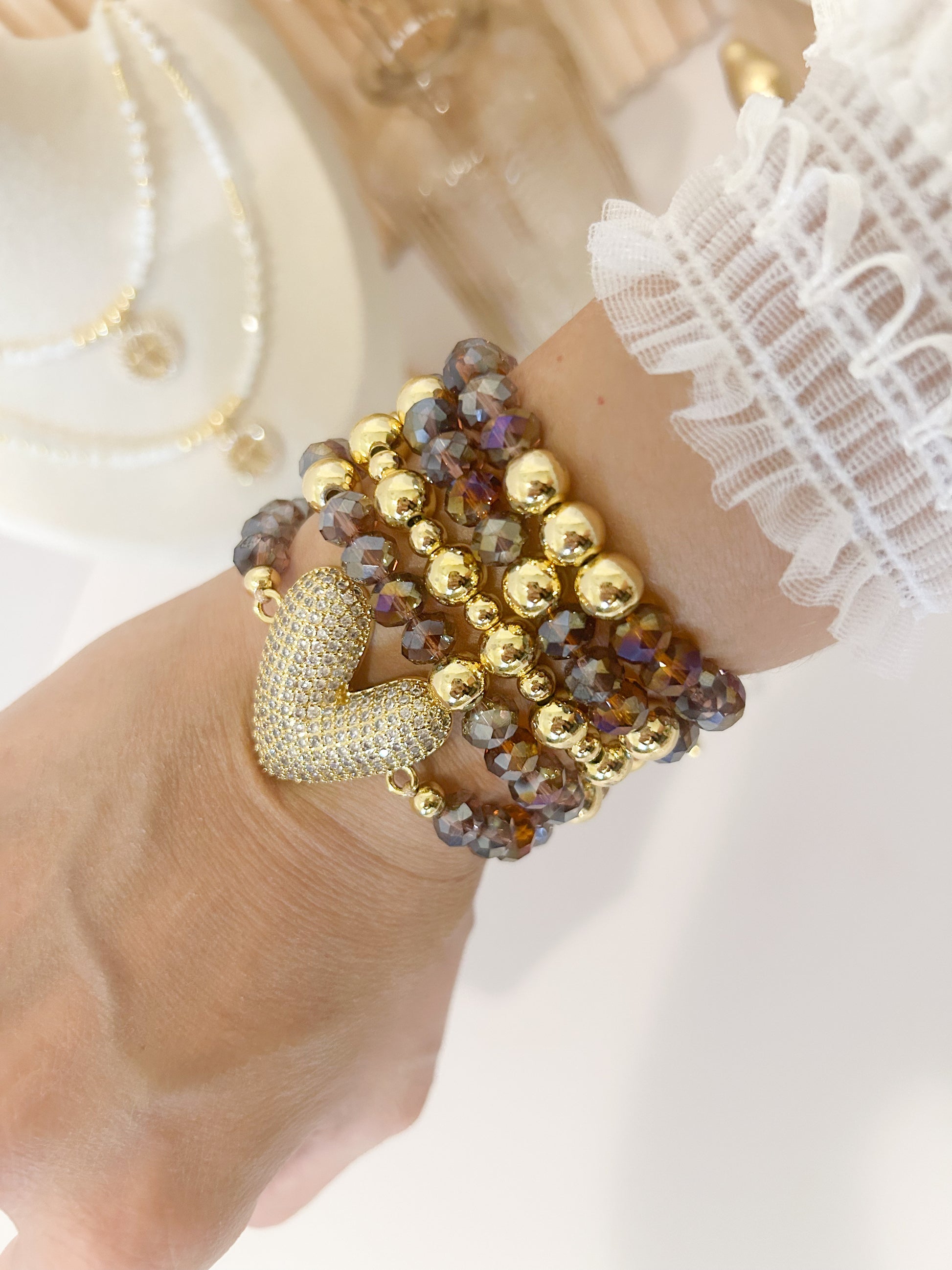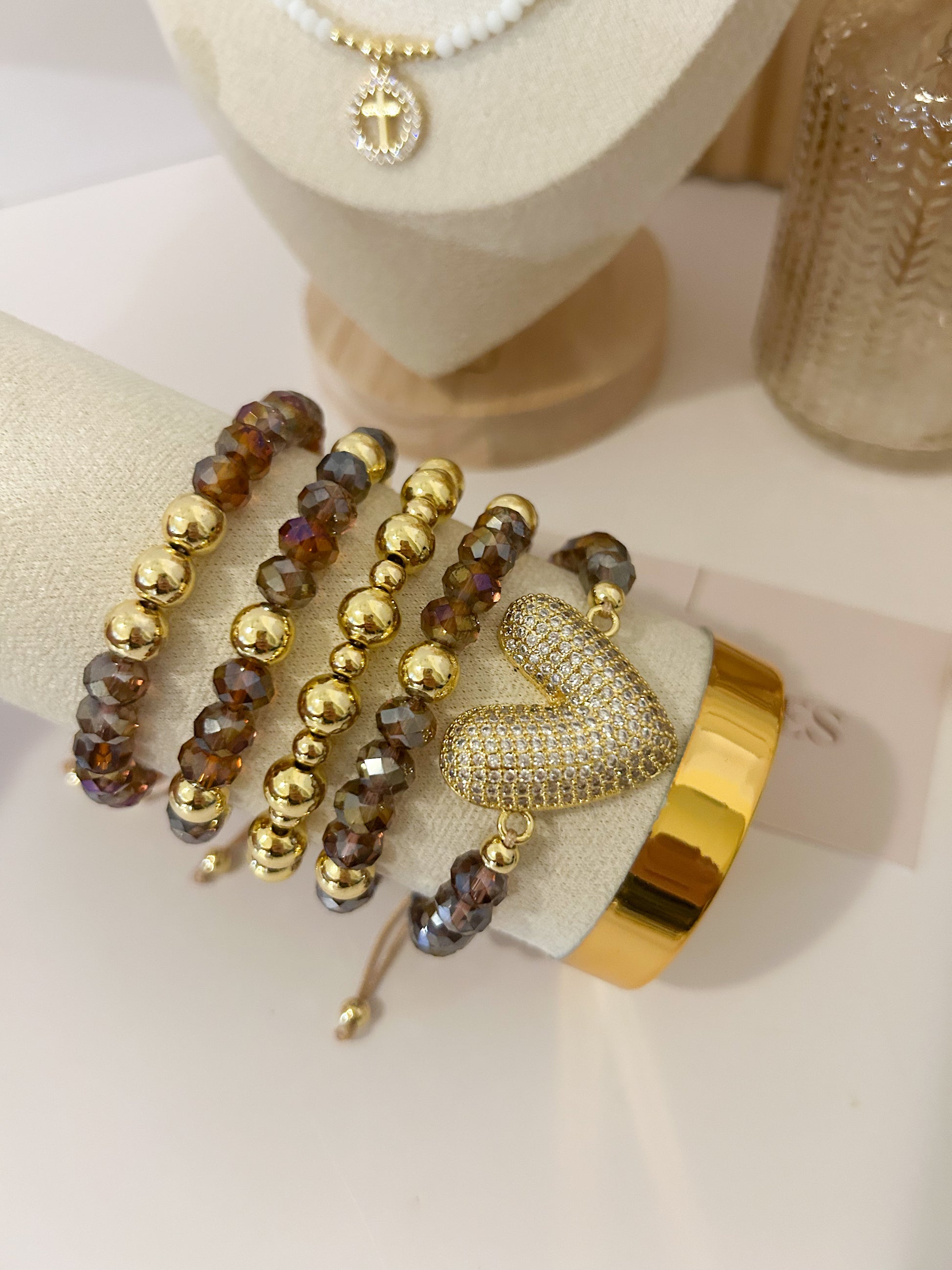 Timeless, bold, and irresistibly chic. The Sophie Clear and Brown bracelet set combines deep black faceted crystals with luxurious 18K gold-plated copper beads, finished with a sparkling crystal heart charm that steals the spotlight. A must-have for your most powerful looks.