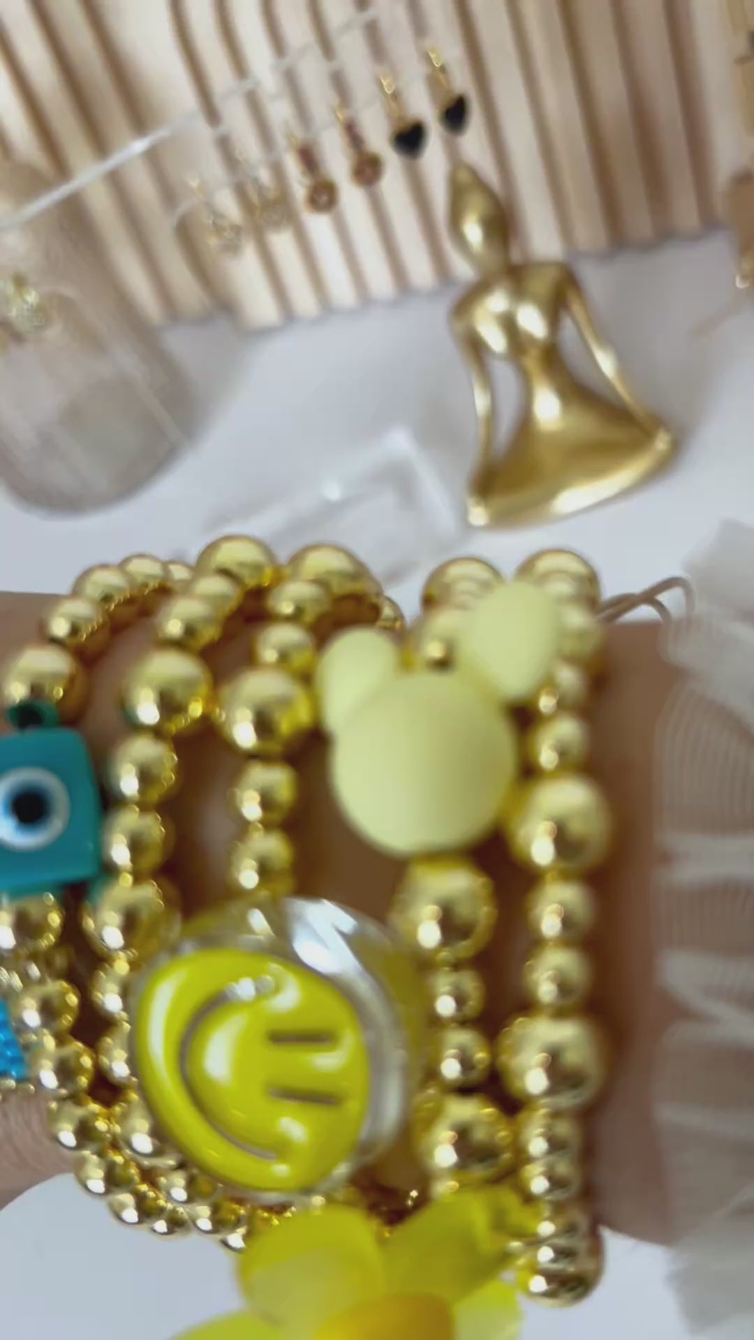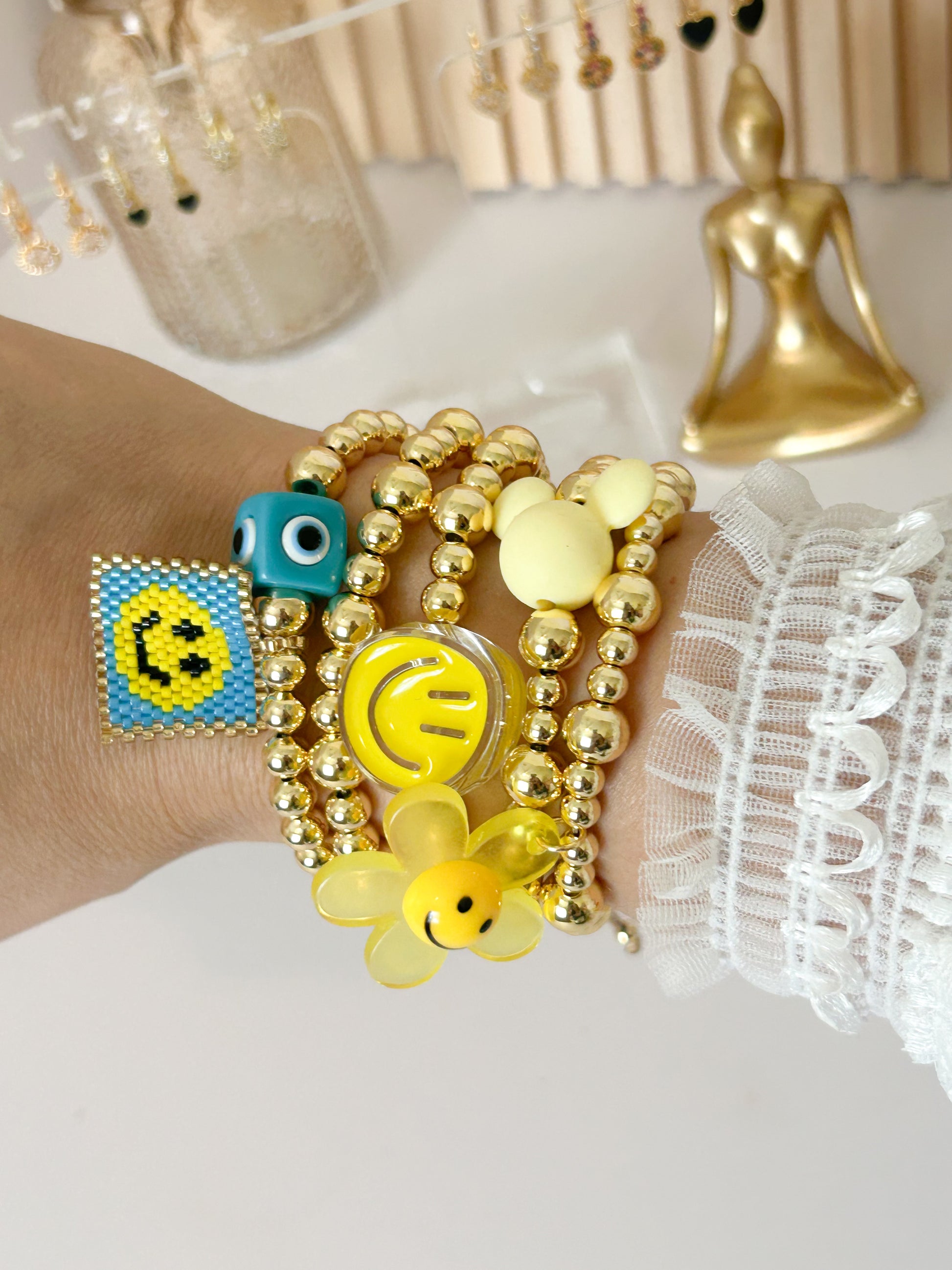 The Sunny Vibes Set combines gold-plated beads with cheerful yellow and turquoise details — smiley charms, playful shapes, and an evil eye for protection.