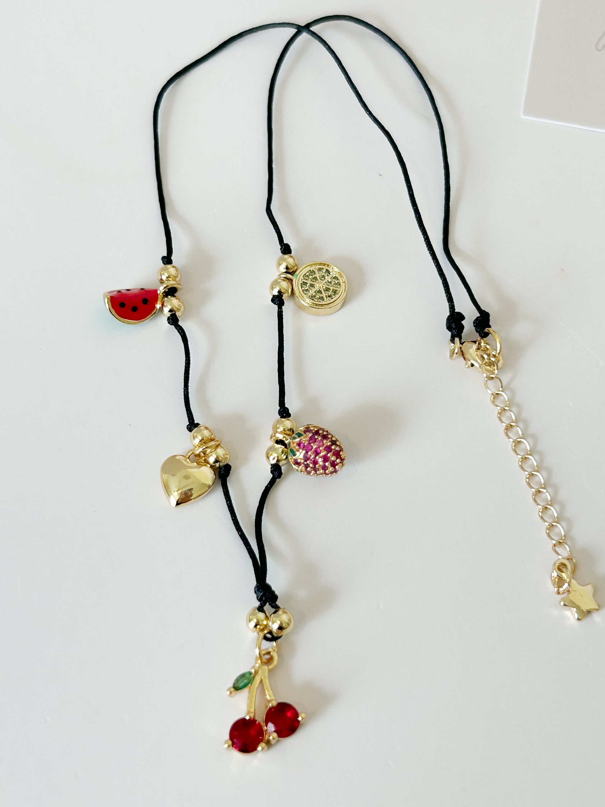 A playful and fresh necklace, perfect to add a juicy twist to your style. Designed with black cord and gold-toned stainless steel accents, it features fun fruit-inspired charms full of personality: