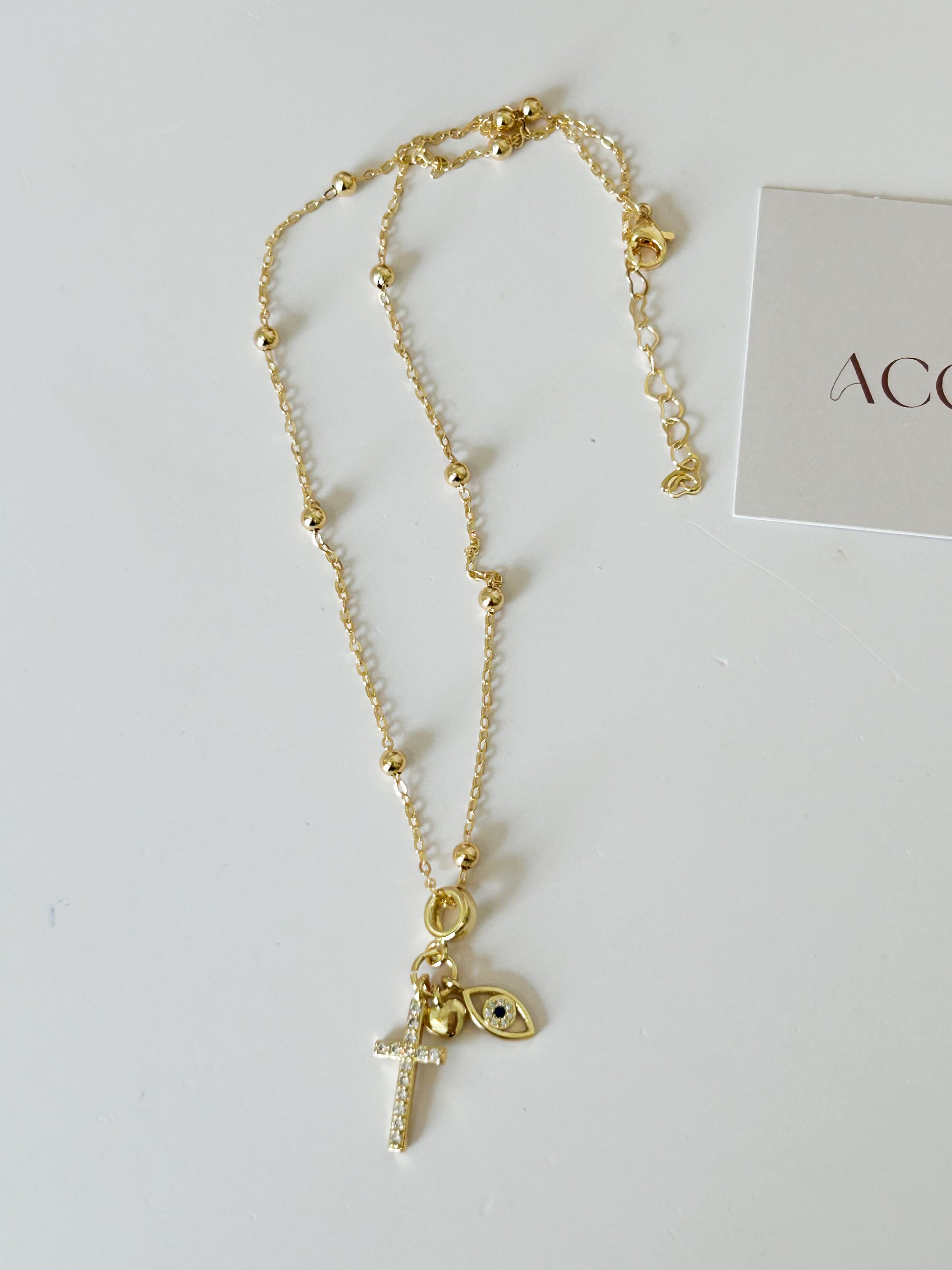 - Charms: Pavé cross, golden heart, and evil eye charm