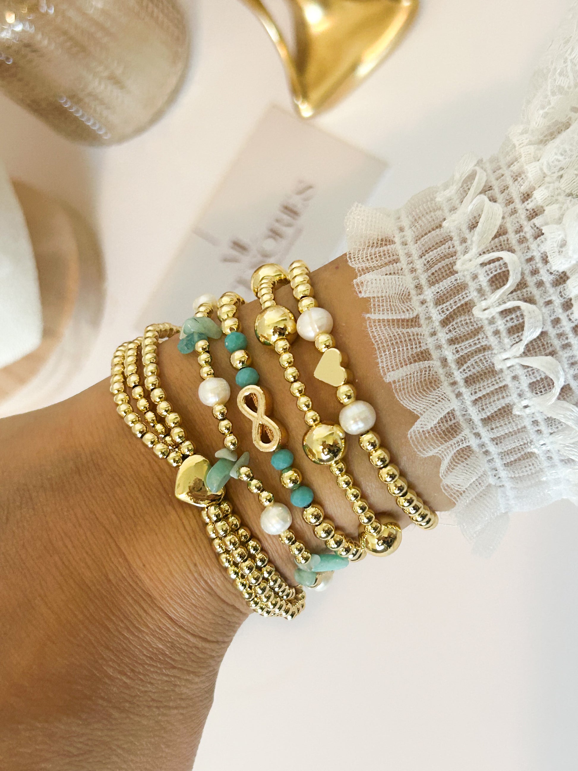 The Turquoise Energy Set is a vibrant combination of turquoise beads, pearls, and golden details. With infinity and heart charms, this stack symbolizes positivity, balance, and endless love.