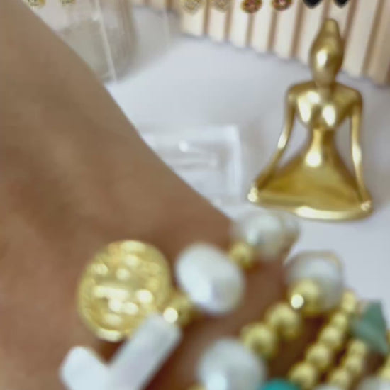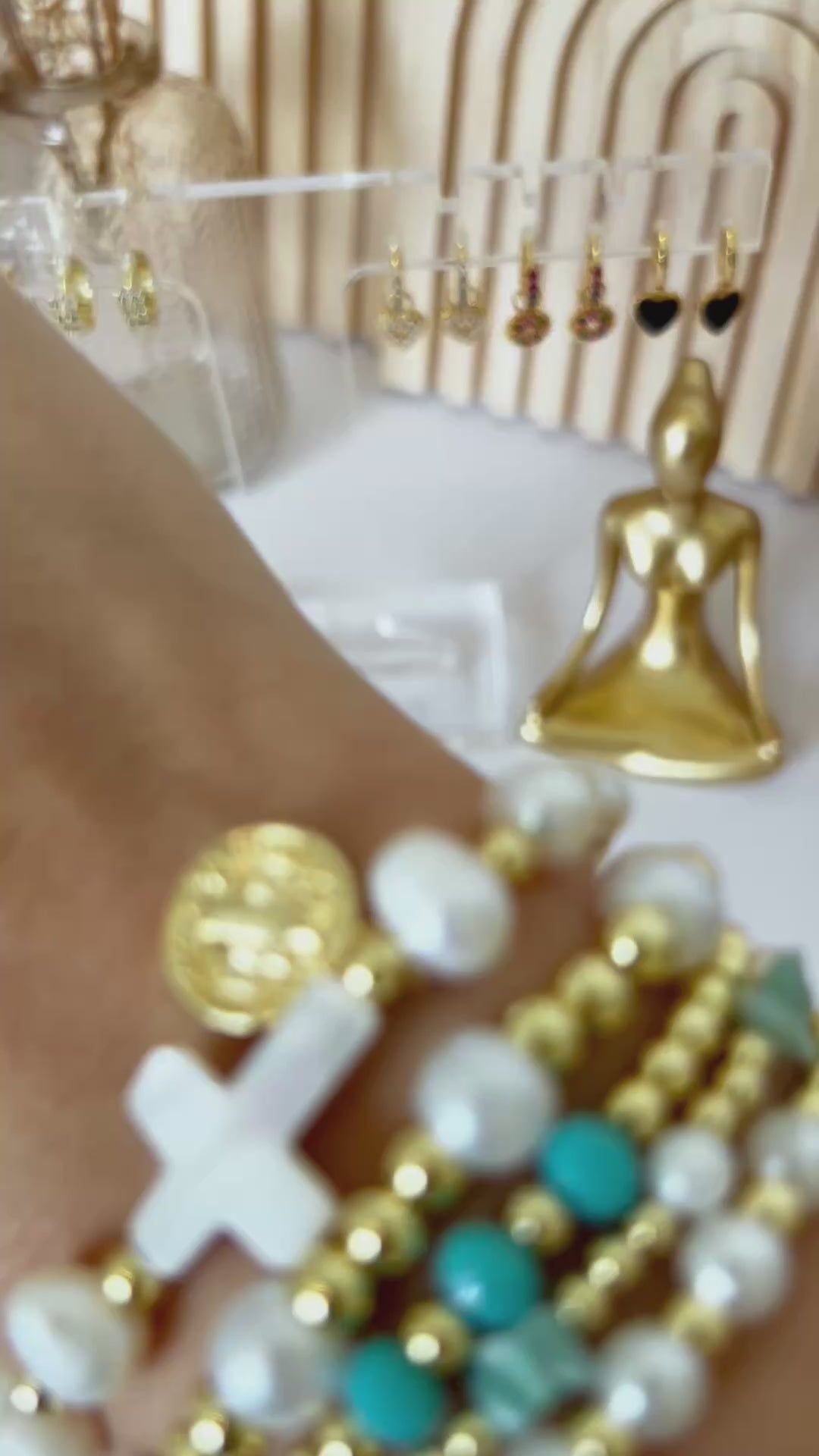 The Heaven Glow Set brings together luminous freshwater pearls, turquoise stones, and 18K gold-plated beads — finished with a mother-of-pearl cross and a golden medallion for a sacred, luxurious touch.