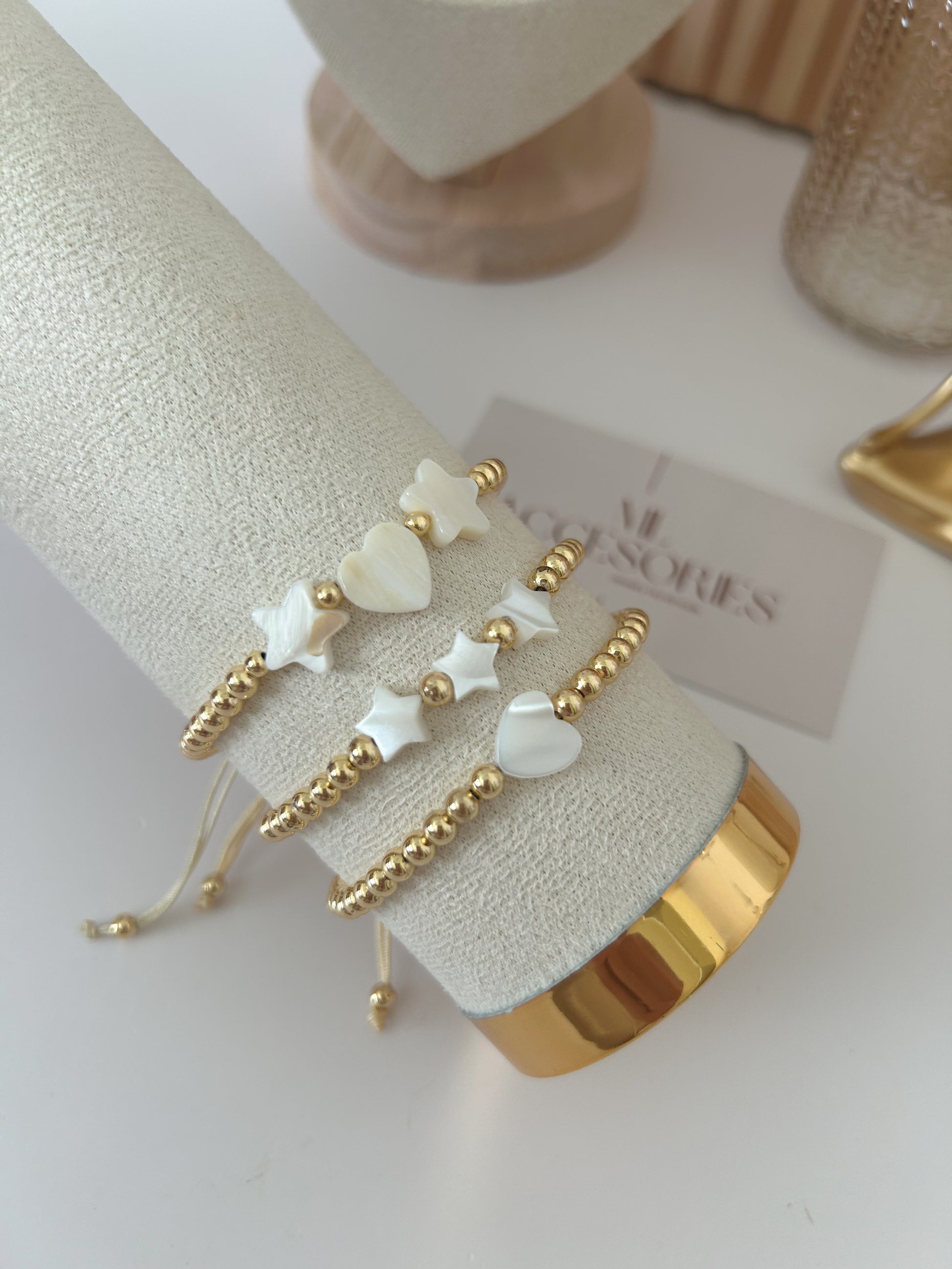 Our Olivia Bracelet is a delicate statement of love and serenity. Featuring elegant golden beads paired with either a pearly white heart or star charm, this bracelet adds a soft, feminine glow to your everyday stack. Lightweight, adjustable, and effortlessly chic — perfect for gifting or wearing solo.