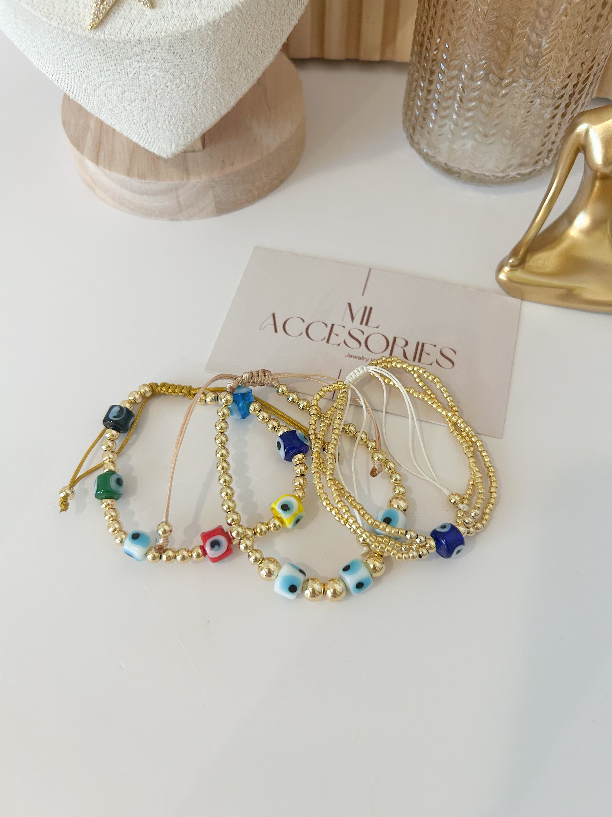 The Mila Bracelet is a vibrant and meaningful collection of adjustable bracelets designed to protect, uplift, and add color to your look. Each variation features gold-plated beads and colorful Murano-style evil eye beads for a unique touch of charm and symbolism.